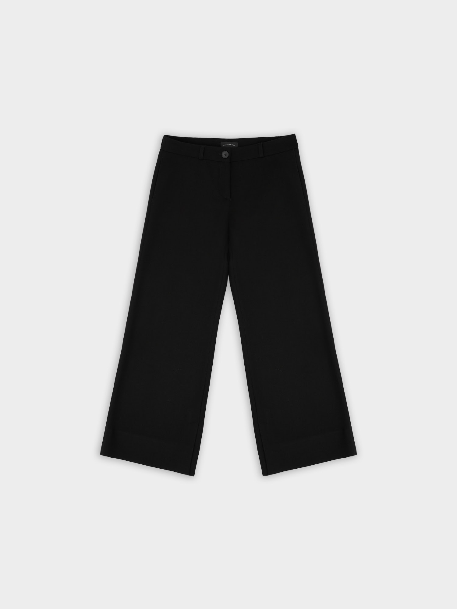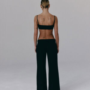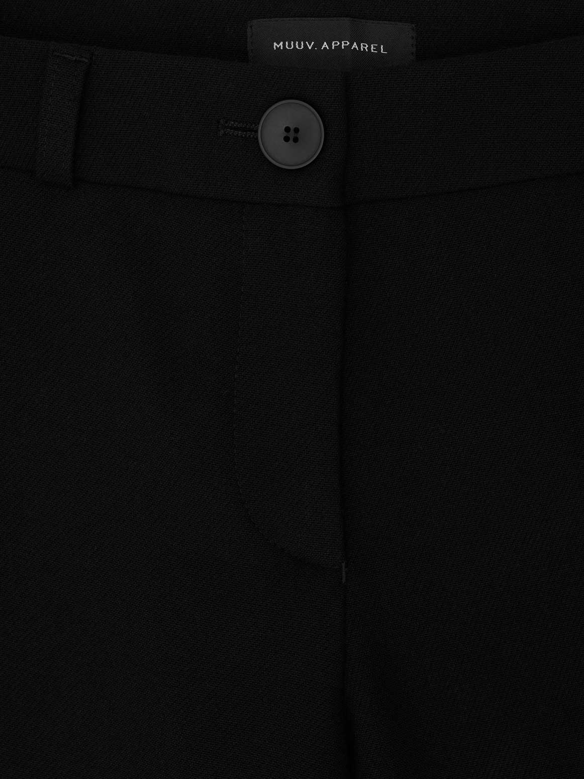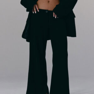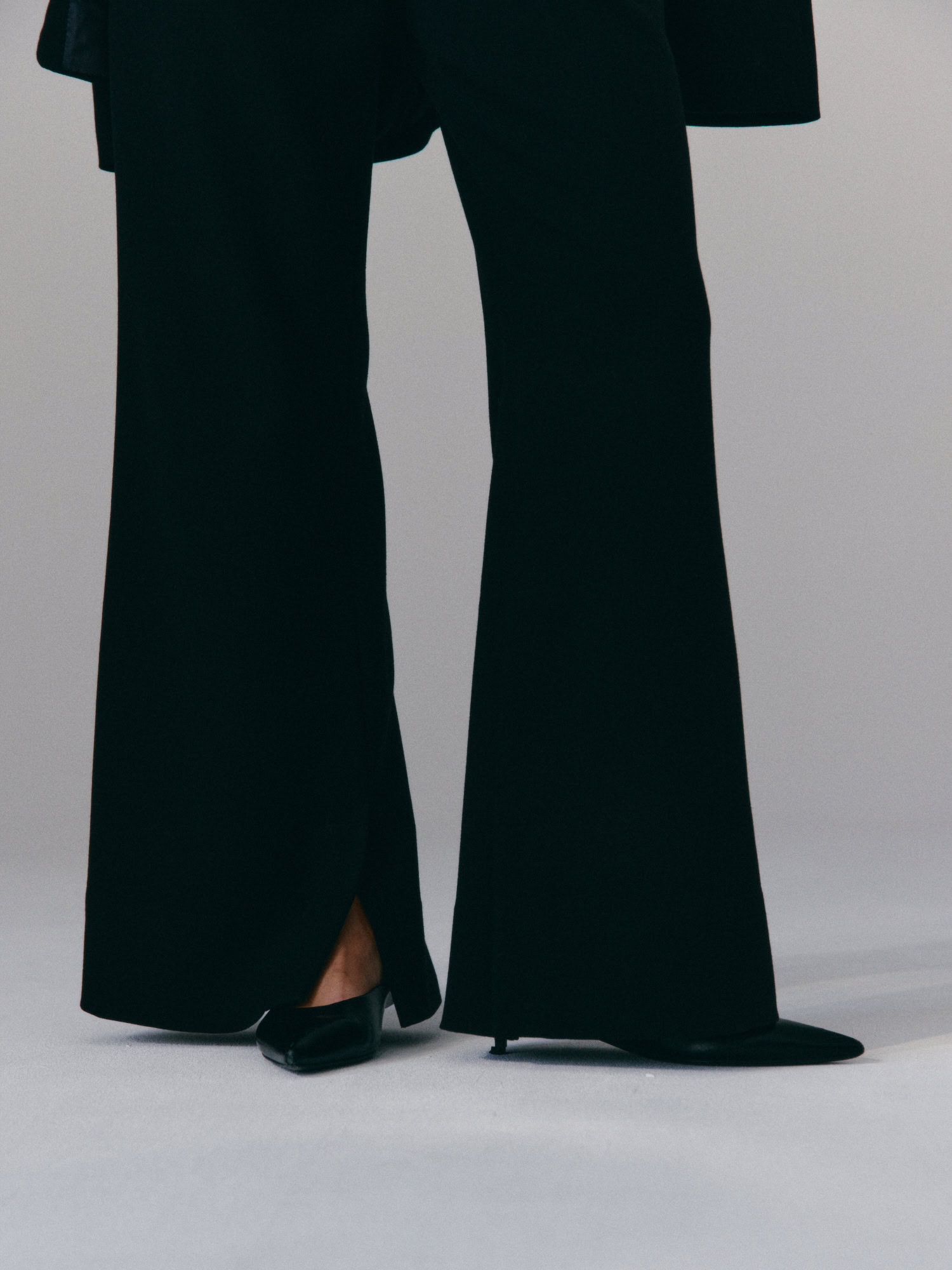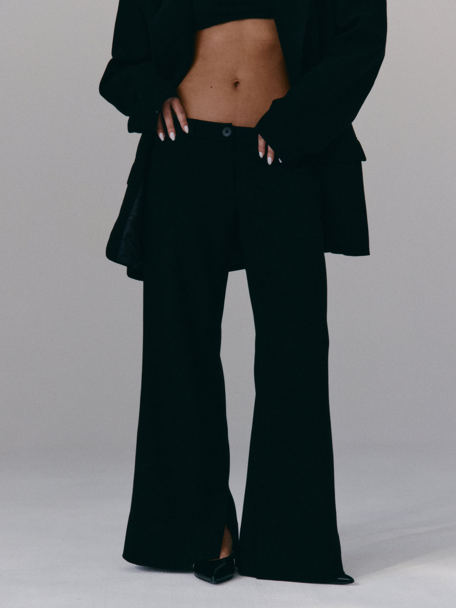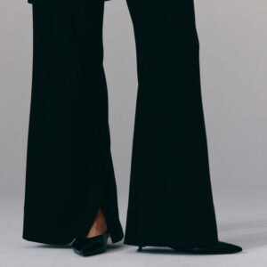 Spodnie typu flare z niskim stanem. Model posiada proste nogawki rozszerzane ku dołowi z rozcięciem. Zapiane na zamek i guzik. Idealnie sprawdzą się jako baza do każdej stylizacji, szczególnie w zestawie z marynarką lub kamizelką MAIN.