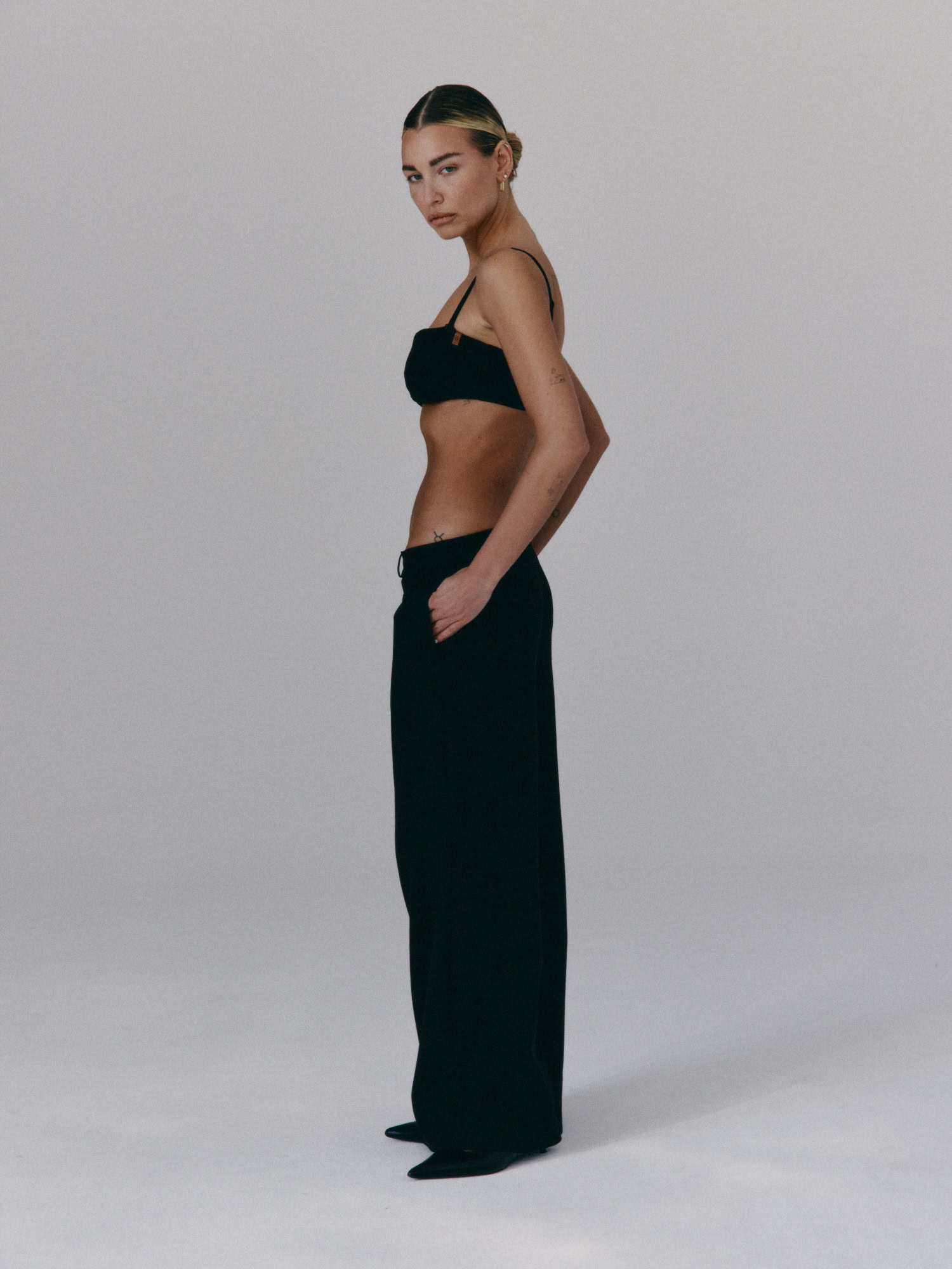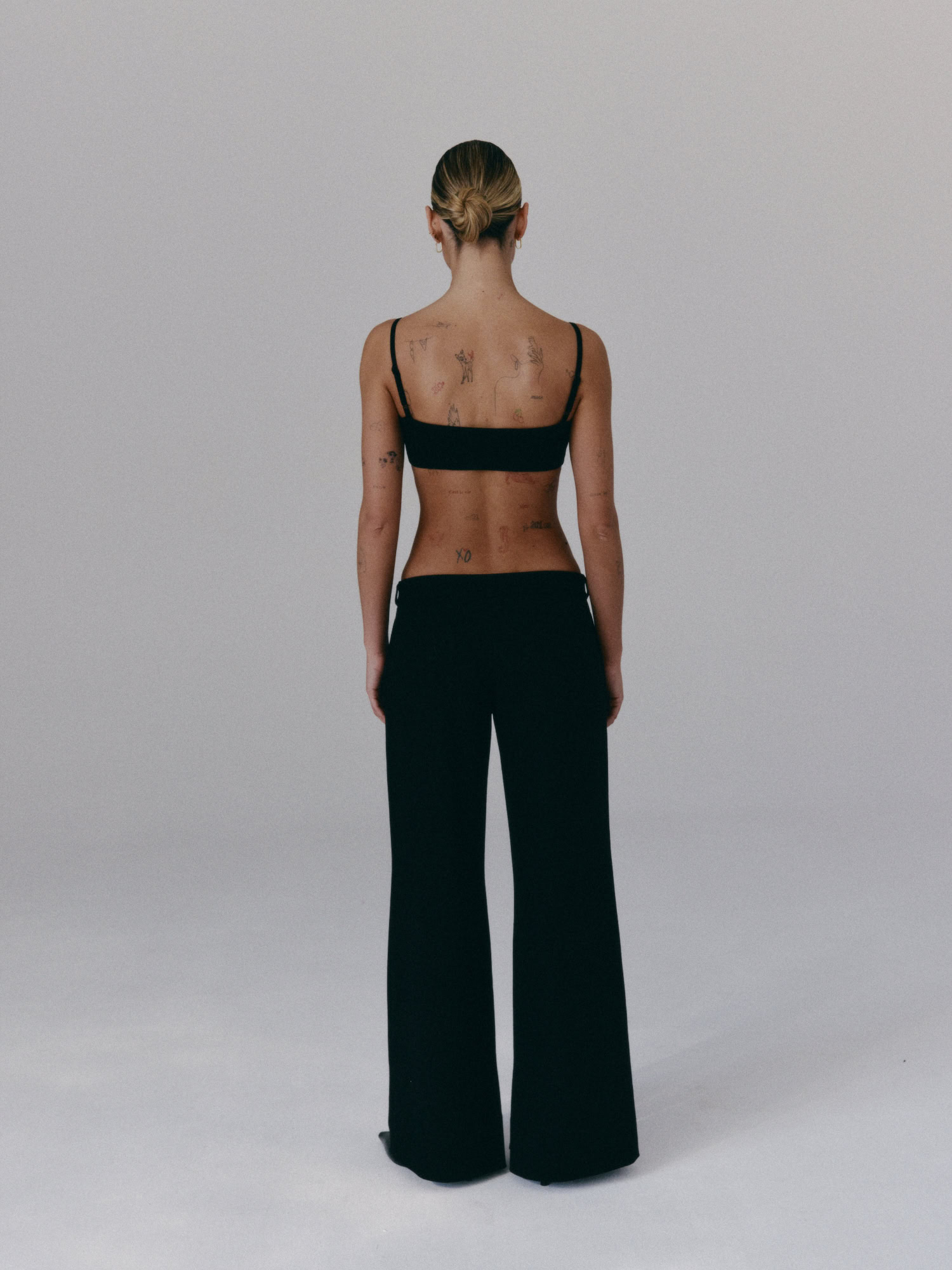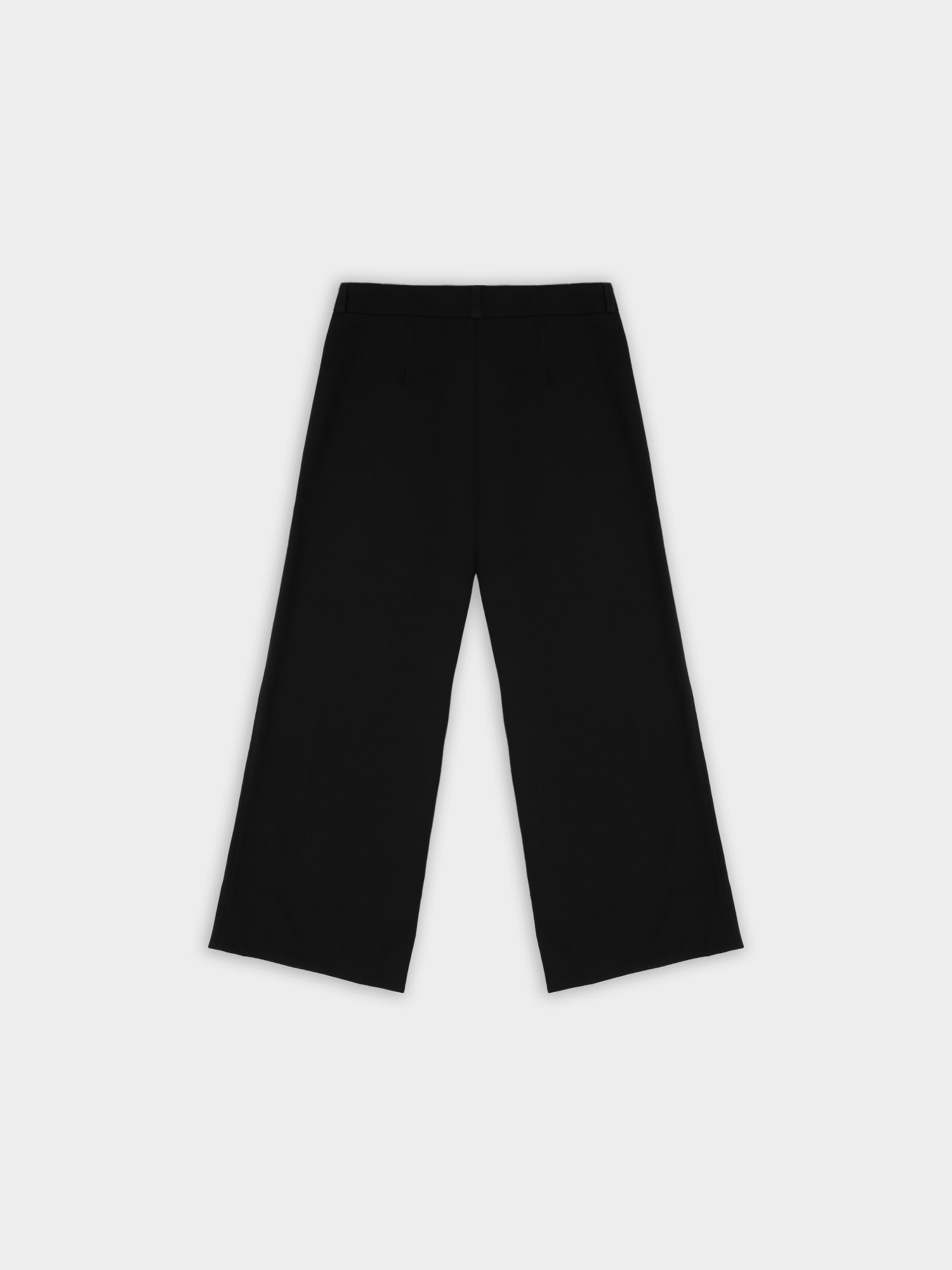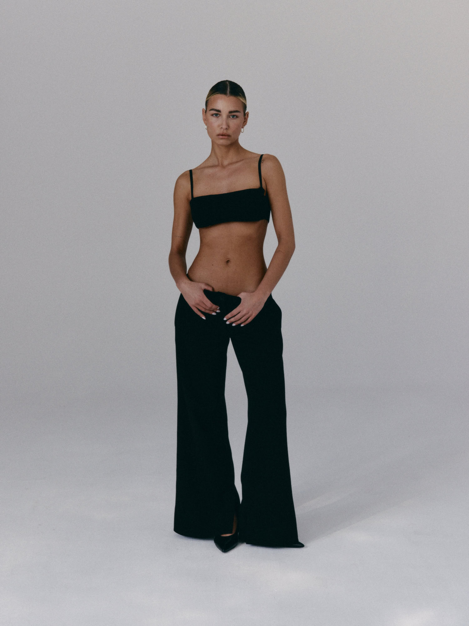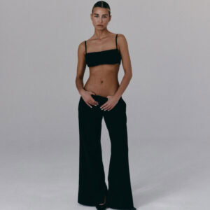 Spodnie typu flare z niskim stanem. Model posiada proste nogawki rozszerzane ku dołowi z rozcięciem. Zapiane na zamek i guzik. Idealnie sprawdzą się jako baza do każdej stylizacji, szczególnie w zestawie z marynarką lub kamizelką MAIN.