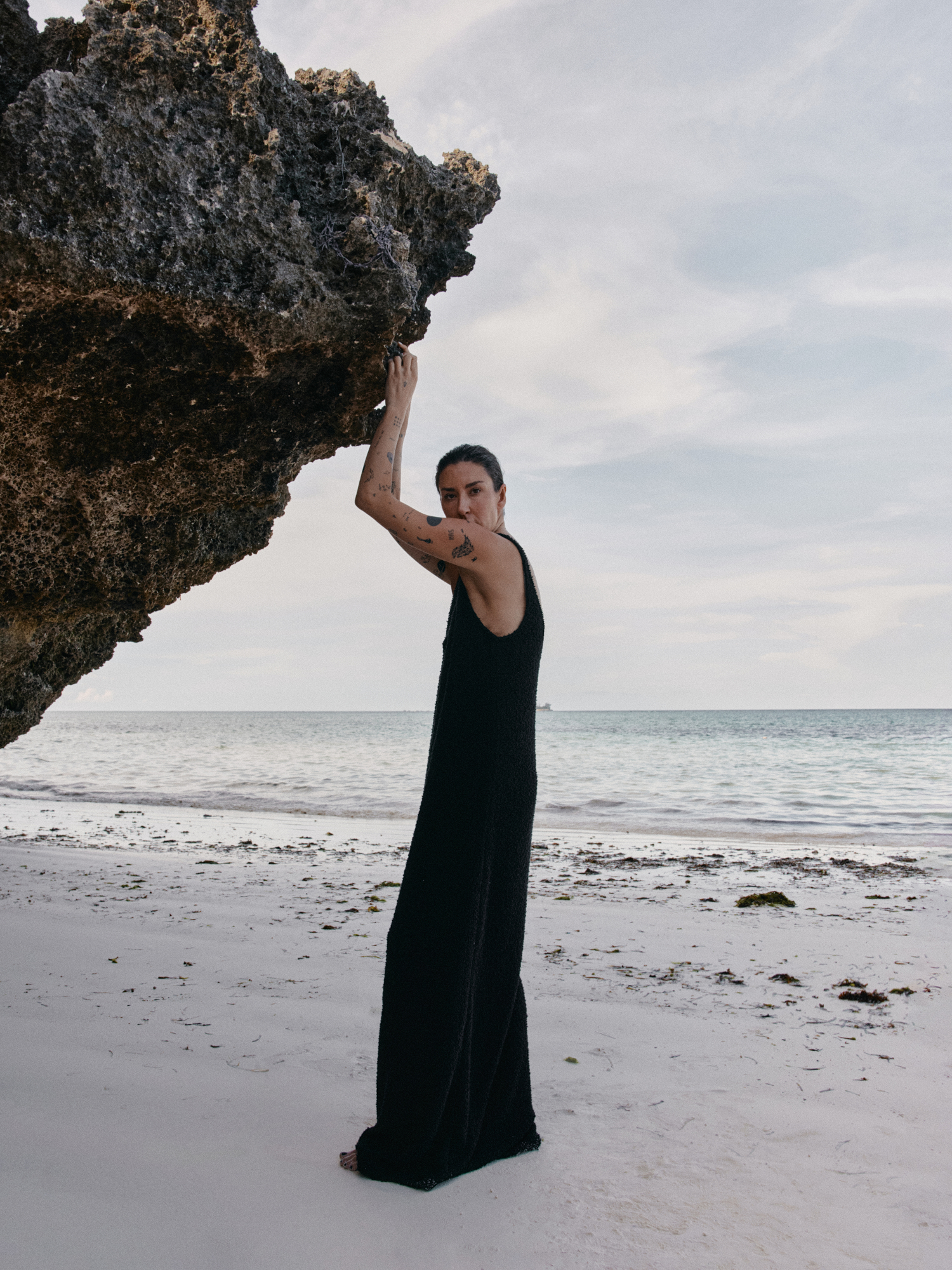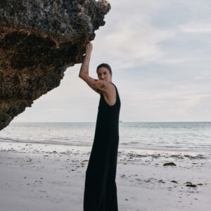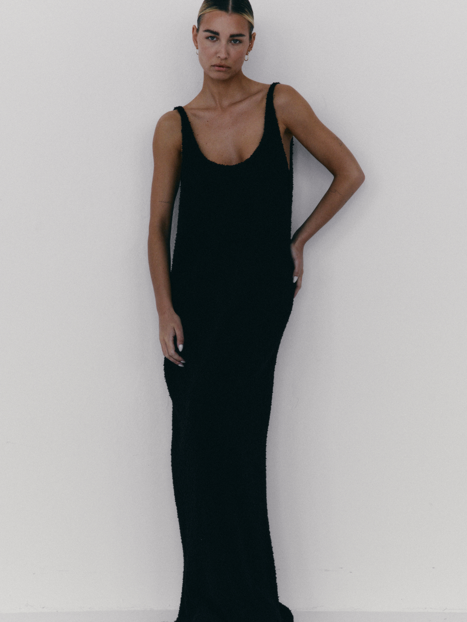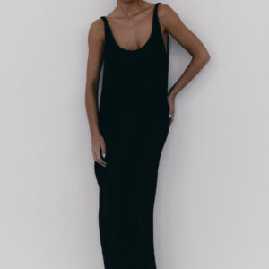 Prosta sukienka na szerokich ramiączkach o strukturze boucle i luźnym kroju. Długość do kostek. Subtelnie wycięty dekolt w kształcie litery U idealnie podkreśla linię biustu. Model sprawdzi się zarówno na co dzień, jak i wieczorne wyjście.
