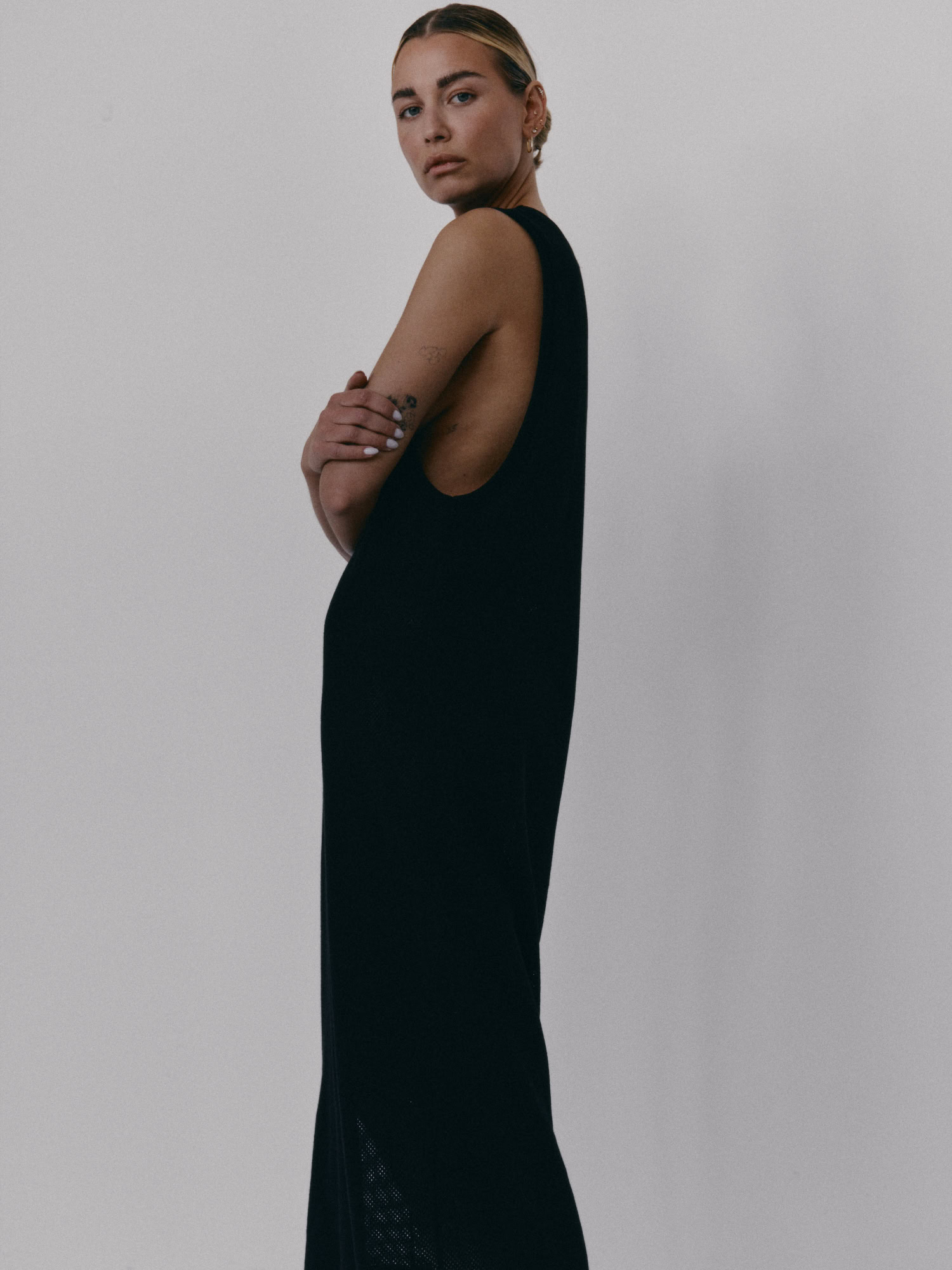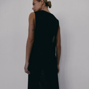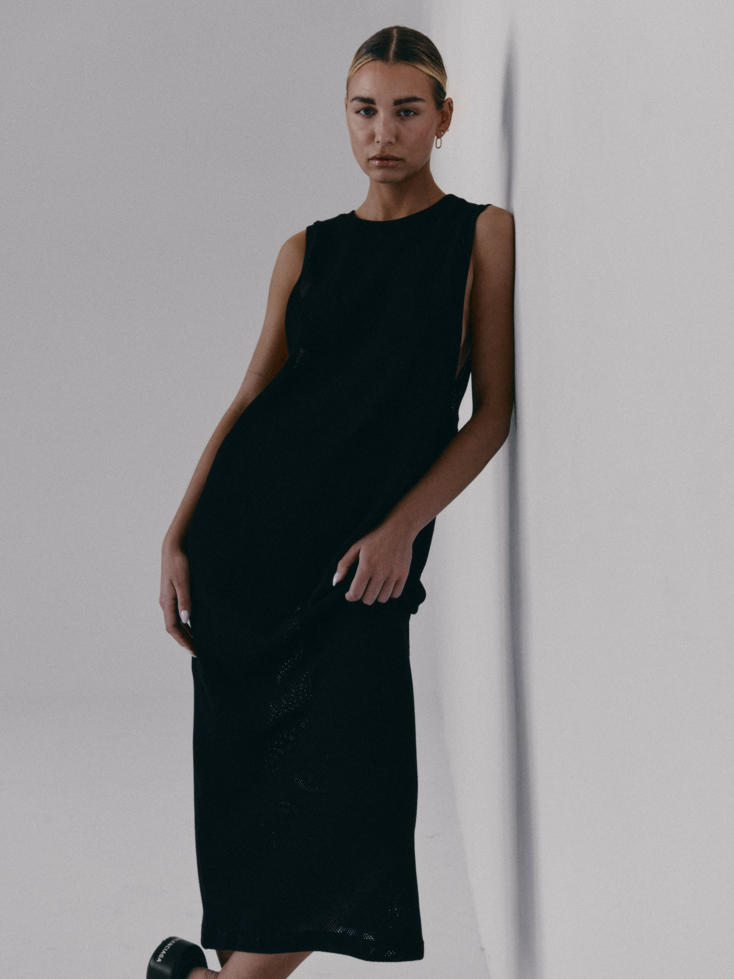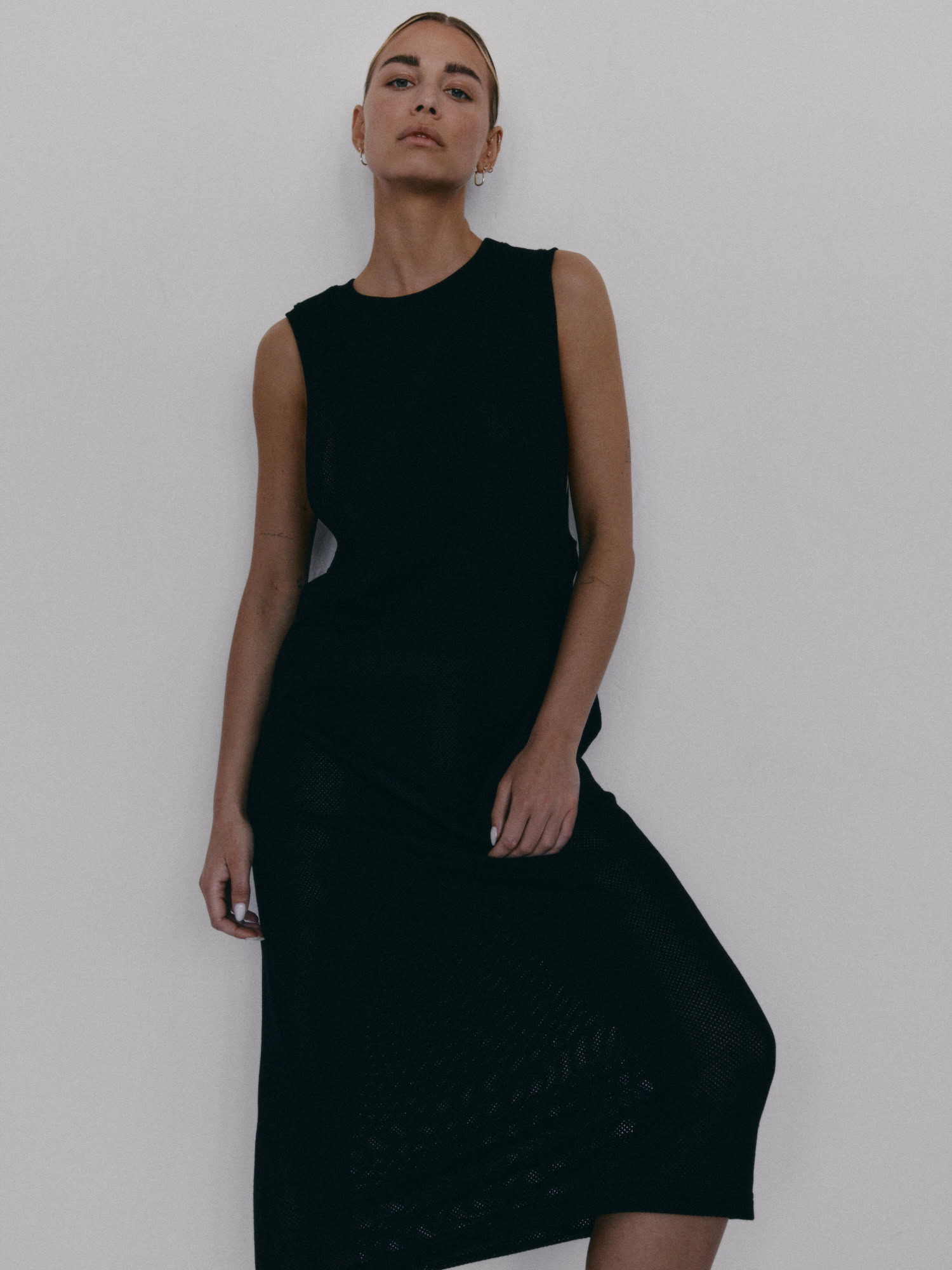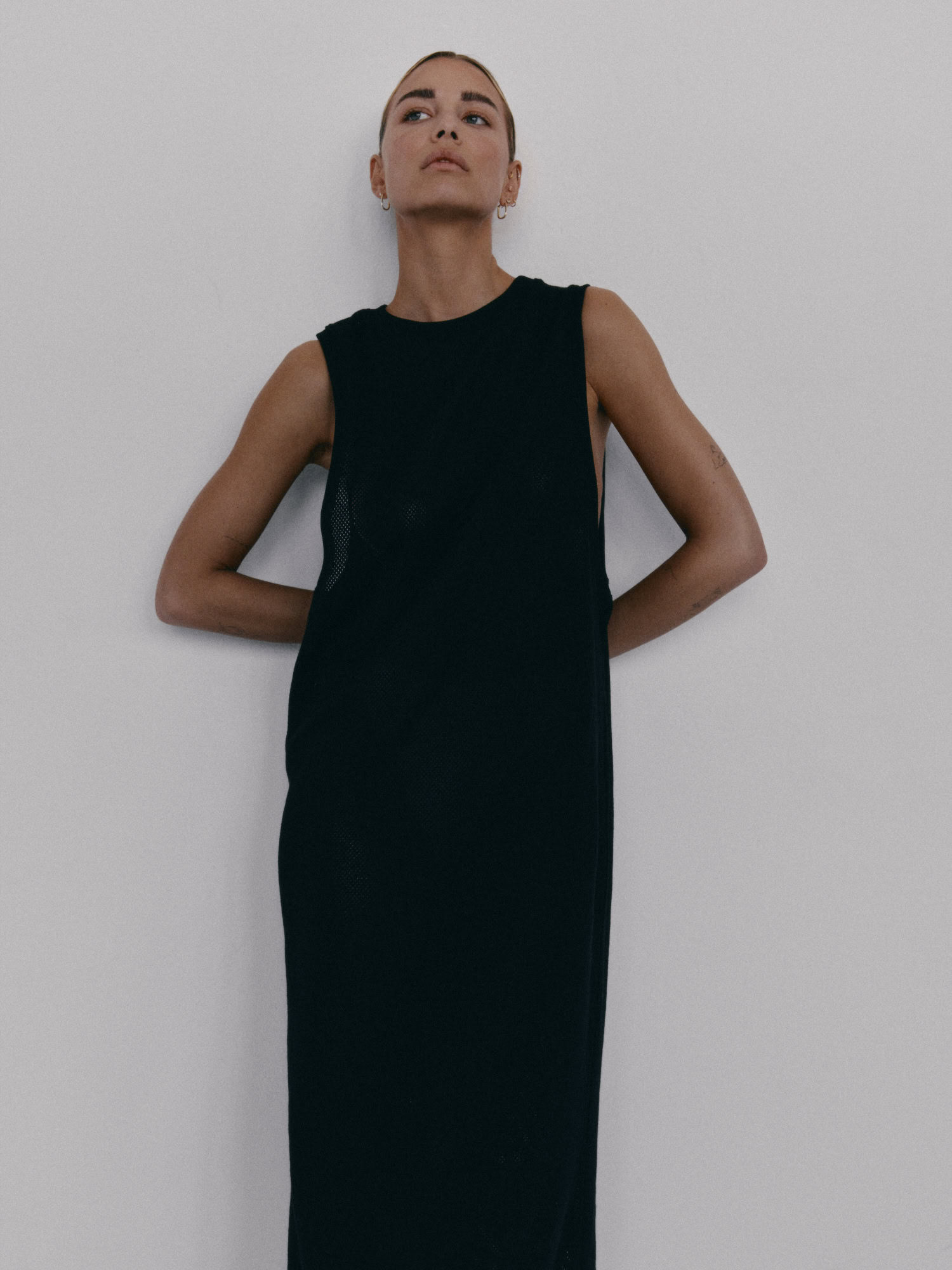 Siateczkowa, długa sukienka. Wygodna oraz minimalistyczna. Długość do kostek. Dekolt oraz rękawy wykończone są ściągaczem. Model posiada zadziornie wycięte boki. Świetnie się sprawdzi w stylizacjach causal’owych, wieczorowych, ale również jako narzutka na kostium kąpielowy.