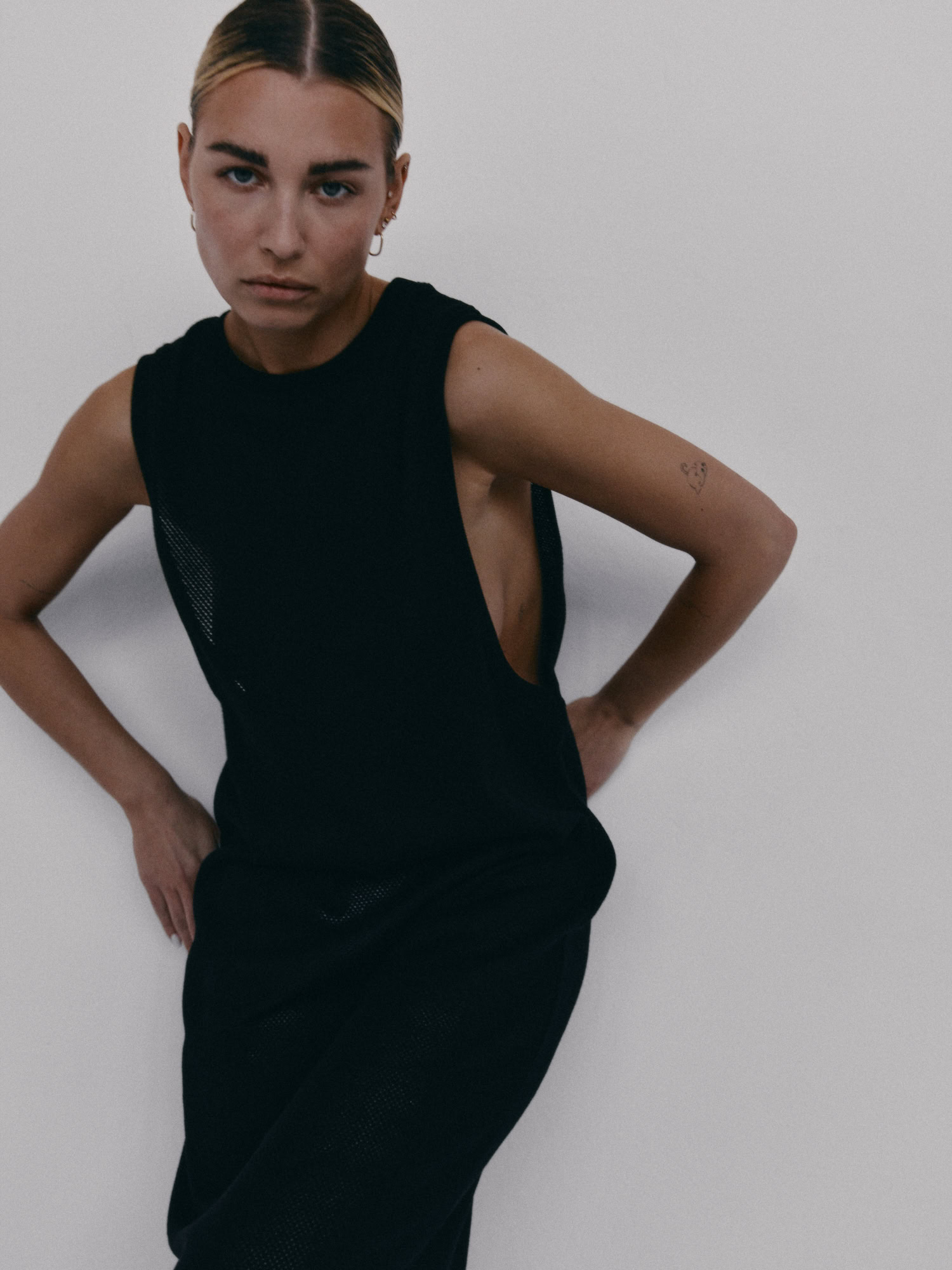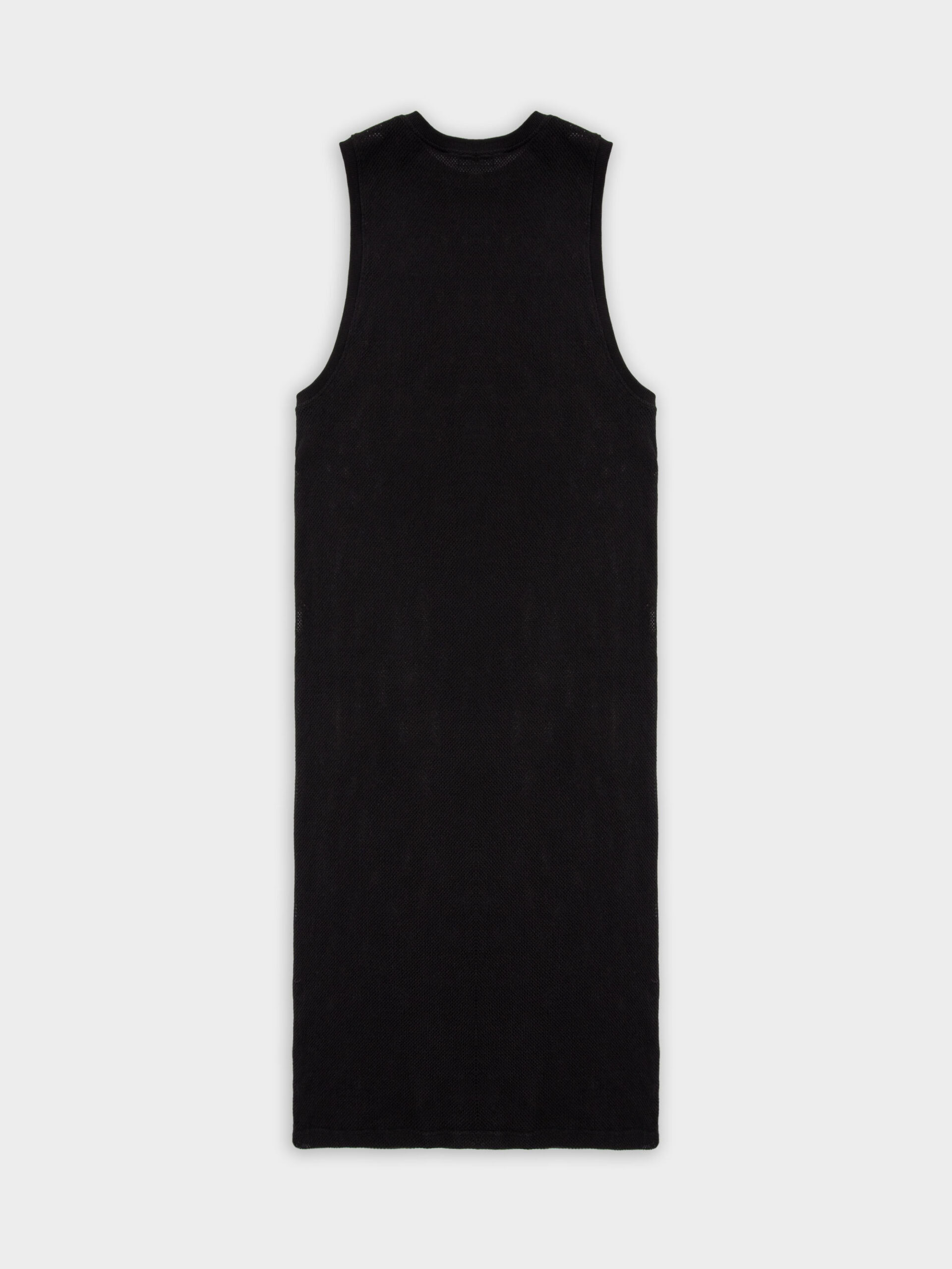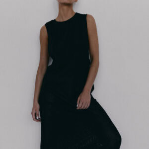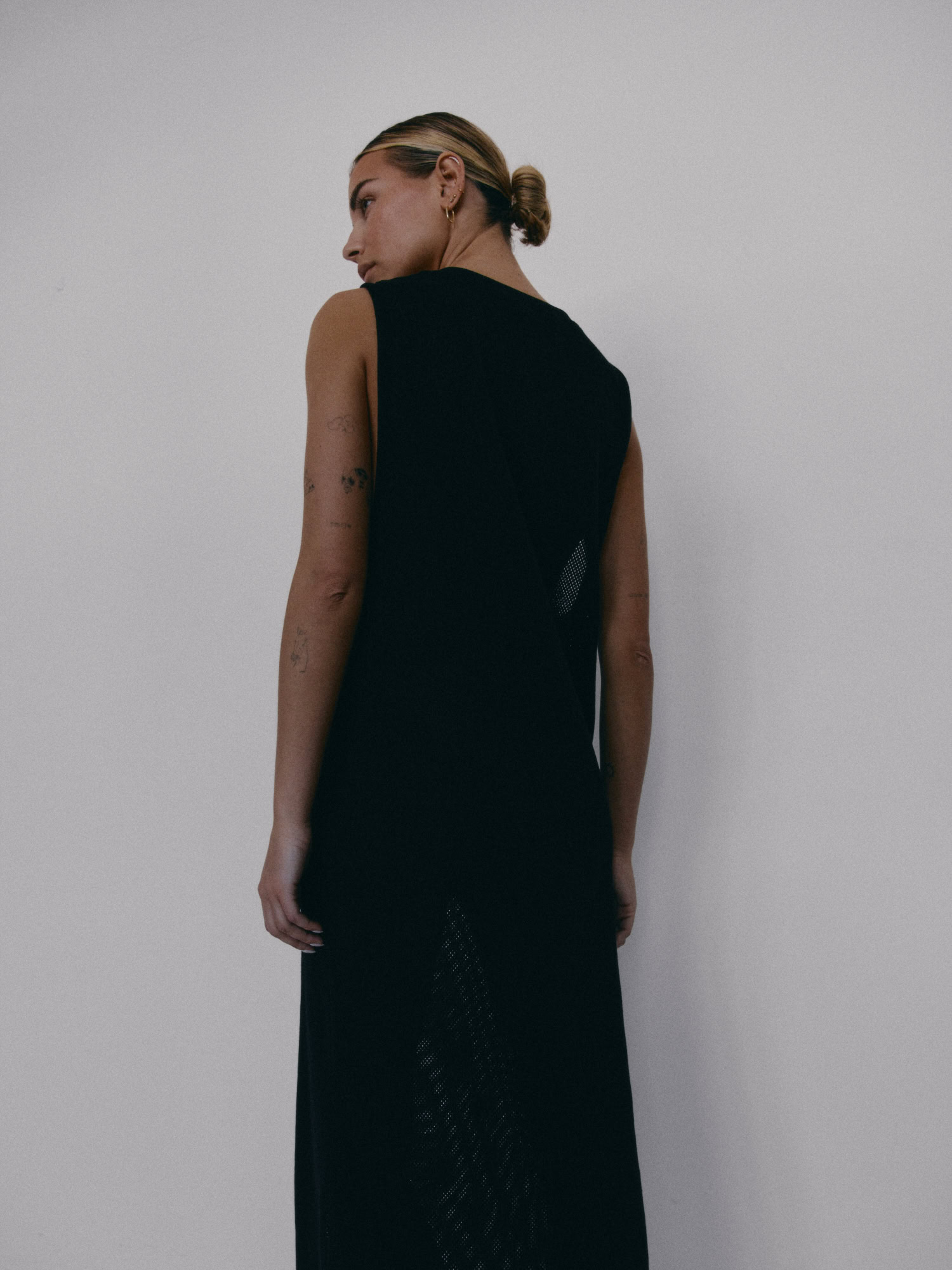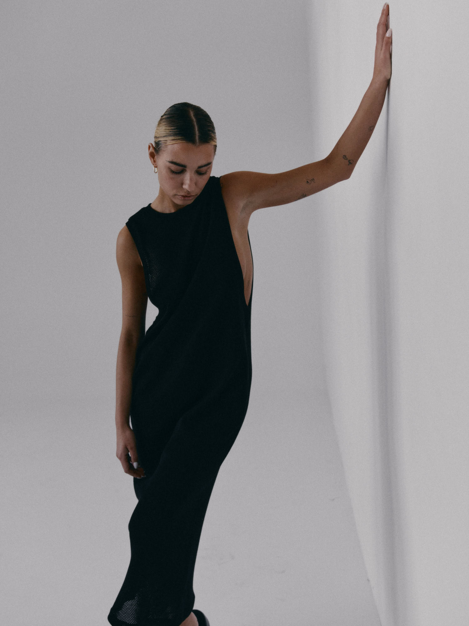 Siateczkowa, długa sukienka. Wygodna oraz minimalistyczna. Długość do kostek. Dekolt oraz rękawy wykończone są ściągaczem. Model posiada zadziornie wycięte boki. Świetnie się sprawdzi w stylizacjach causal’owych, wieczorowych, ale również jako narzutka na kostium kąpielowy.
