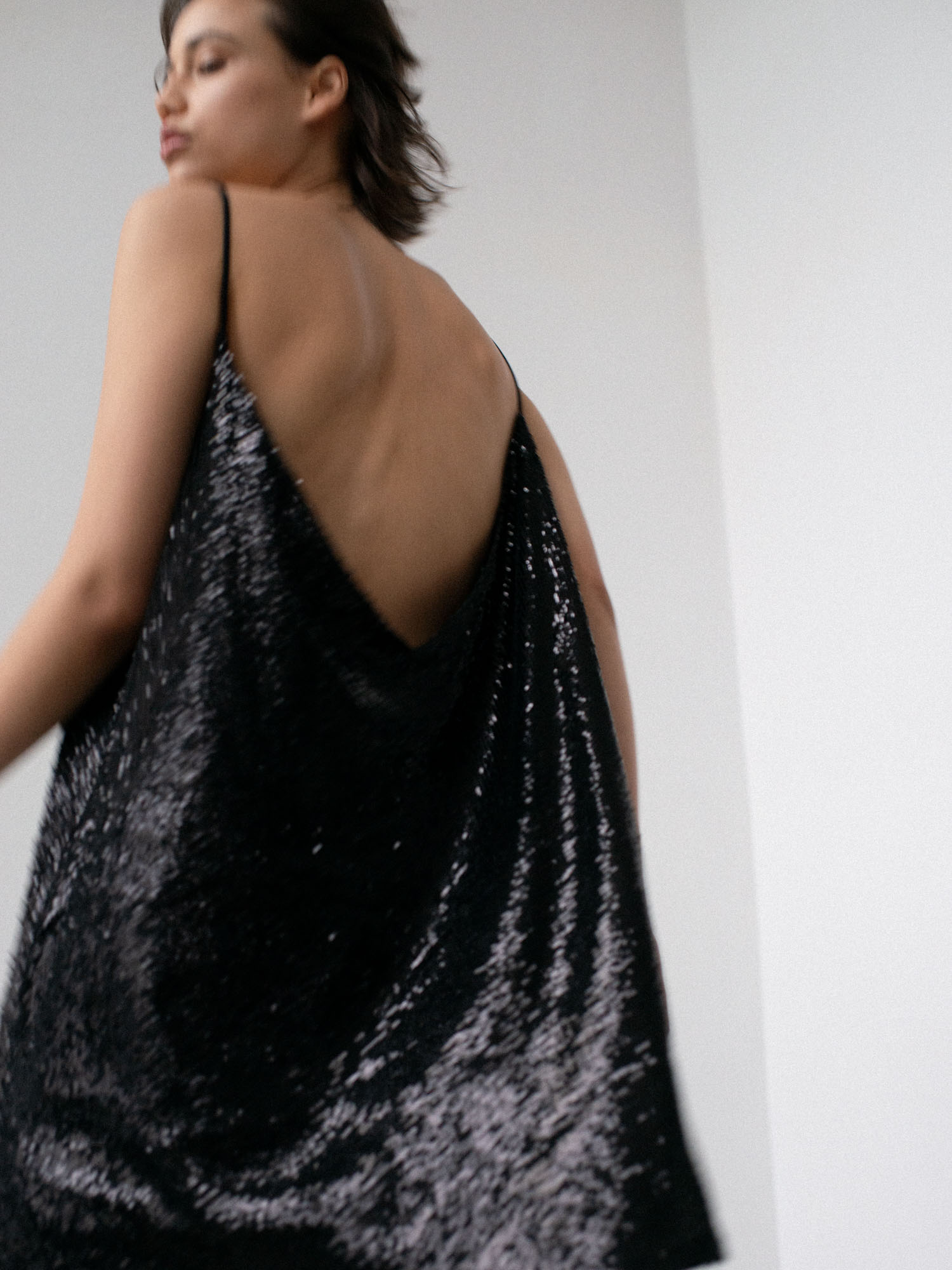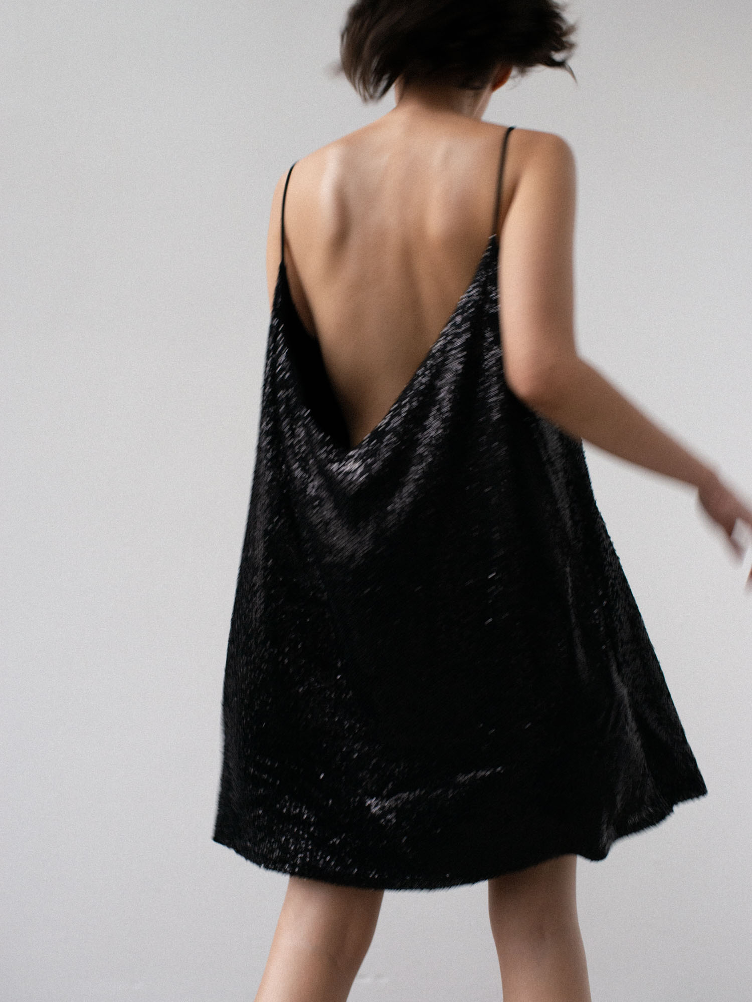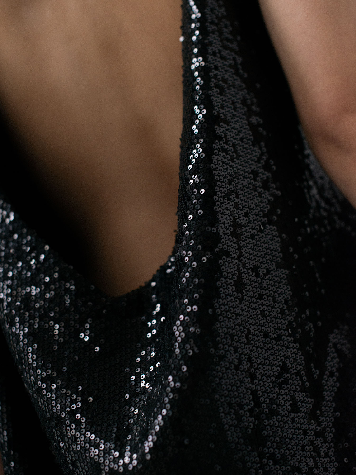 Nasz bestsellerowy krój #SURFGIRL powraca w nowej, sylwestrowej odsłonie. Sukienka na cienkich ramiączkach w prosty krój w literę A. Z przodu minimalistyczny dekolt, z tyłu ultra głębokie wycięcie, w kształcie litery V. Produkt doskonale podkreśla linię pleców. Aplikacja z ozdobnych cekinów. Sukienka posiada dopasowaną kolorystycznie wiskozową podszewkę.