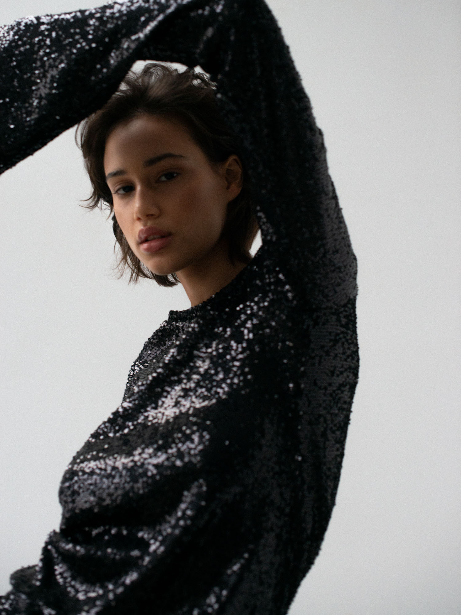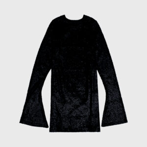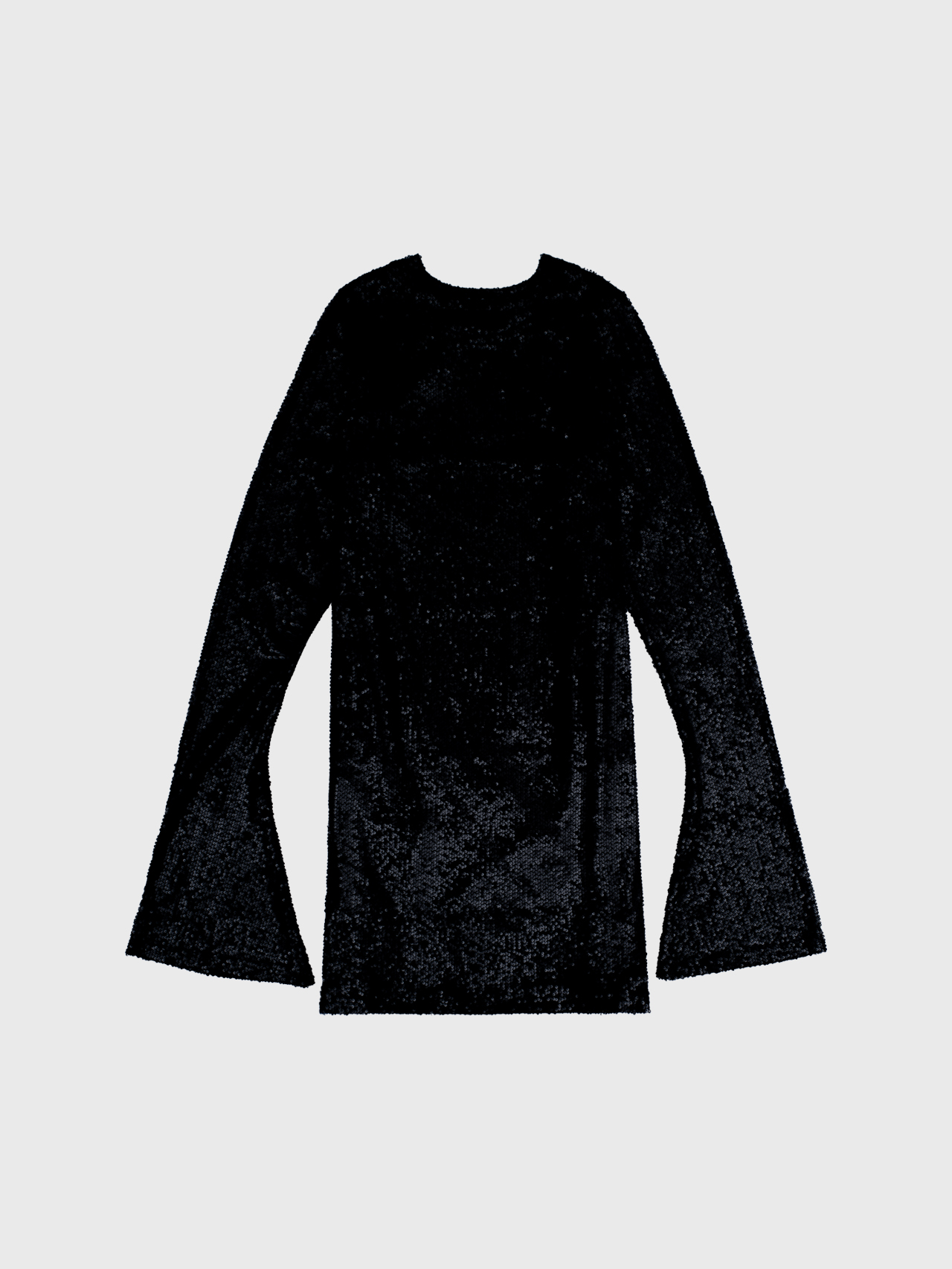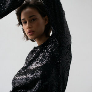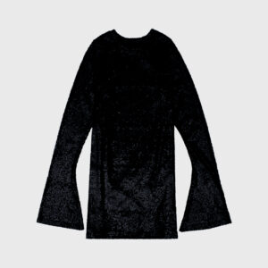 Krótka sukienka z długimi rękawami rozszerzanym ku dołowi. Dopasowany krój podkreśla sylwetkę, a rozszerzane rękawy dodają całości lekkości oraz tworzą piękny ruch przy każdym kroku. Aplikacja z ozdobnych cekinów. Sukienka posiada dopasowaną kolorystycznie wiskozową podszewkę. Idealnie się sprawdzi z klasycznymi szpilkami.