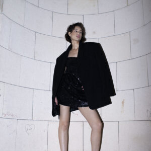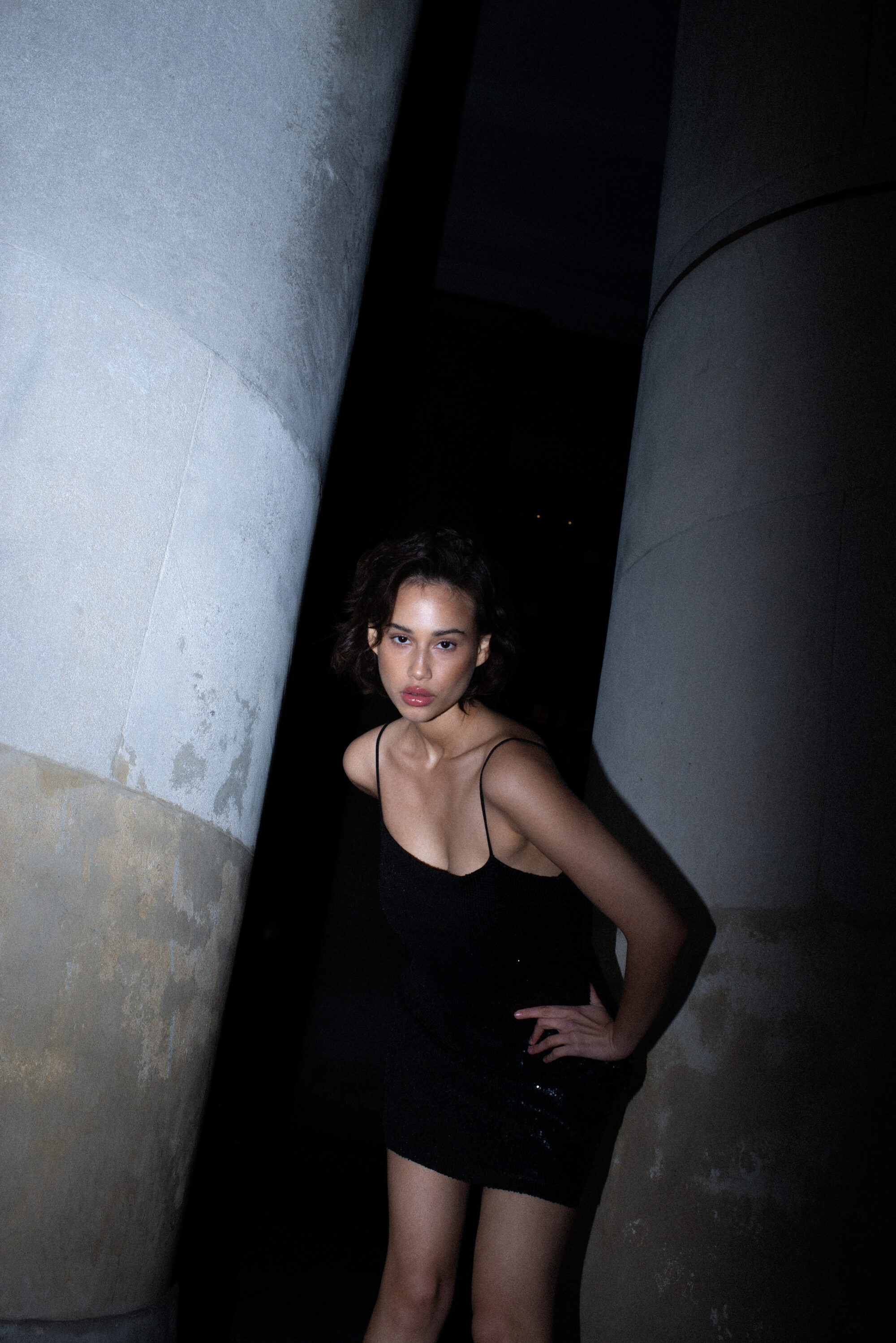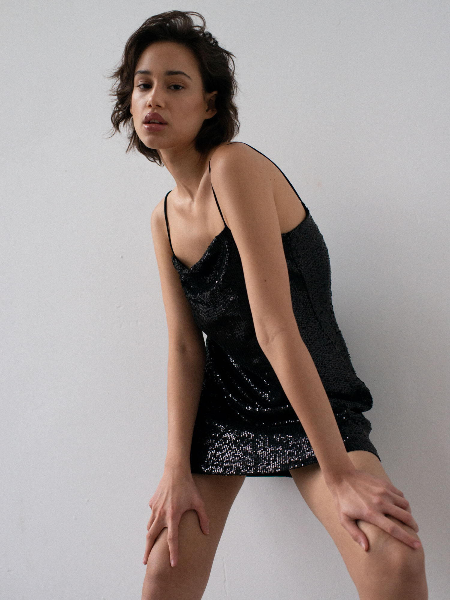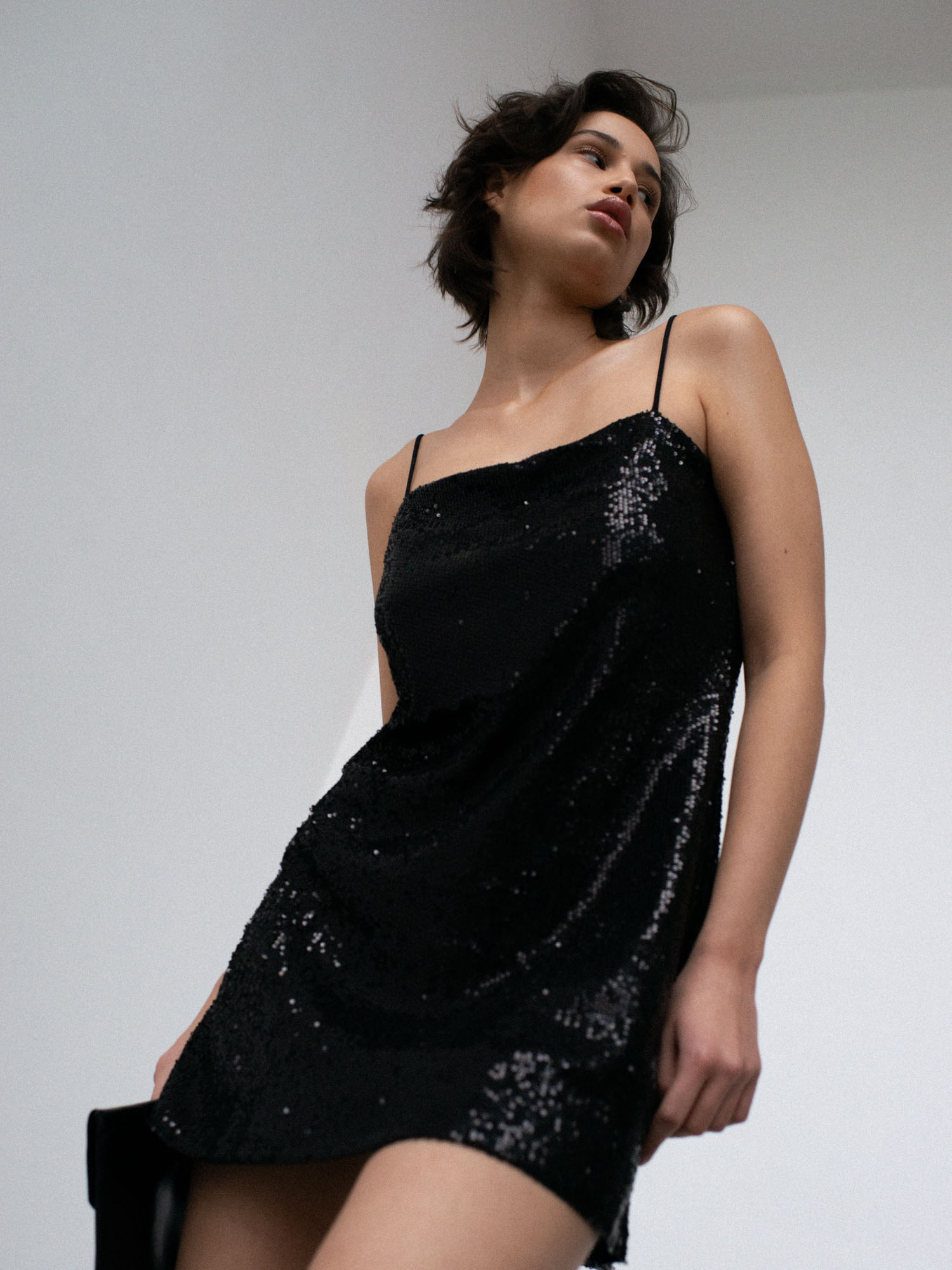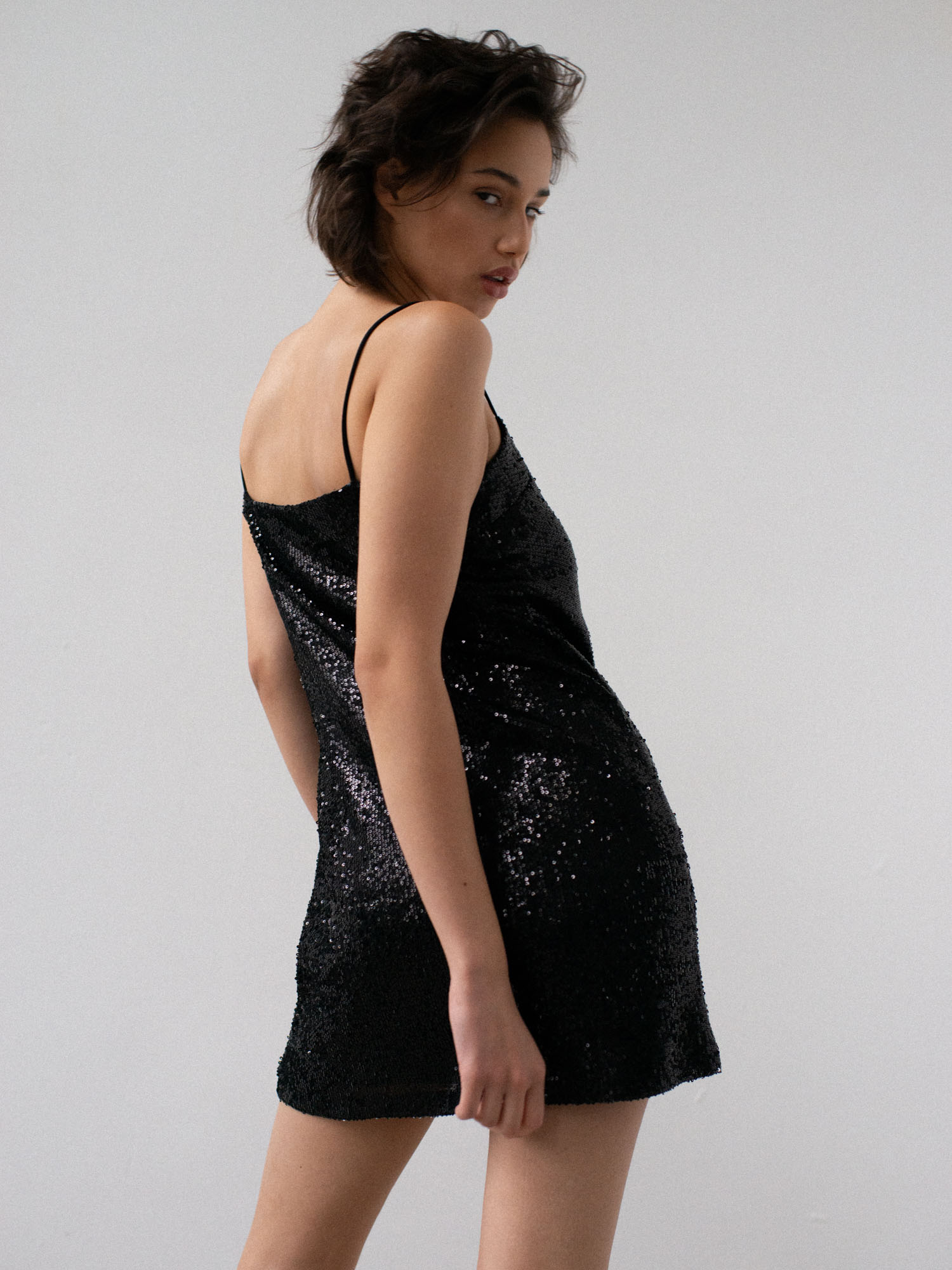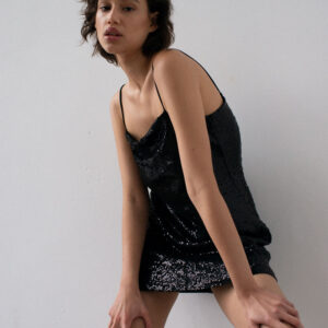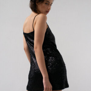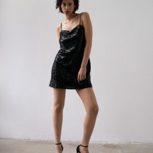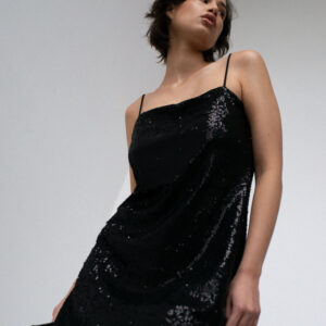 Sukienka o prostym, lekko dopasowanym kroju na cienkich ramiączkach. Prosty dekolt. Aplikacja z ozdobnych cekinów. Sukienka posiada dopasowaną kolorystycznie wiskozową podszewkę. Klasyczna forma połączona z błyskiem sprawia, że ta sukienka to idealny wybór na wieczorne wyjście. Pasuje zarówno do szpilek jak i kozaków.