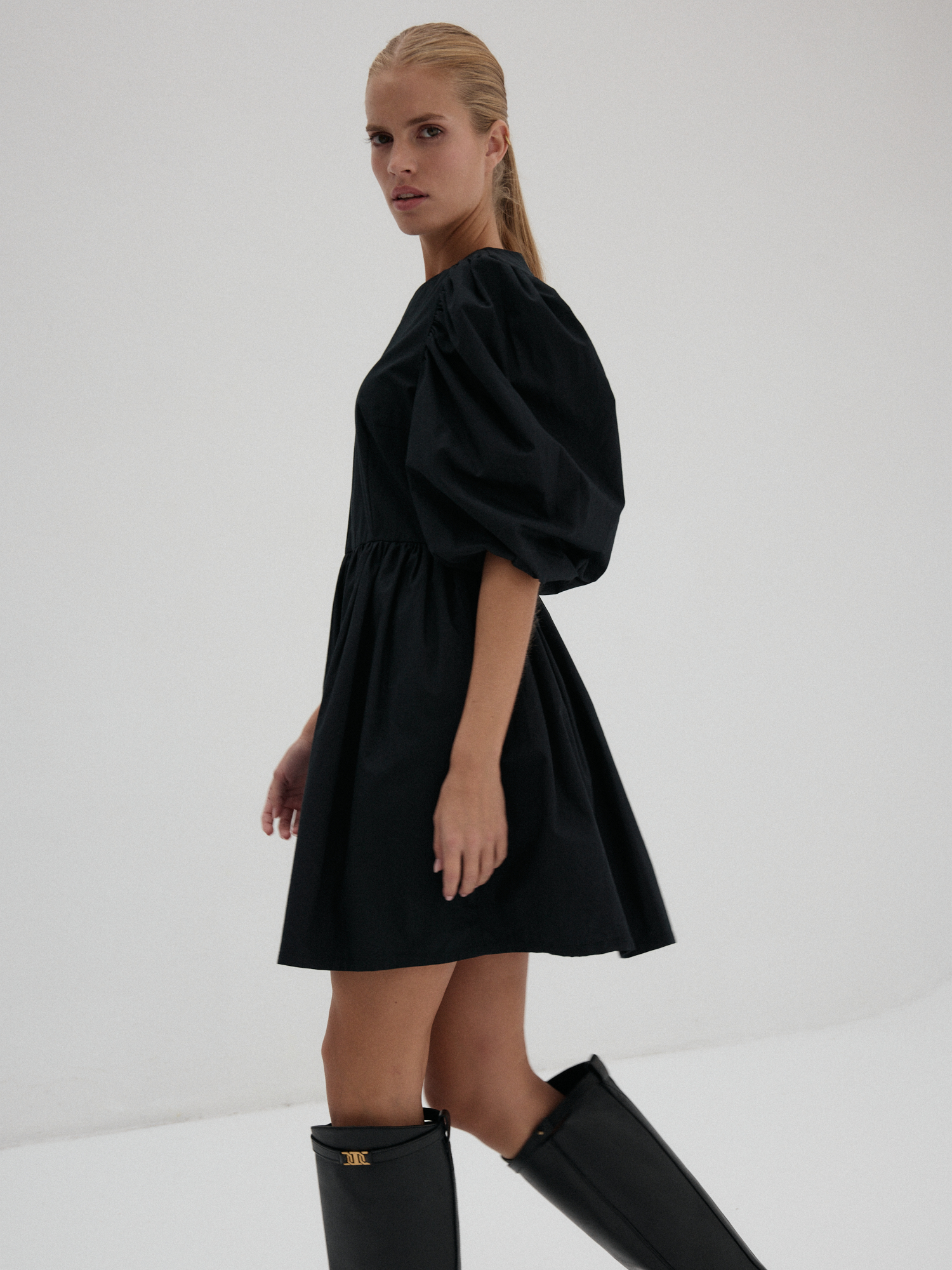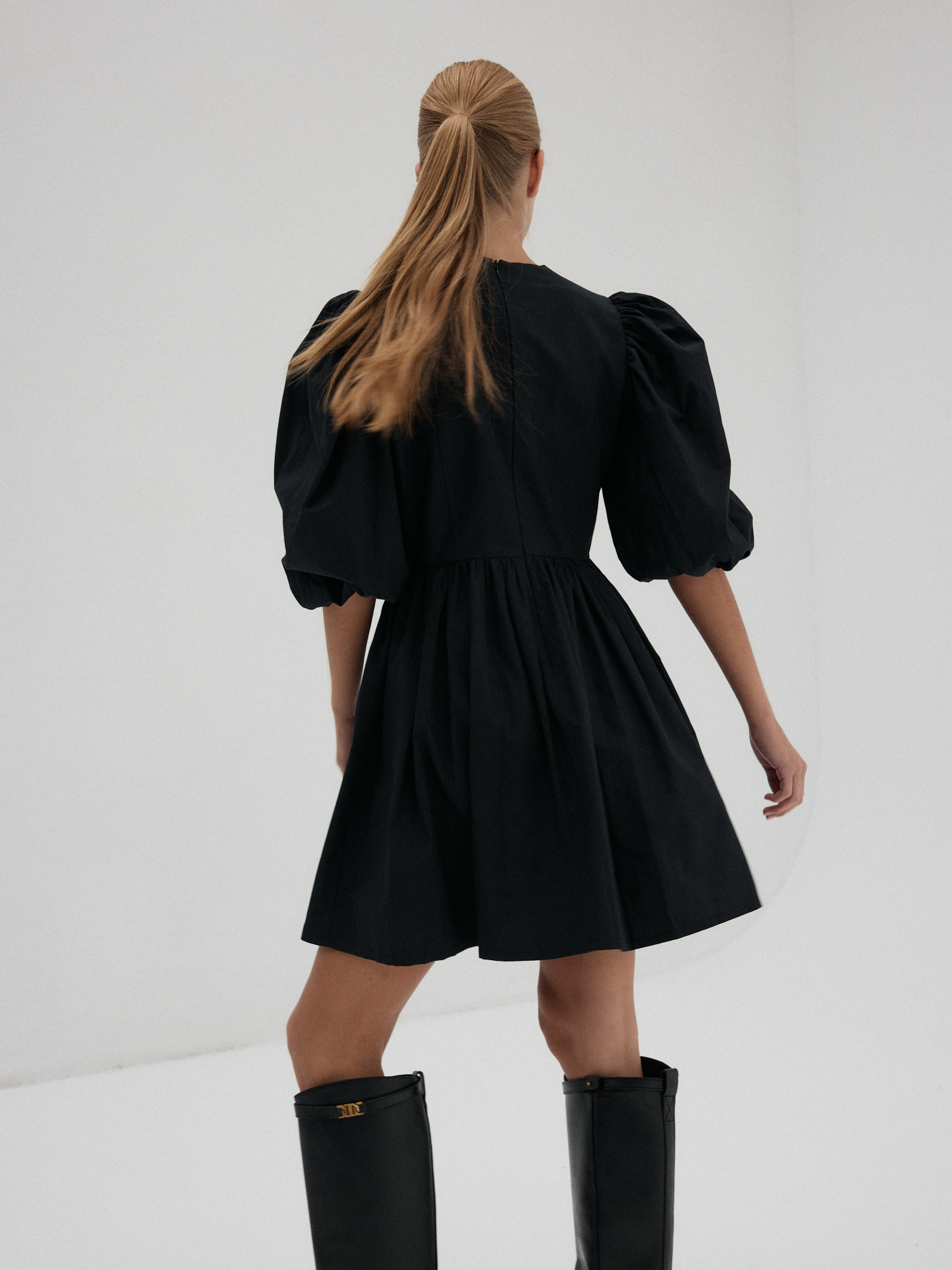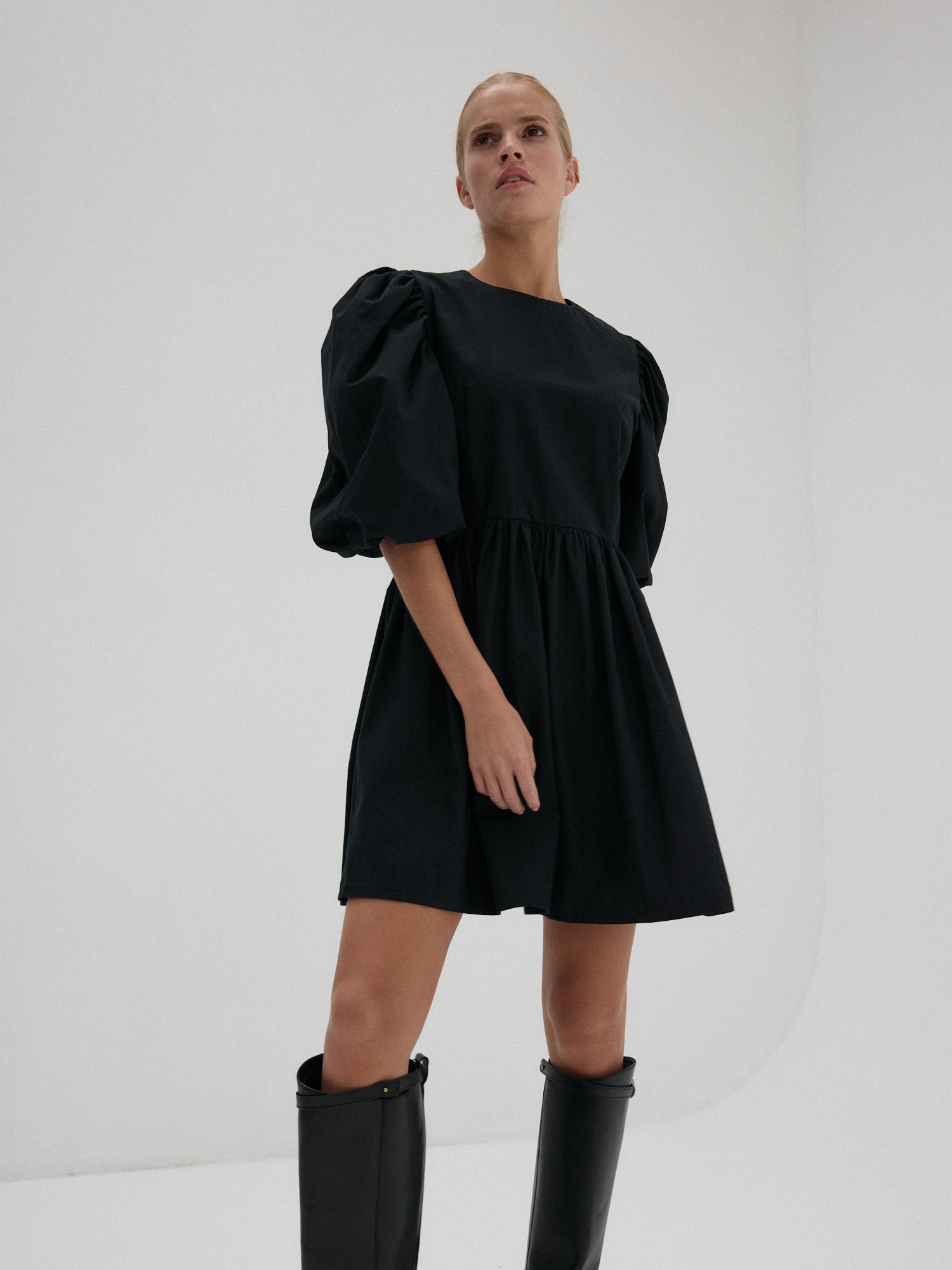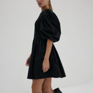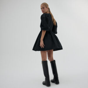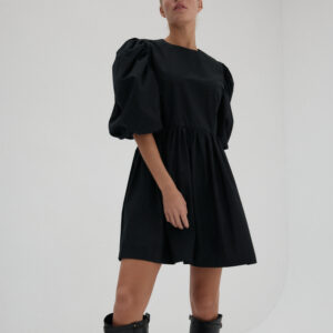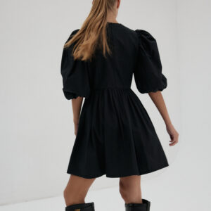 Krótka sukienka. Bufiaste rękawy o długości ¾ wykończone gumką z możliwością podwinięcia, które stanowią ciekawe przełamanie prostej, klasycznej formy. Sukienka ma subtelną talię i szeroki dół, który zapewnia komfort i lekkość. Idealna do stworzenia zarówno casualowych, jak i eleganckich stylizacji, świetnie komponuje się z wysokimi kozakami, jak i sneakersami.