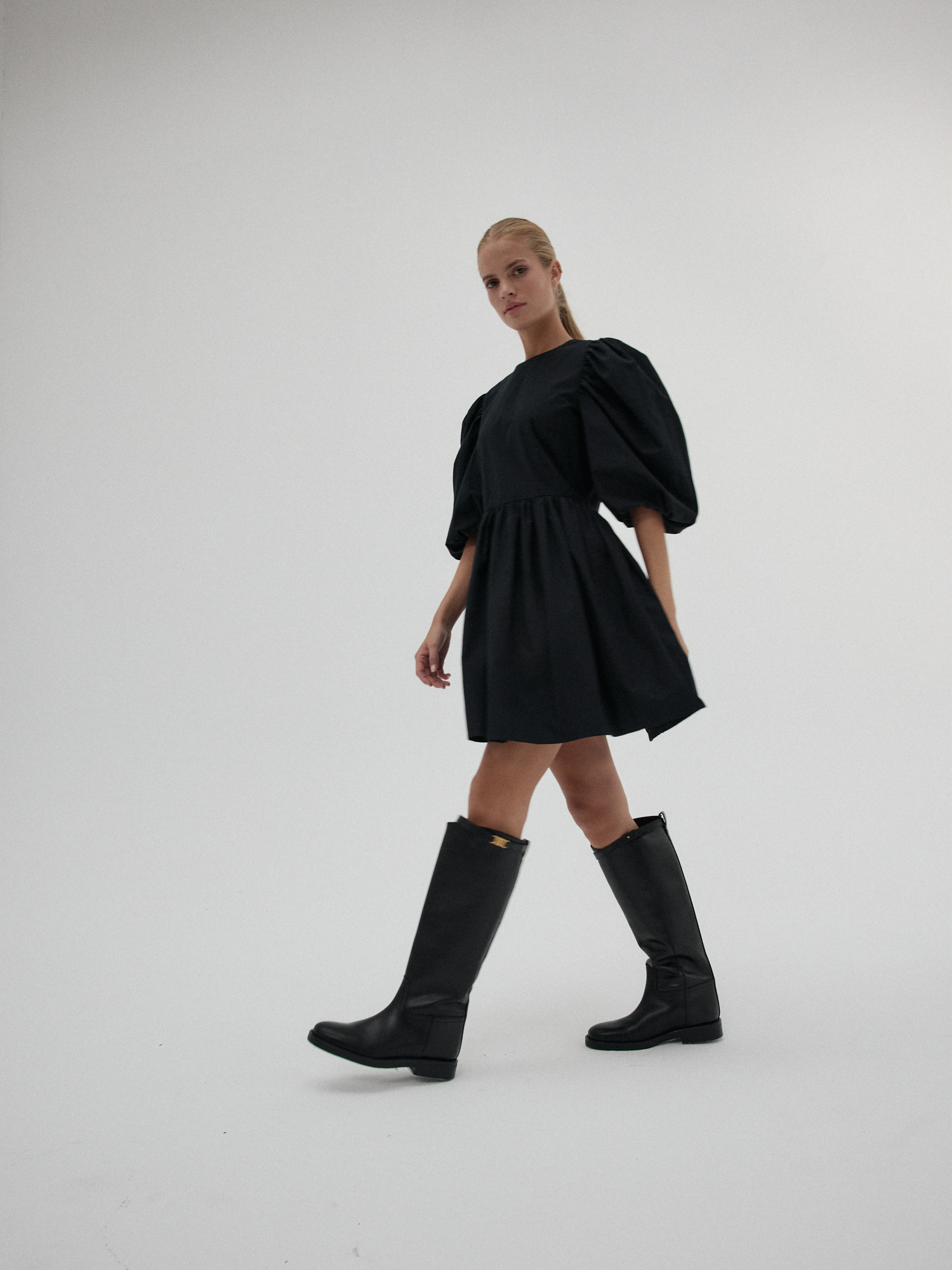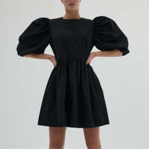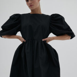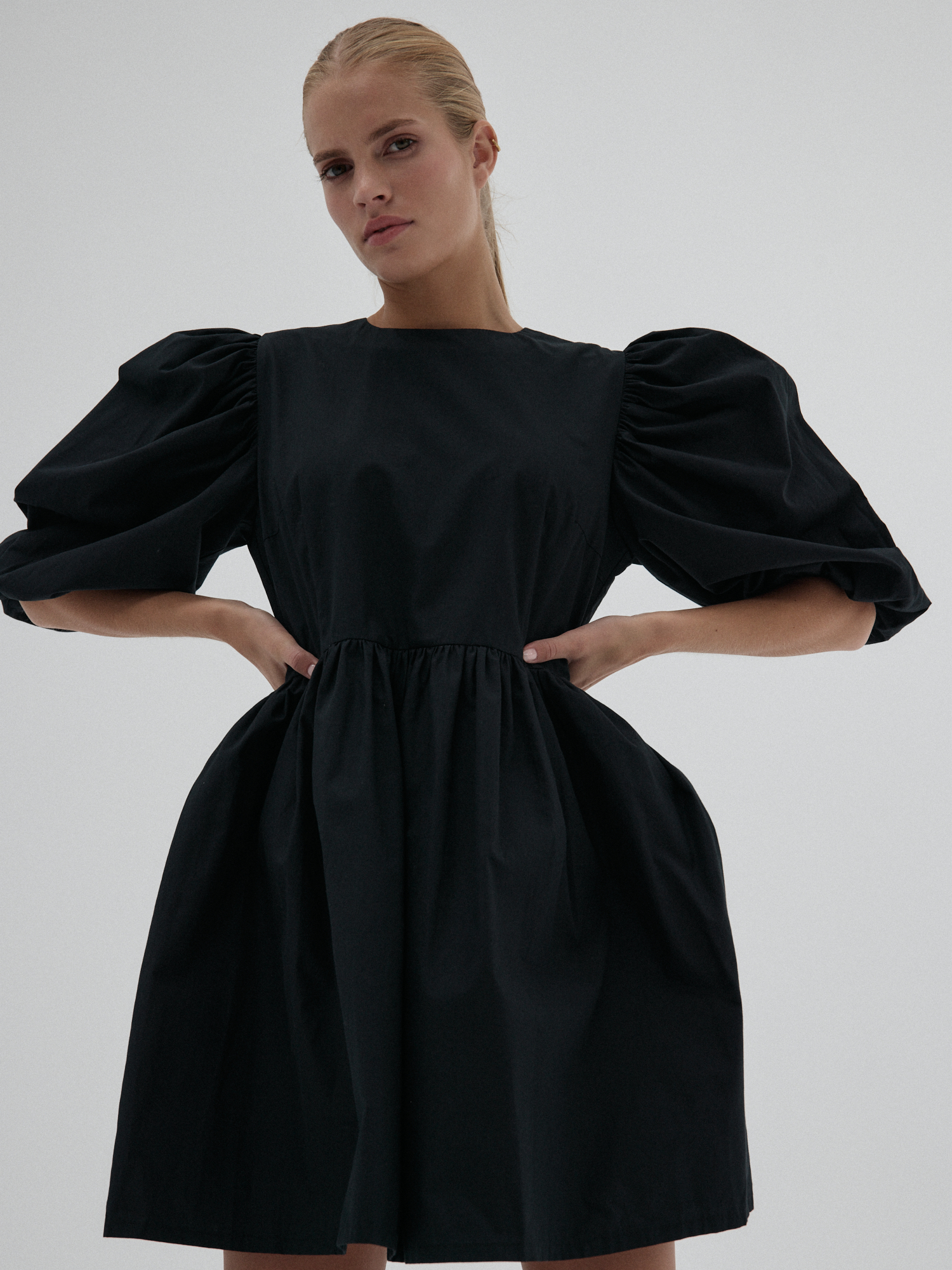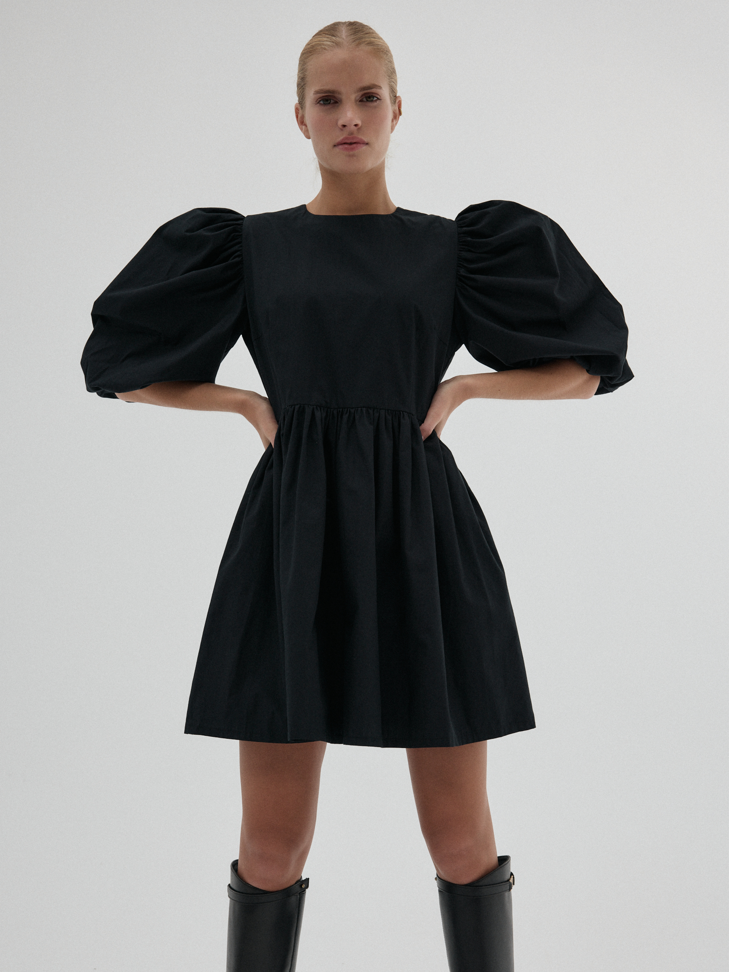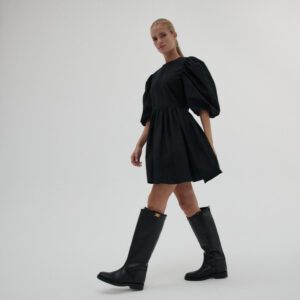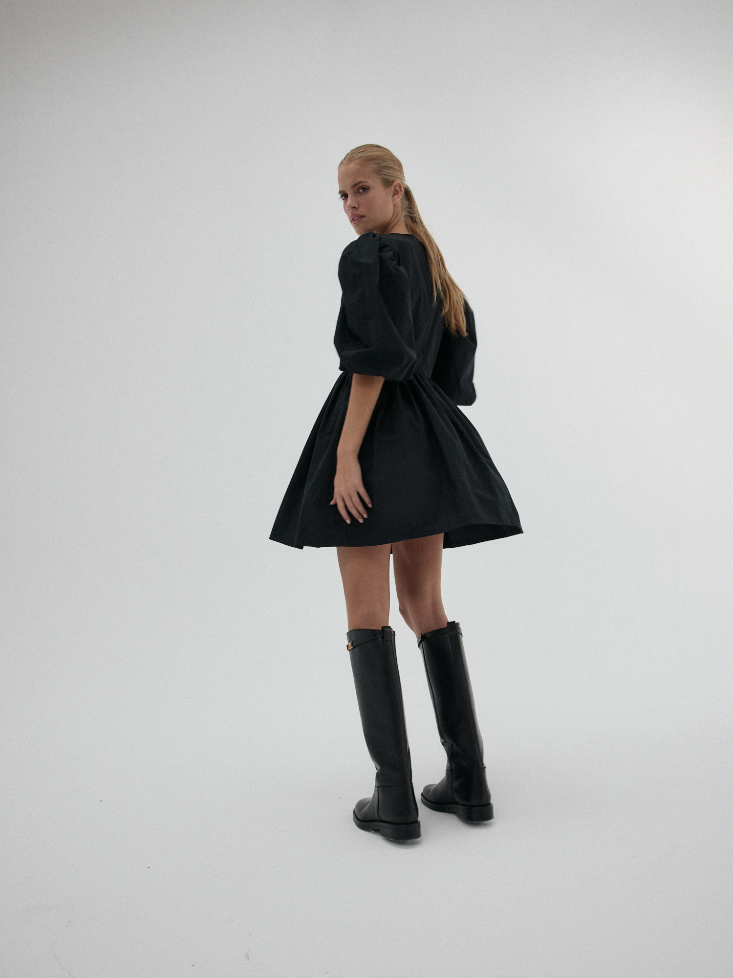 Krótka sukienka. Bufiaste rękawy o długości ¾ wykończone gumką z możliwością podwinięcia, które stanowią ciekawe przełamanie prostej, klasycznej formy. Sukienka ma subtelną talię i szeroki dół, który zapewnia komfort i lekkość. Idealna do stworzenia zarówno casualowych, jak i eleganckich stylizacji, świetnie komponuje się z wysokimi kozakami, jak i sneakersami.