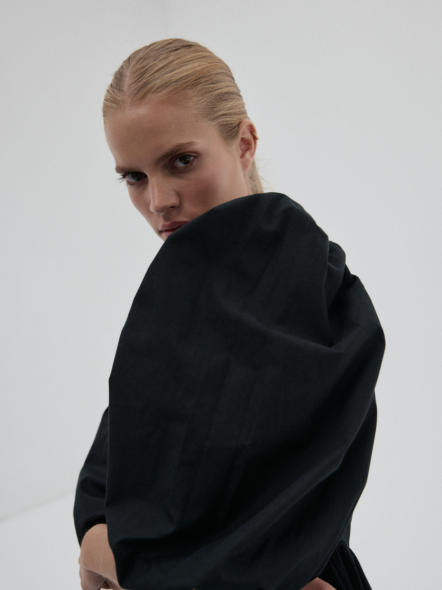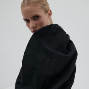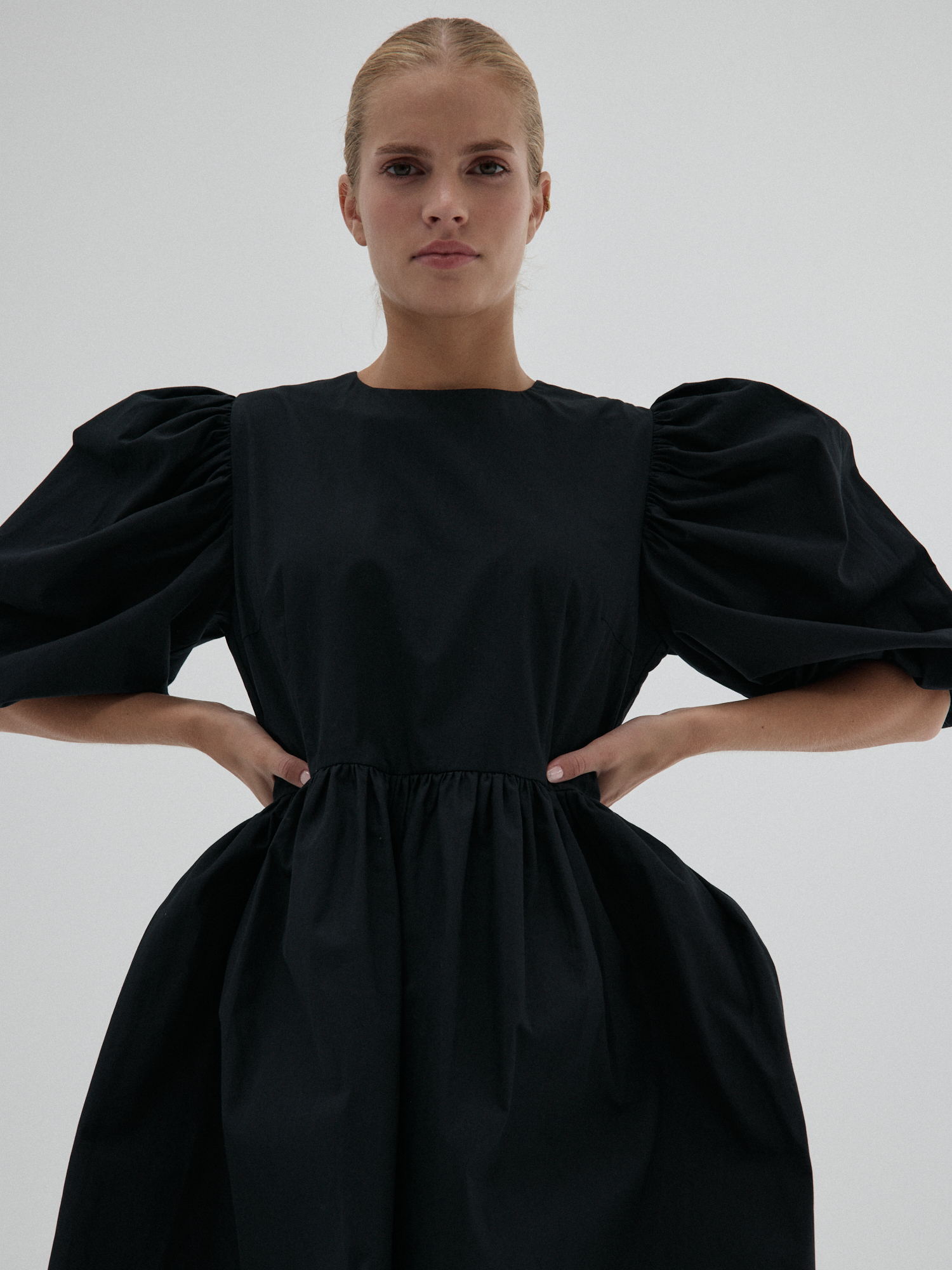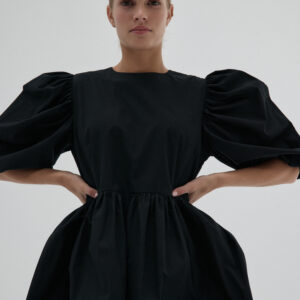 Krótka sukienka. Bufiaste rękawy o długości ¾ wykończone gumką z możliwością podwinięcia, które stanowią ciekawe przełamanie prostej, klasycznej formy. Sukienka ma subtelną talię i szeroki dół, który zapewnia komfort i lekkość. Idealna do stworzenia zarówno casualowych, jak i eleganckich stylizacji, świetnie komponuje się z wysokimi kozakami, jak i sneakersami.