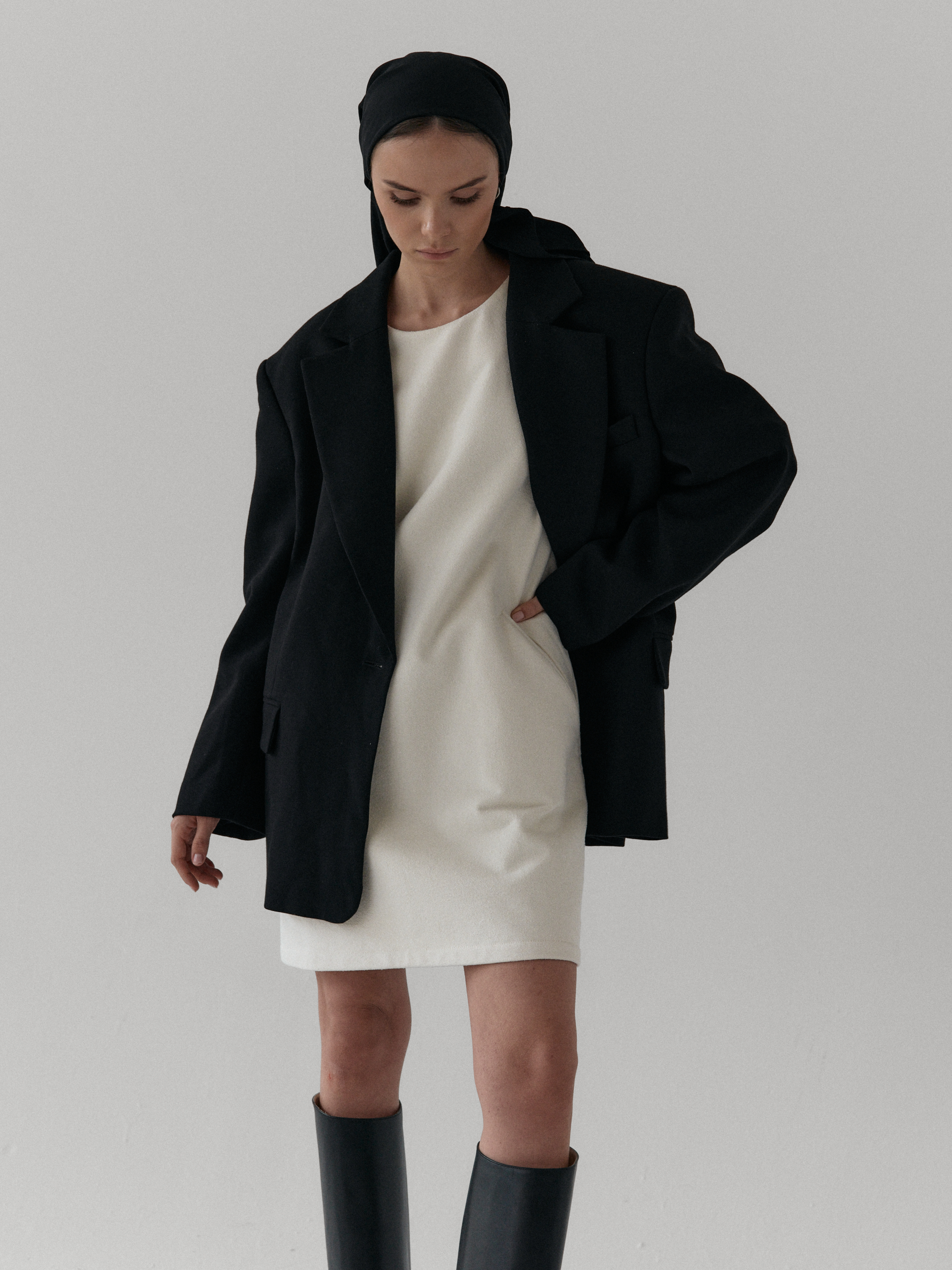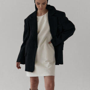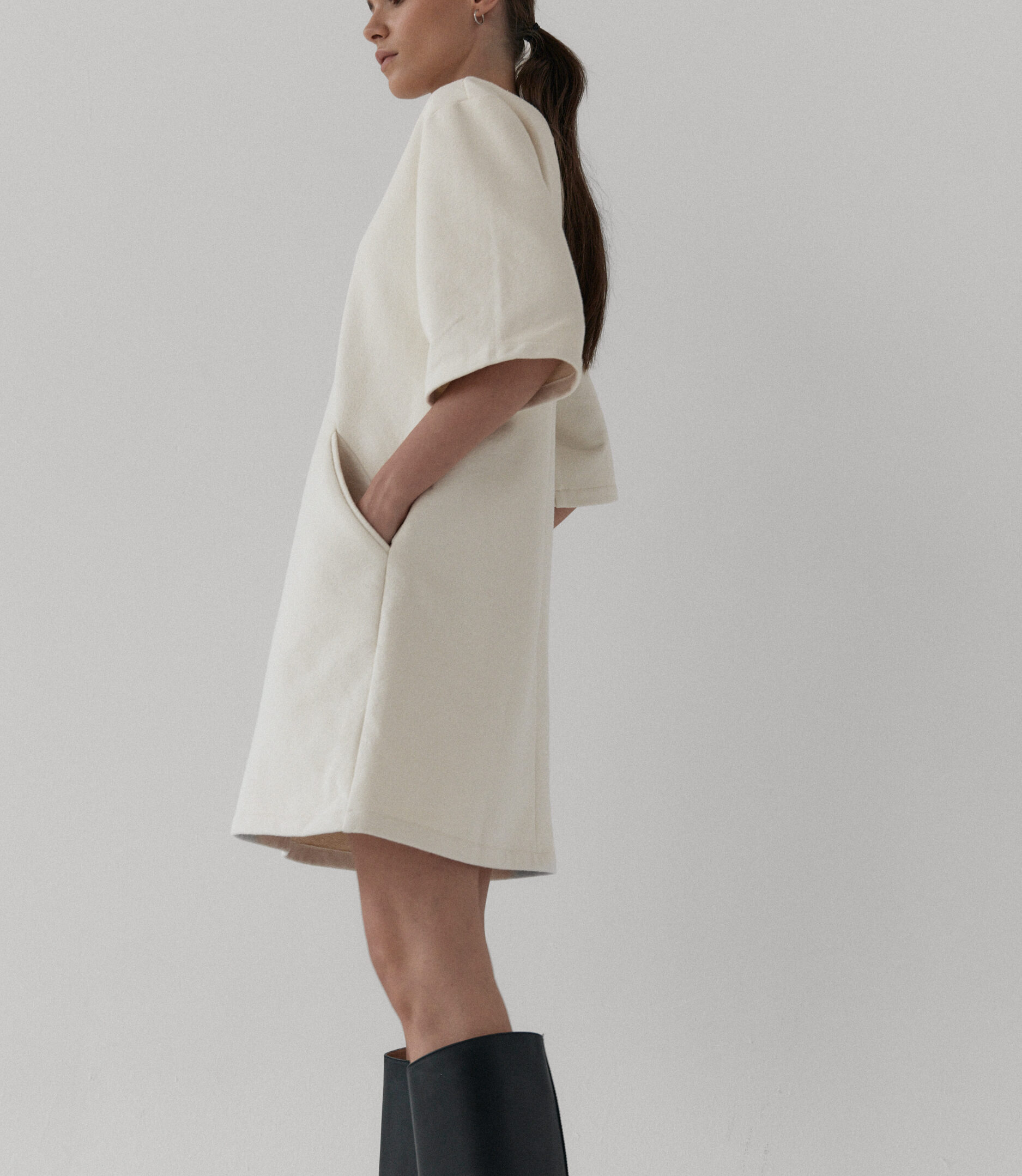 Krótka sukienka o luźnym, pudełkowym kroju. Szerokie rękawy ¾. Długość przed kolano. Całości dopełniaj praktyczne kieszenie. Idealna  zarówno na co dzień, jak i na eleganckie okazje.