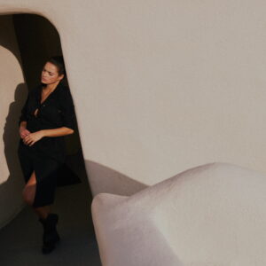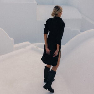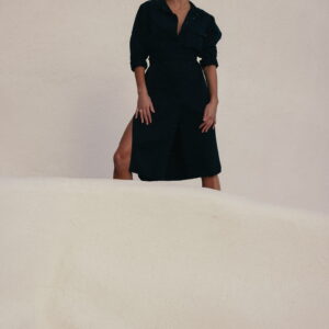 Sukienka typu oversize slim o kroju wydłużonej koszuli. Wykonana z delikatnie fakturowanej bawełny, która pomimo swojej naturalnej sztywności i wysokiej gramatury materiału, jest przyjemna w dotyku. Swobodny, lekko taliowany krój z opuszczoną linią ramion sprawia, że sukienka nie opina i nie krępuje ruchów- można czuć się w niej swobodnie. Prosty kołnierzyk oraz zapięcia na ukryte napy dodają lekko militarnego, niedbałego charaktery minimalistycznej całości.