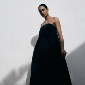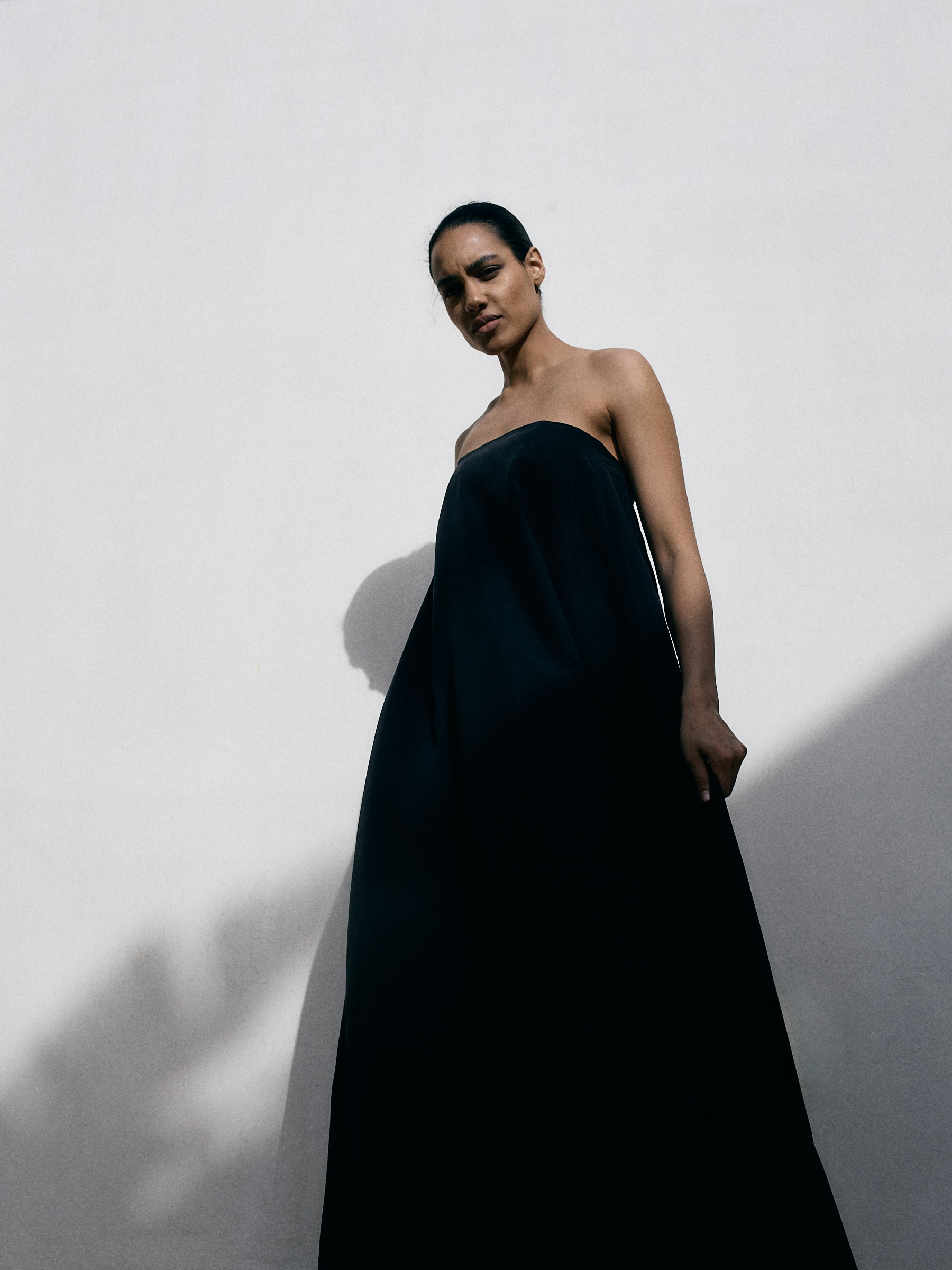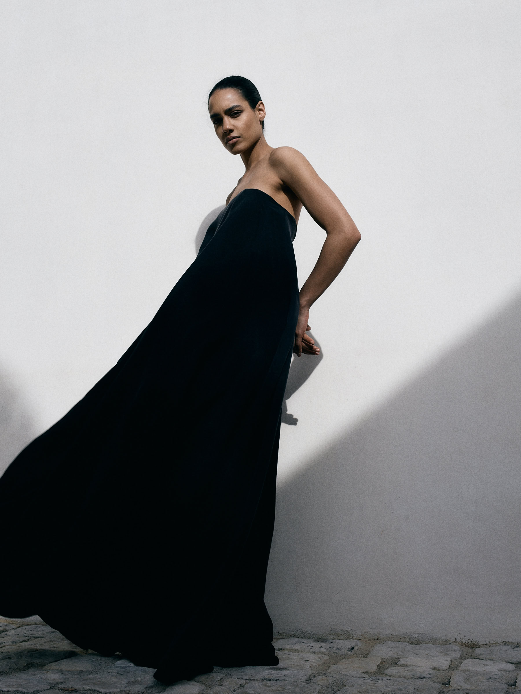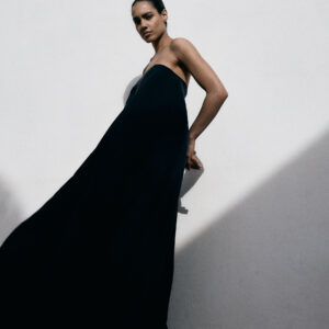 Długa, trapezowa sukienka o minimalistycznym kroju. Usztywniany gorset ukryty pod wierzchnią warstwą materiału pozwala na swobodne dopasowanie się do sylwetki i zapobiega przemieszczaniu. Pasuje do każdego rodzaju obuwia. Doskonale sprawdzi się zarówno na co dzień do pracy, jak i wieczorne wyjście.