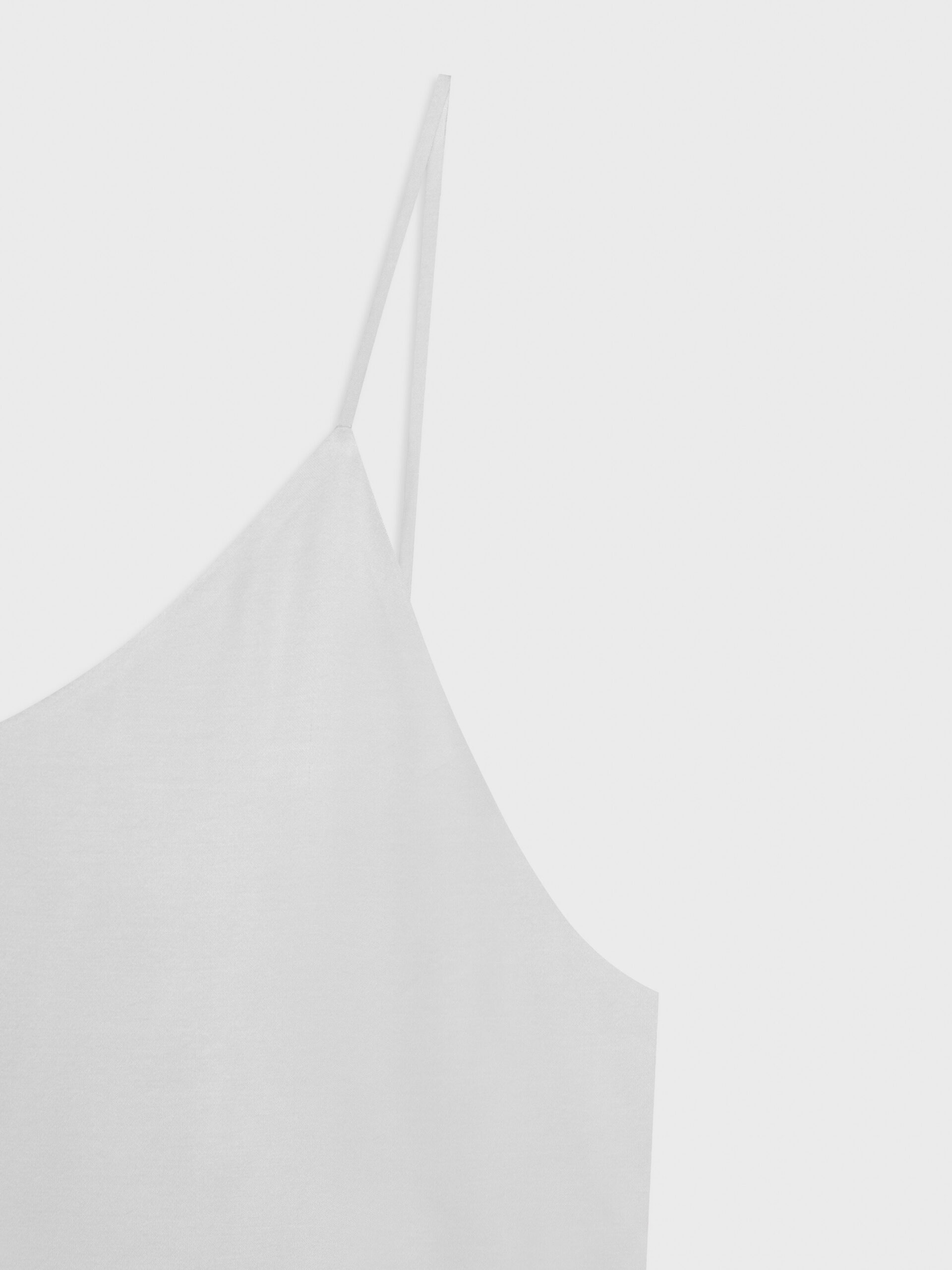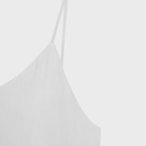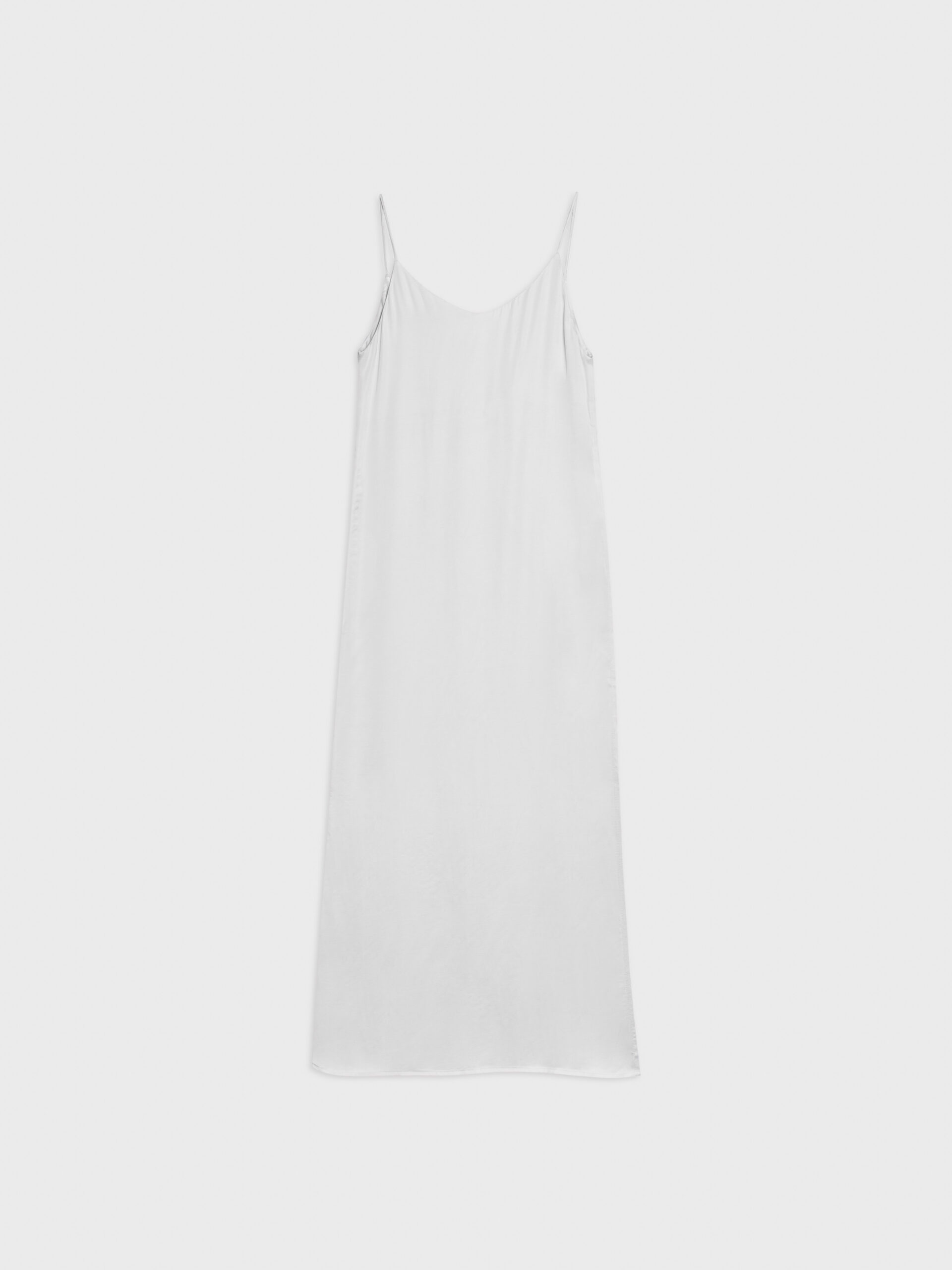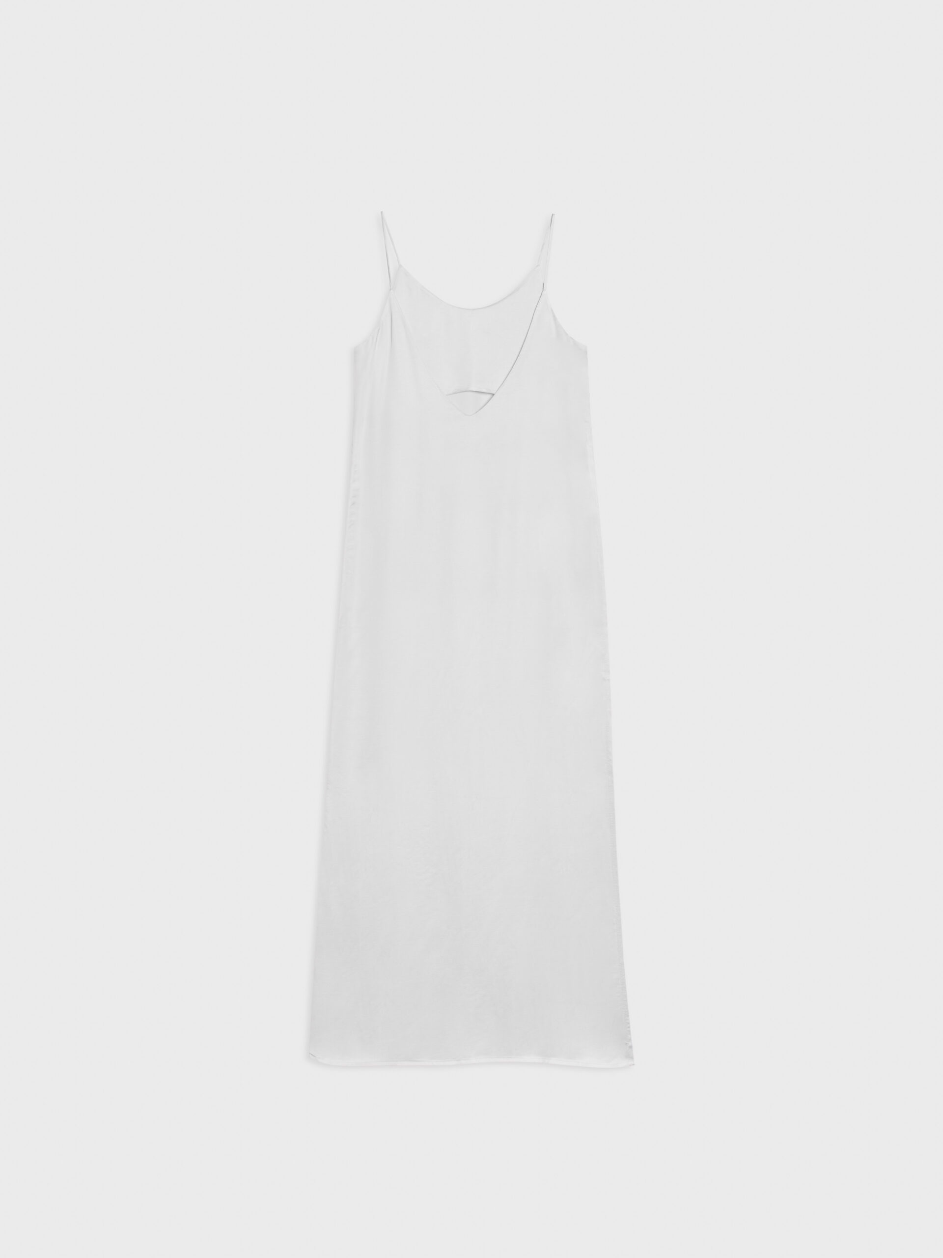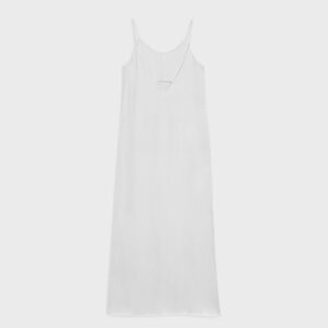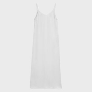 Długa, prosta sukienka na bardzo cienkich ramiączkach. Z wycięciem na lewym boku. O minimalistycznym kroju i matowym wykończeniu. Z przodu bardzo głęboki dekolt, tył wykończony w kształcie litery V. Idealna dla eleganckich jak i bardziej casualowych stylizacji.