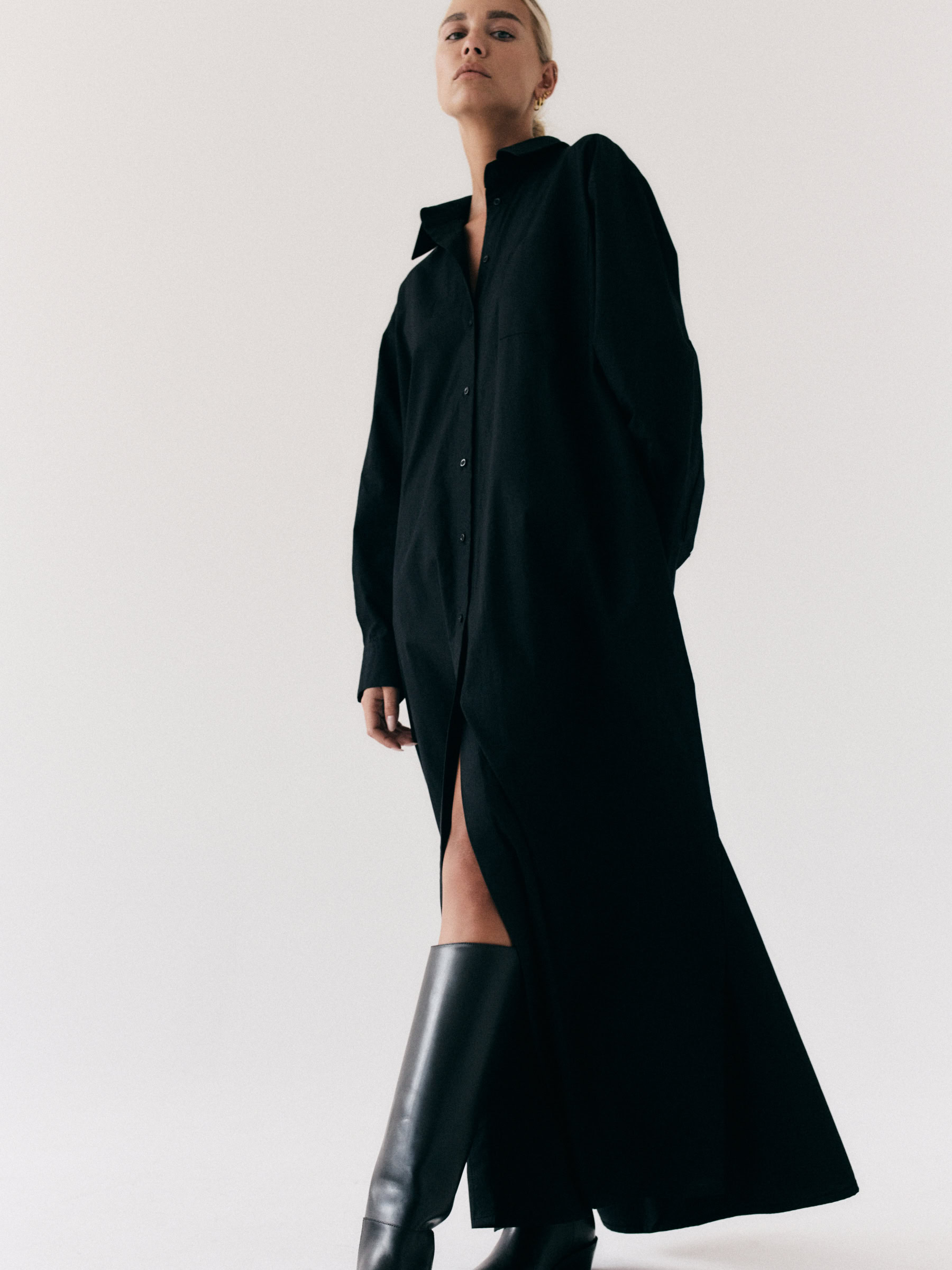 Długa, prosta, koszulowa sukienka. Minimalistyczny, lekko luźny krój podkreśla atuty sylwetki i pozwala ukryć jej mankamenty. Długość do kostek i zaczepne rozcięcia po bokach, które eksponują nogi. Sukienka wygląda świetnie zarówno sote jak i zestawiona z paskiem. Będzie stanowić doskonały zestaw z każdym rodzajem ciężkich butów lub sandałów. Sprawdzi się nie tylko na codzień, ale także w wieczorowej wersji.