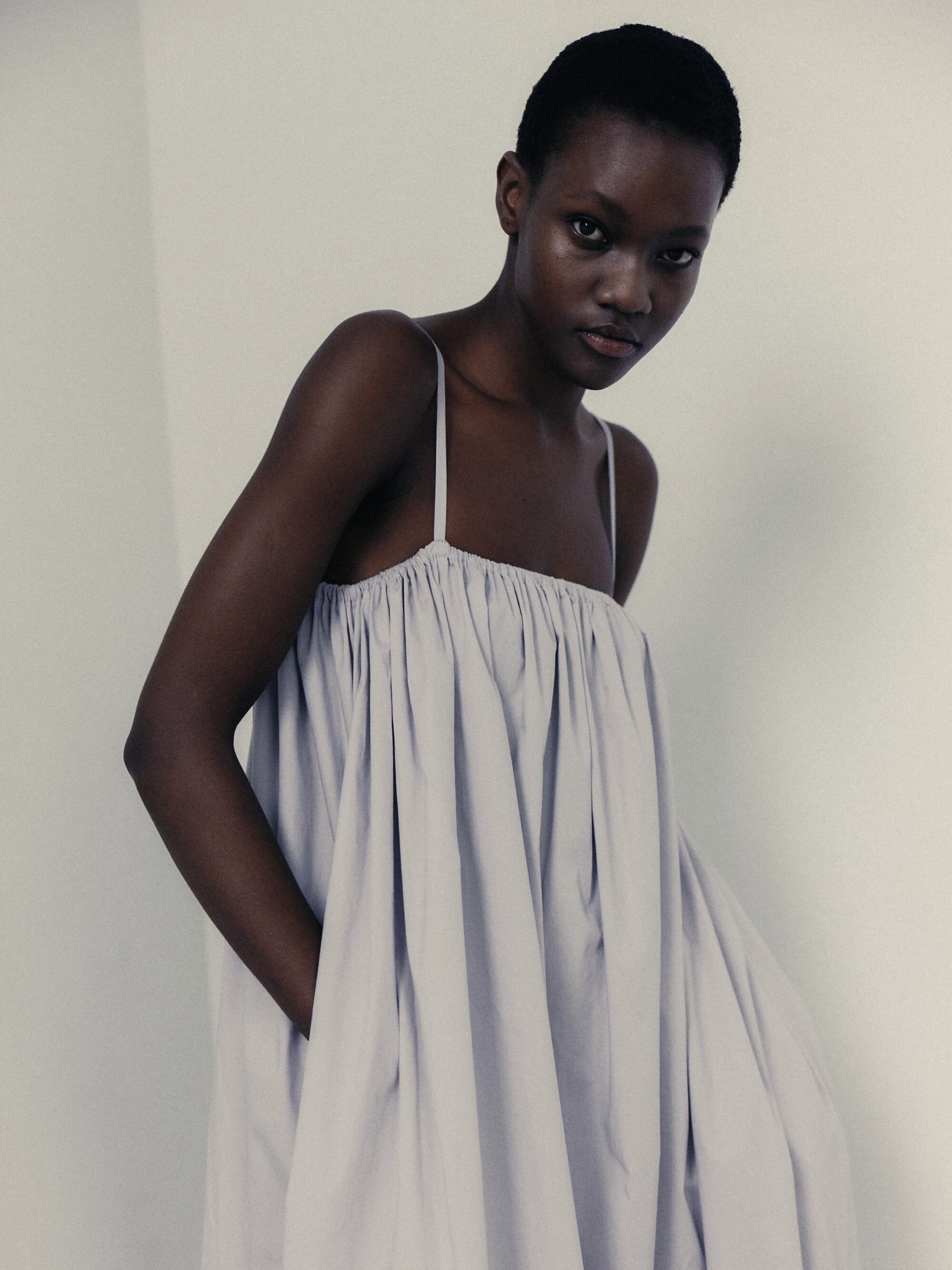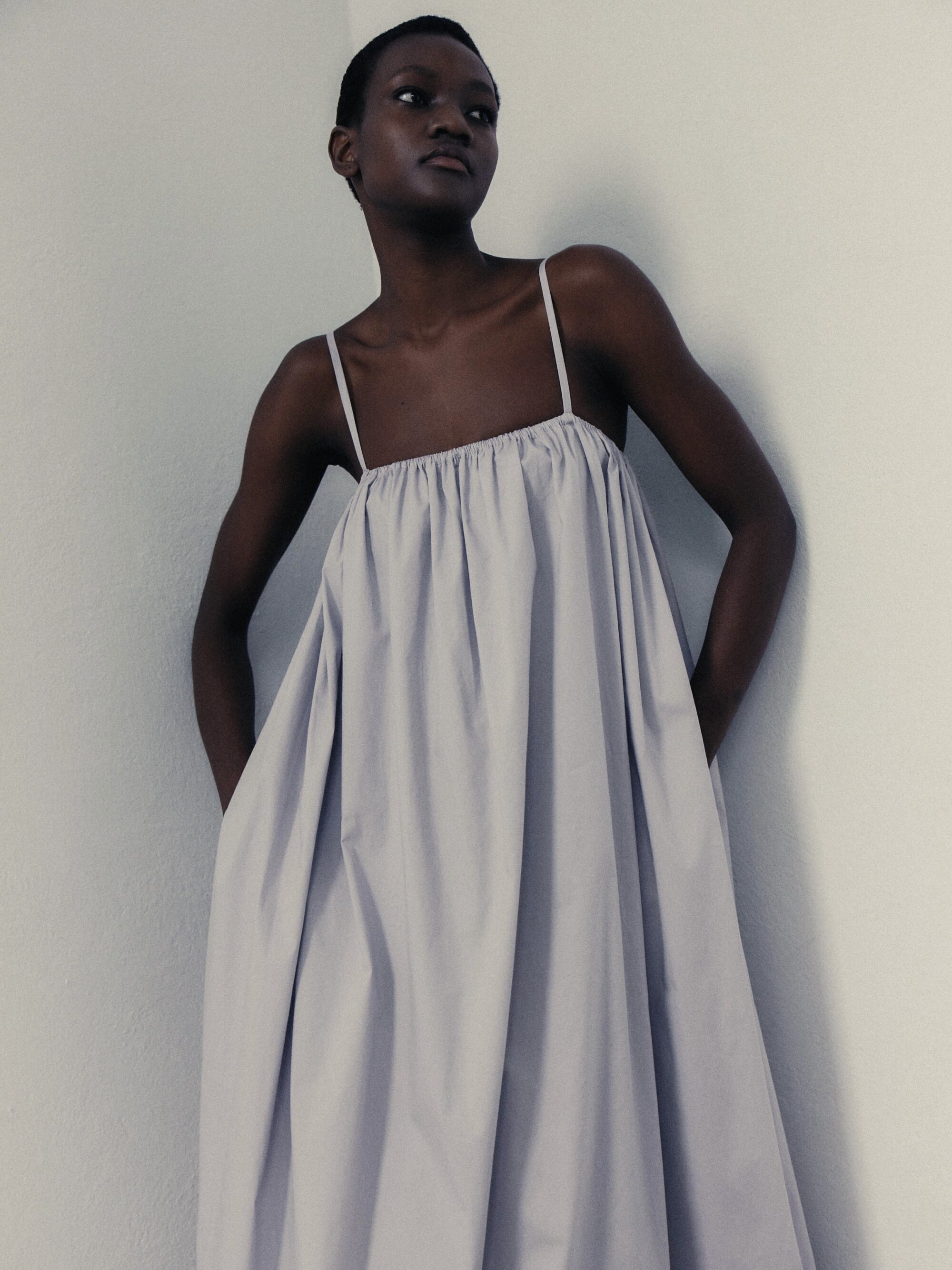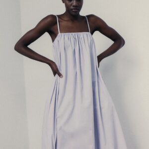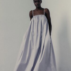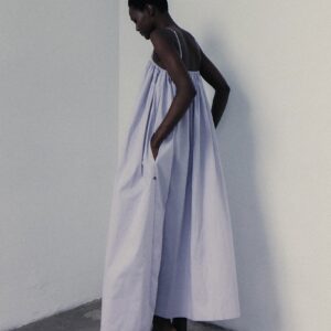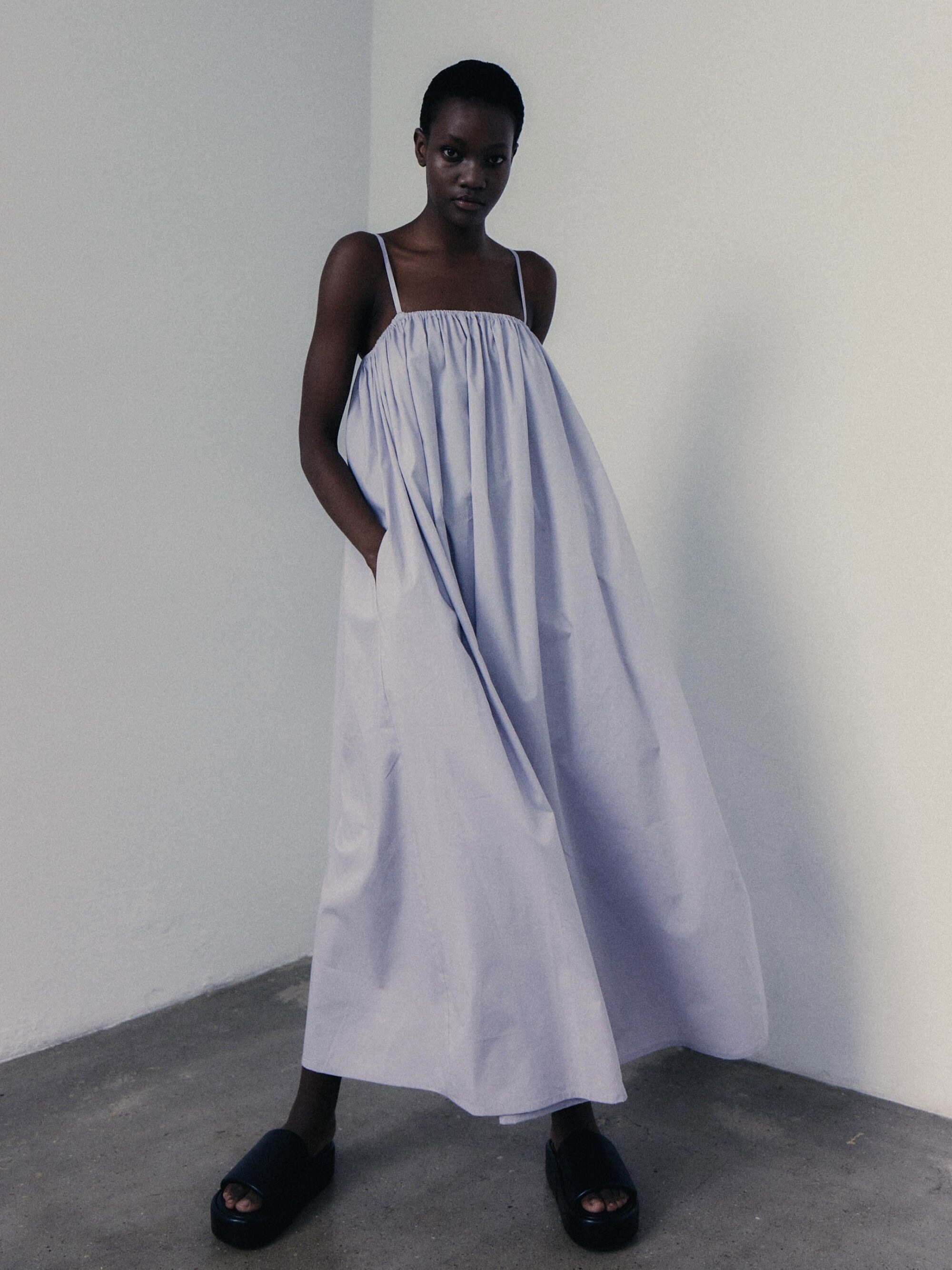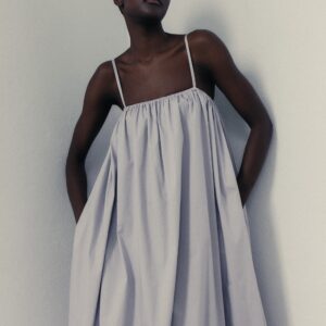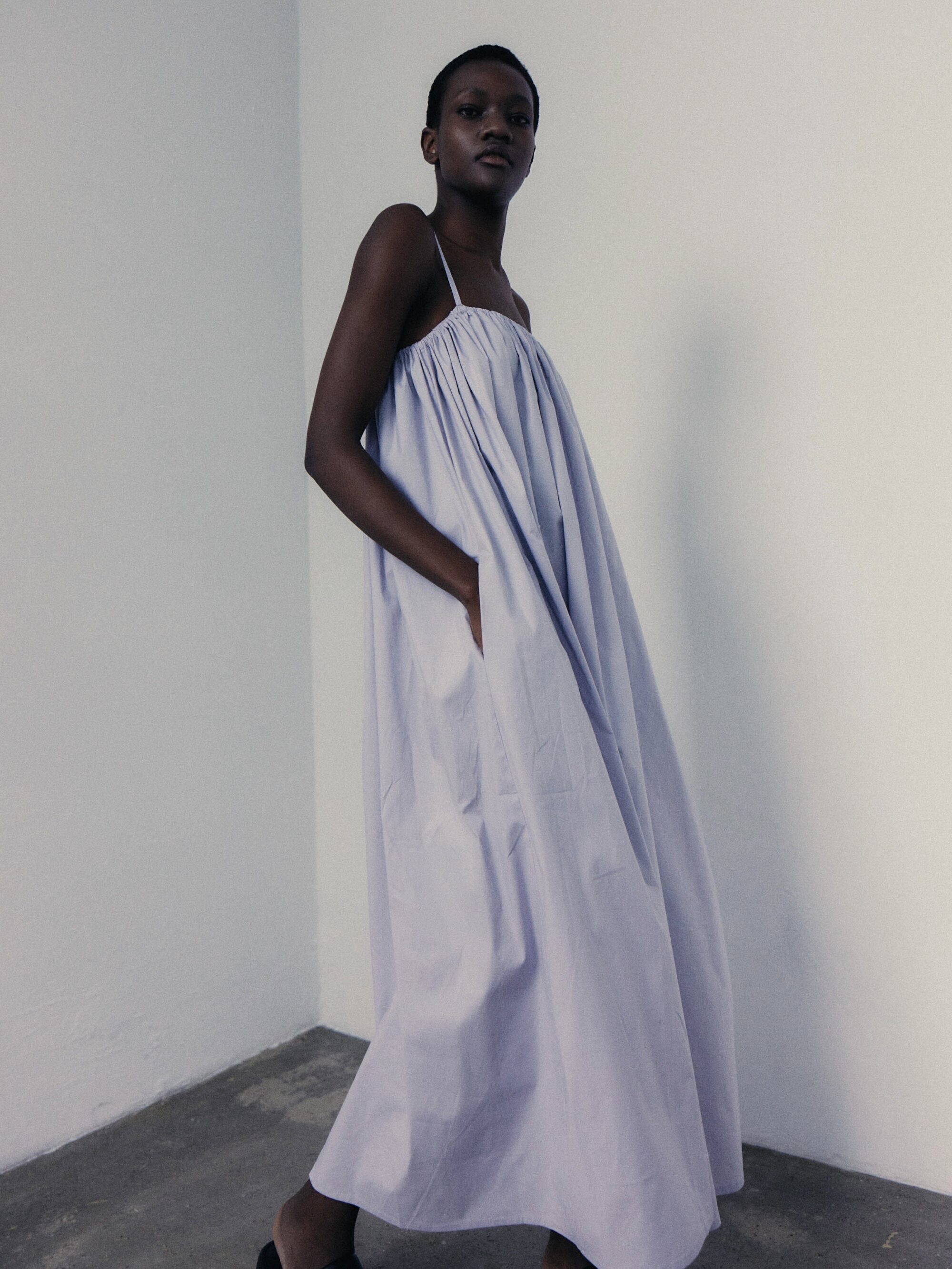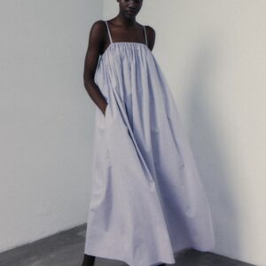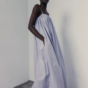 Długa, trapezowa sukienka z ultra cienkimi, regulowanymi ramiączkami. Delikatna guma wszyta przy dekolcie pozwala na swobodne dopasowanie się do sylwetki. Model posiada również dwie funkcjonalne kieszenie ukryte w bocznym szwie. Pasuje do każdego rodzaju obuwia. Doskonale sprawdzi się zarówno na co dzień do pracy, jak i wieczorne wyjście.