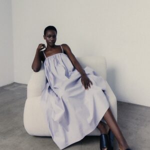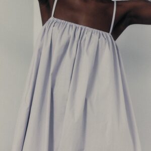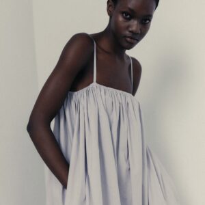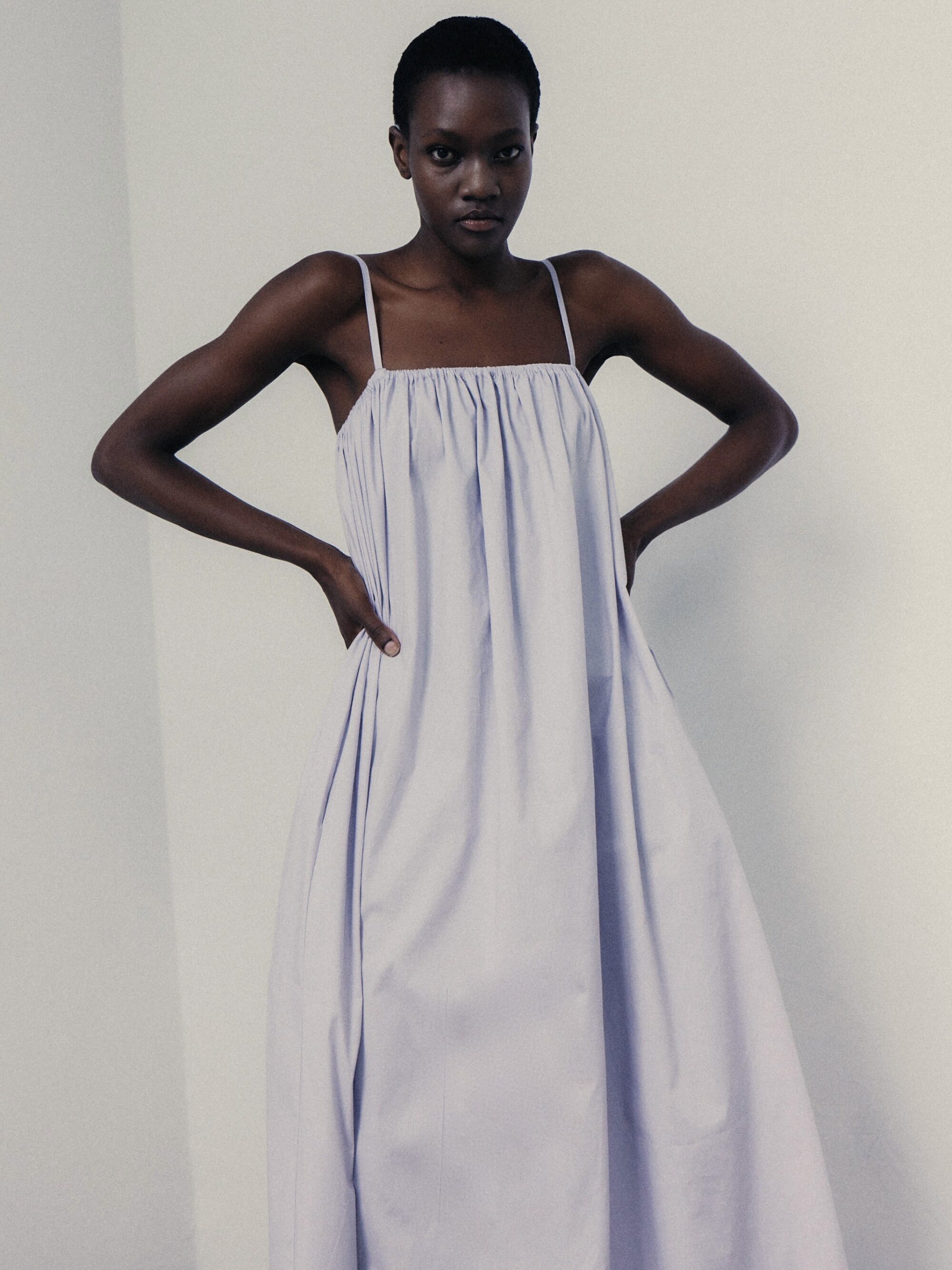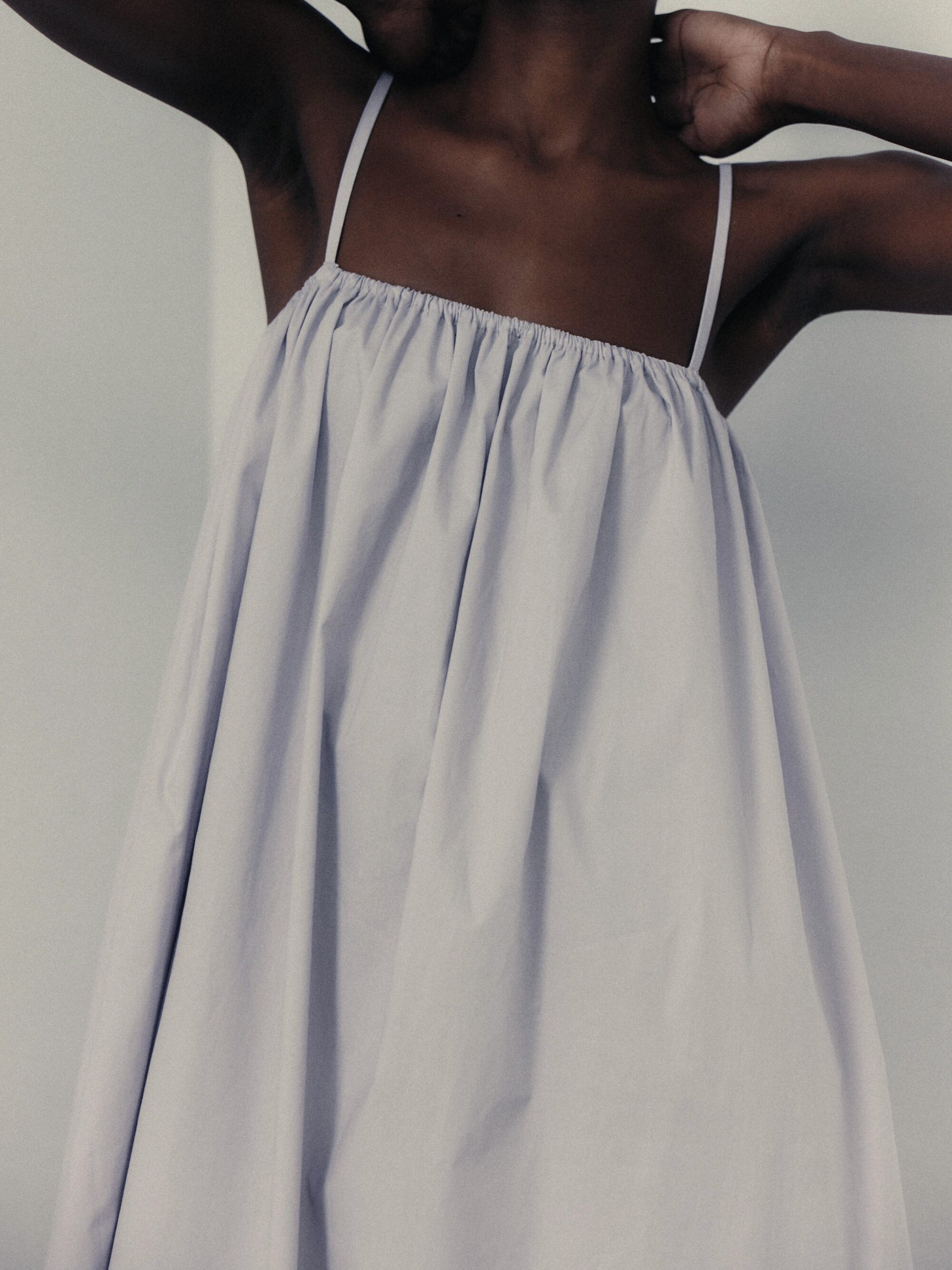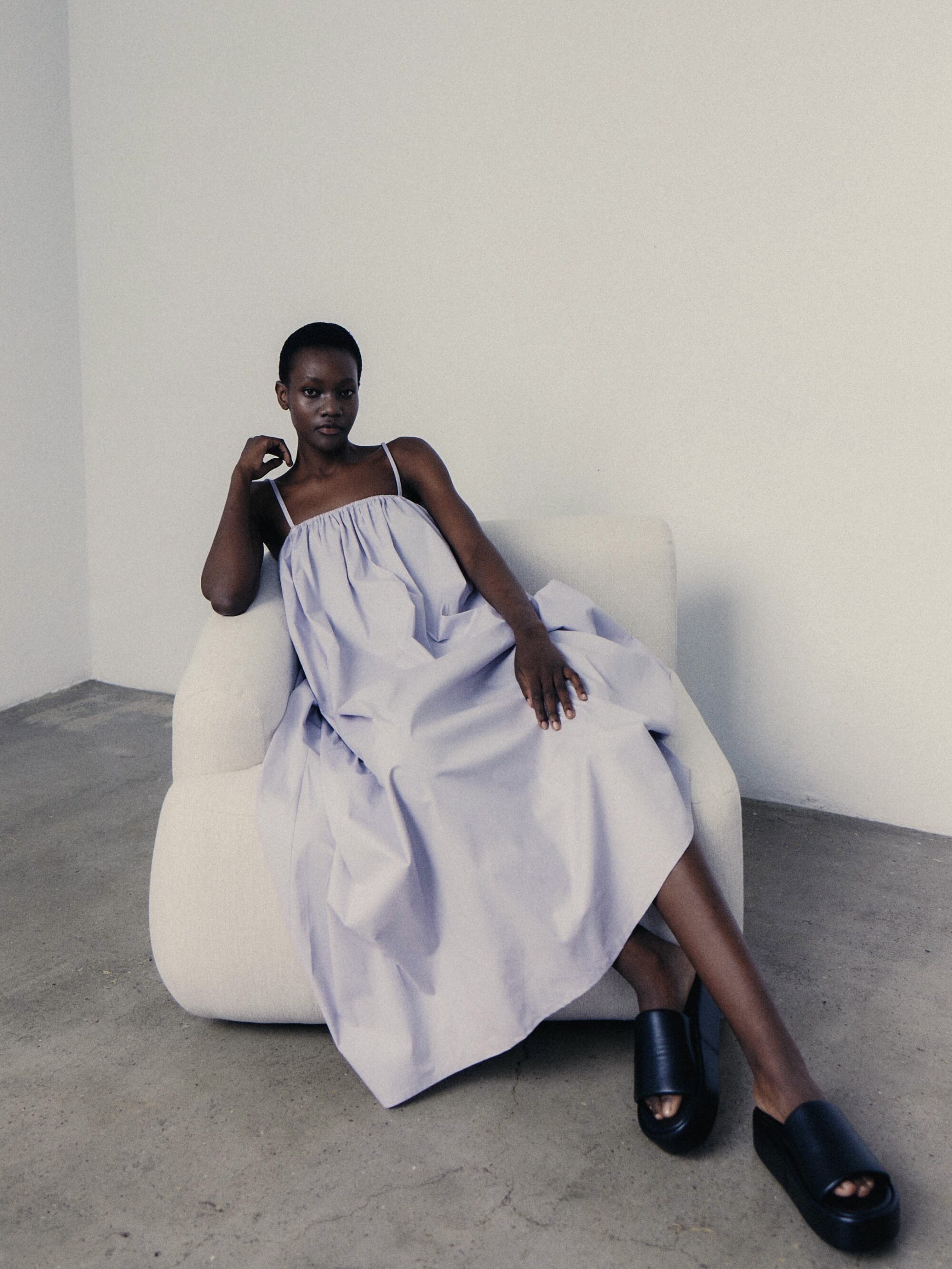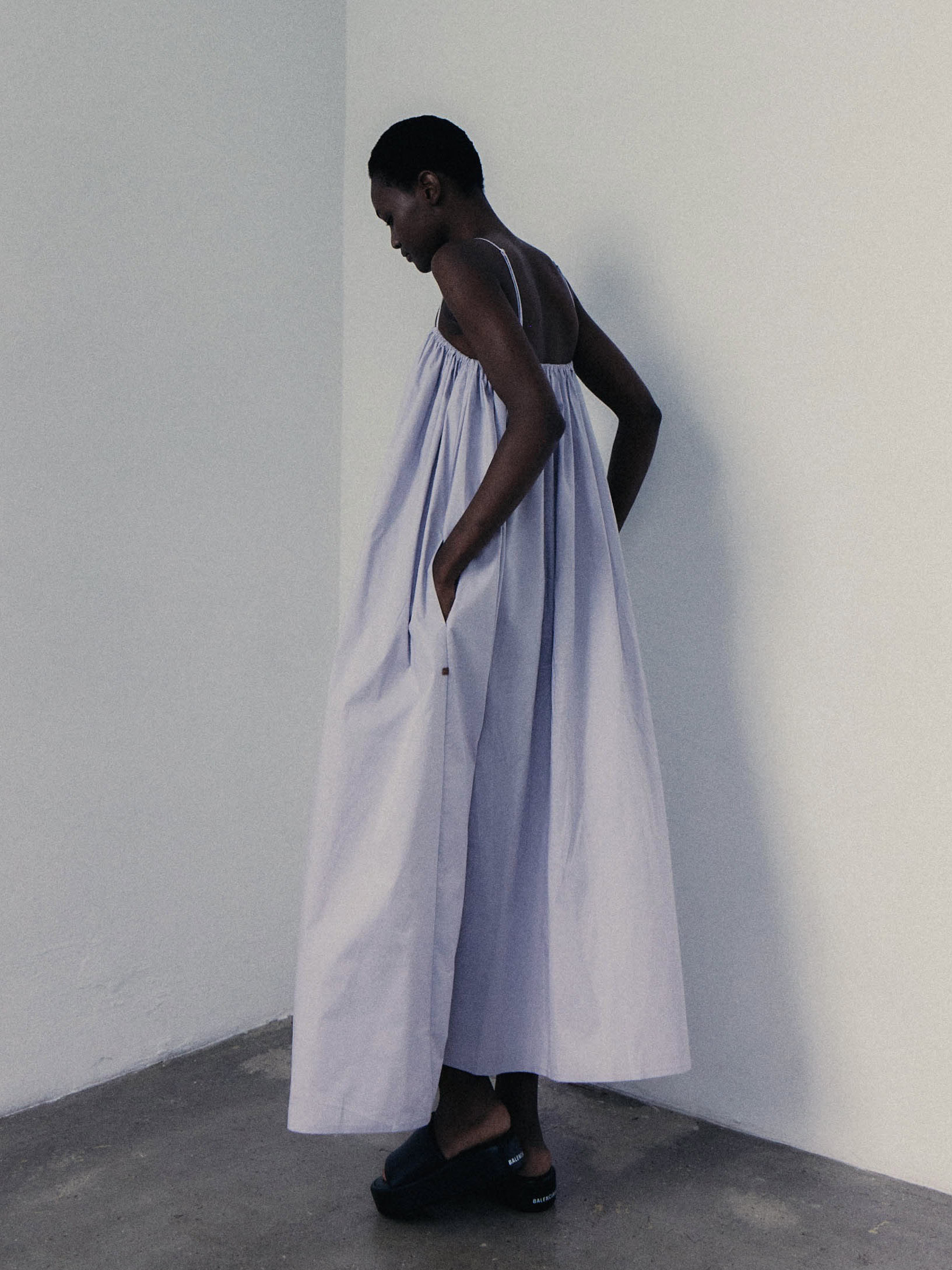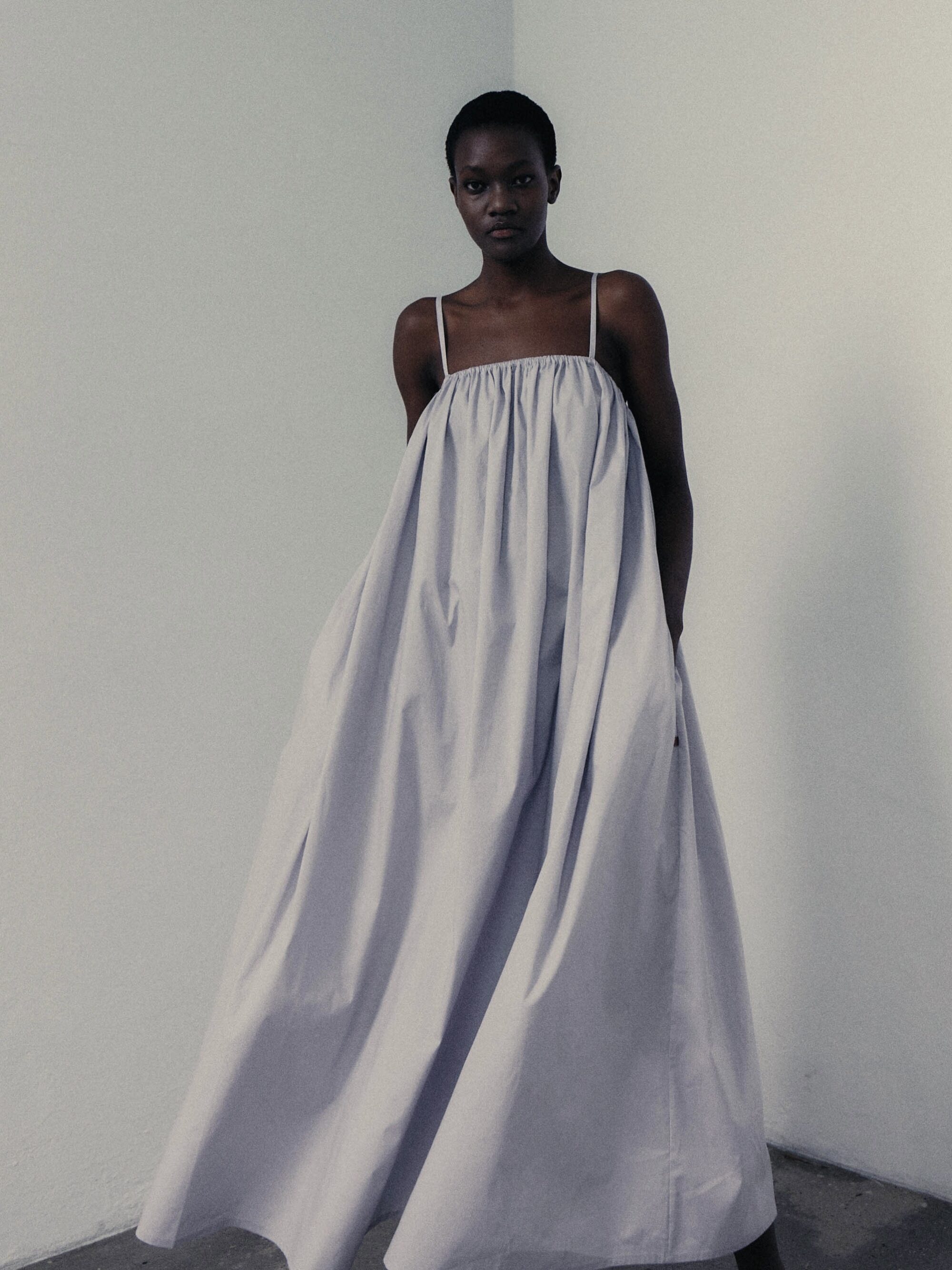 Długa, trapezowa sukienka z ultra cienkimi, regulowanymi ramiączkami. Delikatna guma wszyta przy dekolcie pozwala na swobodne dopasowanie się do sylwetki. Model posiada również dwie funkcjonalne kieszenie ukryte w bocznym szwie. Pasuje do każdego rodzaju obuwia. Doskonale sprawdzi się zarówno na co dzień do pracy, jak i wieczorne wyjście.