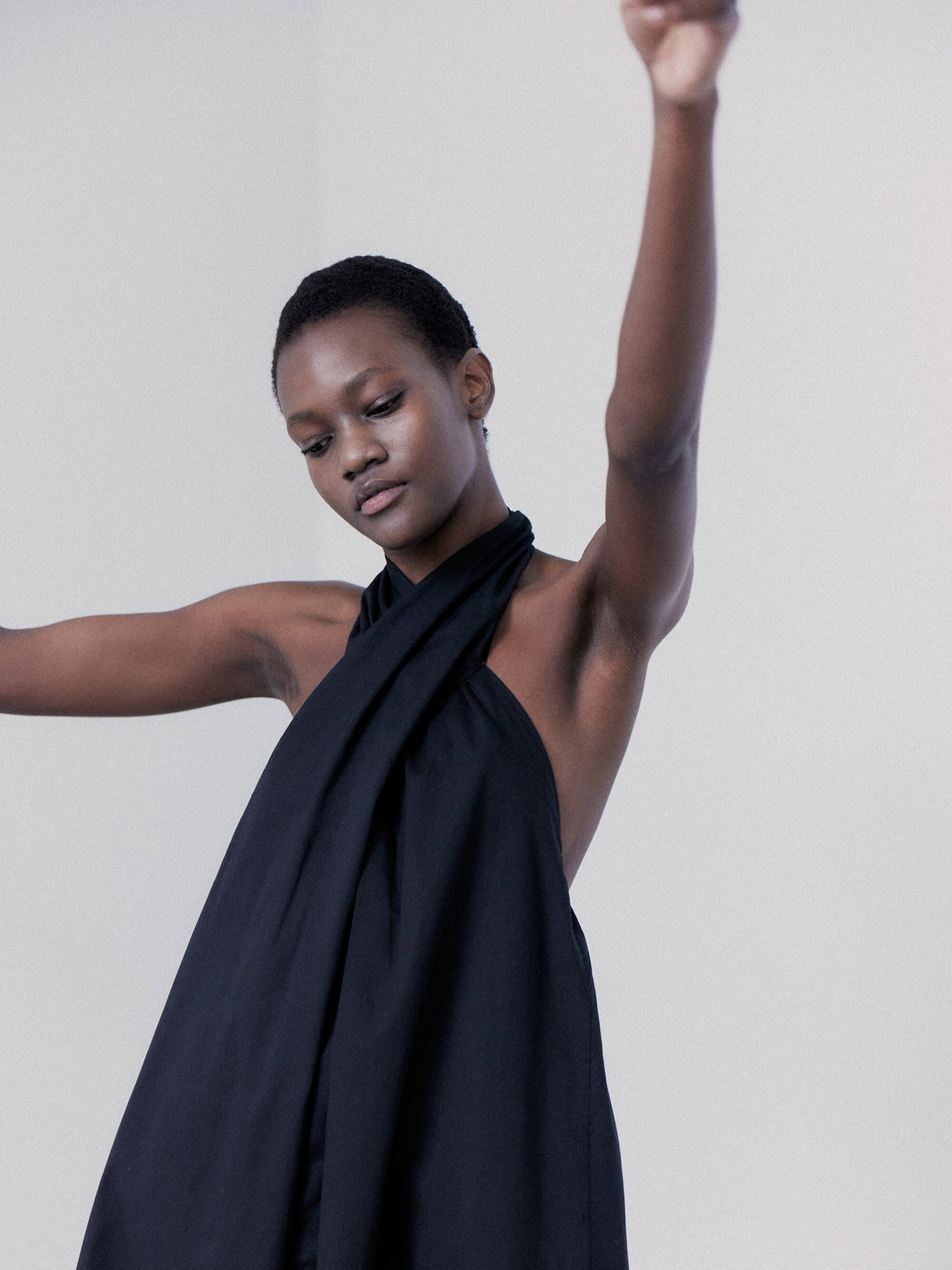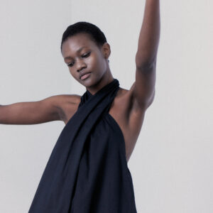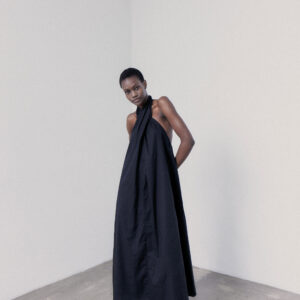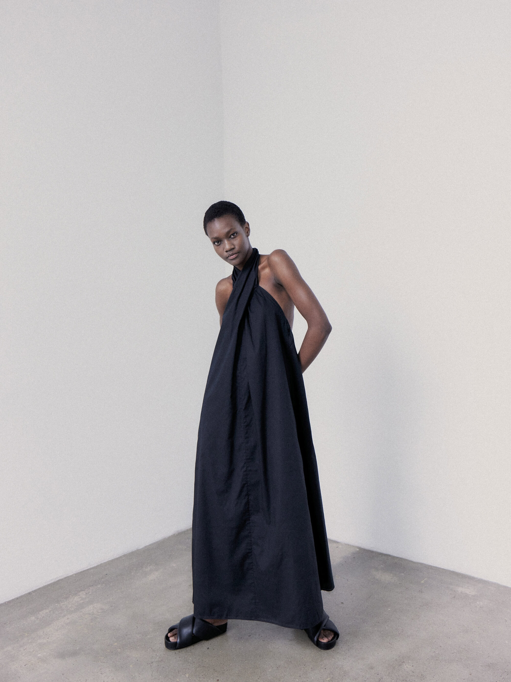 Długa, delikatnie rozkloszowana sukienka, z ozdobnym wiązaniem na szyi zapinanym na haftki. Luźny, prosty krój przełamany głębokim wycięciem z tylu podkreślającym linię pleców. Z tyłu wszyta delikatna gumka zapewniająca wygodę. Idealna na każdą okazję. Sprawdzi się zarówno na co dzień, jak i wieczorne wyjście.