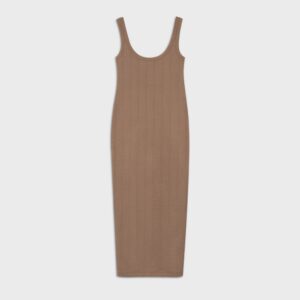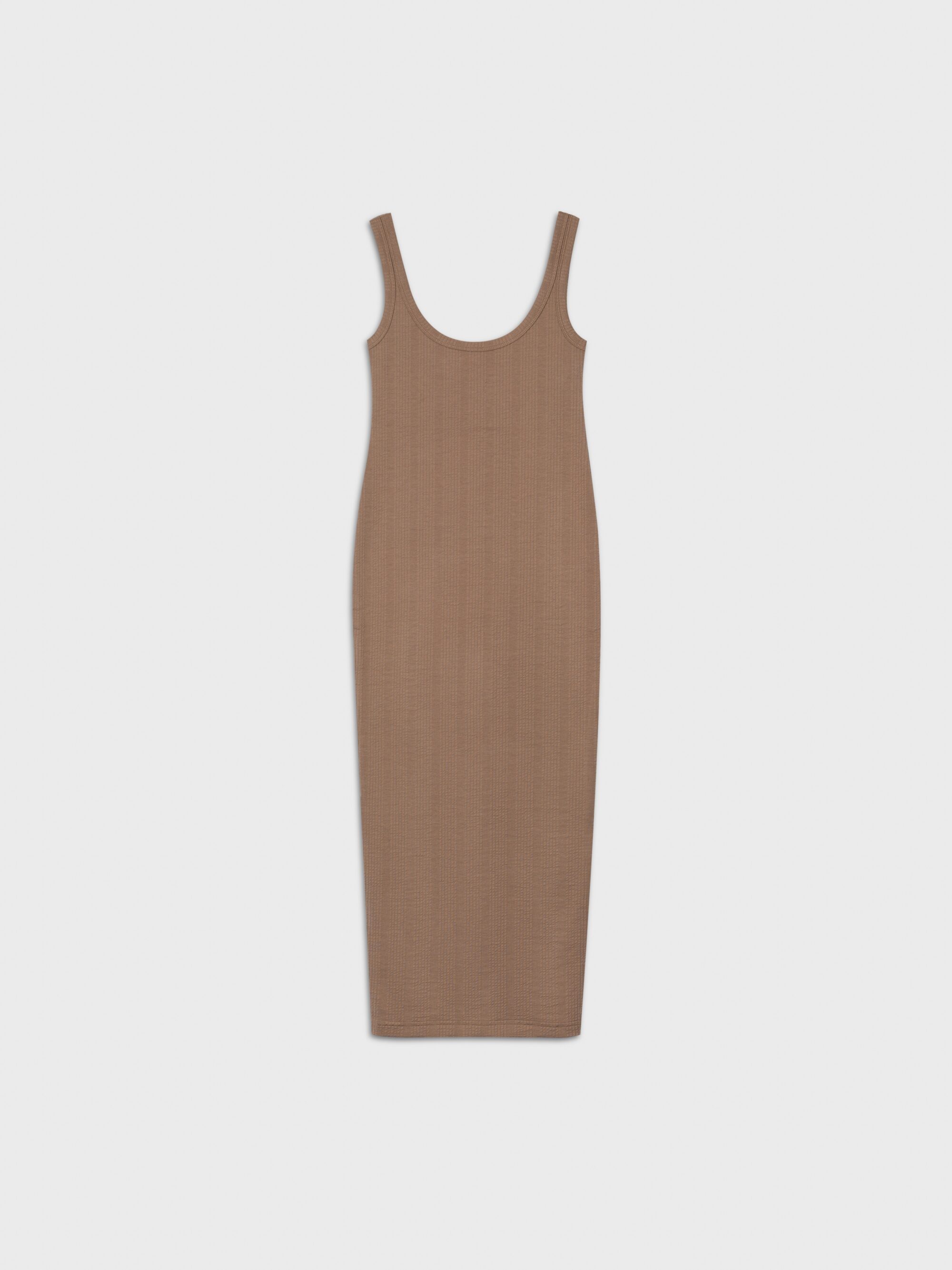 Delikatnie dopasowana sukienka na grubych ramiączkach, o długości do połowy łydek, z mocno wyciętym dekoltem. Wykonana z bawełny, z dodatkiem elastanu, o strukturze nieregularnego prążka. Doskonale wygląda sote (gramatura materiału jest na tyle duża, że spokojnie można nosić ją bez bielizny) do każdego rodzaju sandałów i ciężkich butów. W chłodniejsze dni wygląda doskonale w monochromatycznym zestawie z koszulą z krótkim rękawem POCHE off-white.