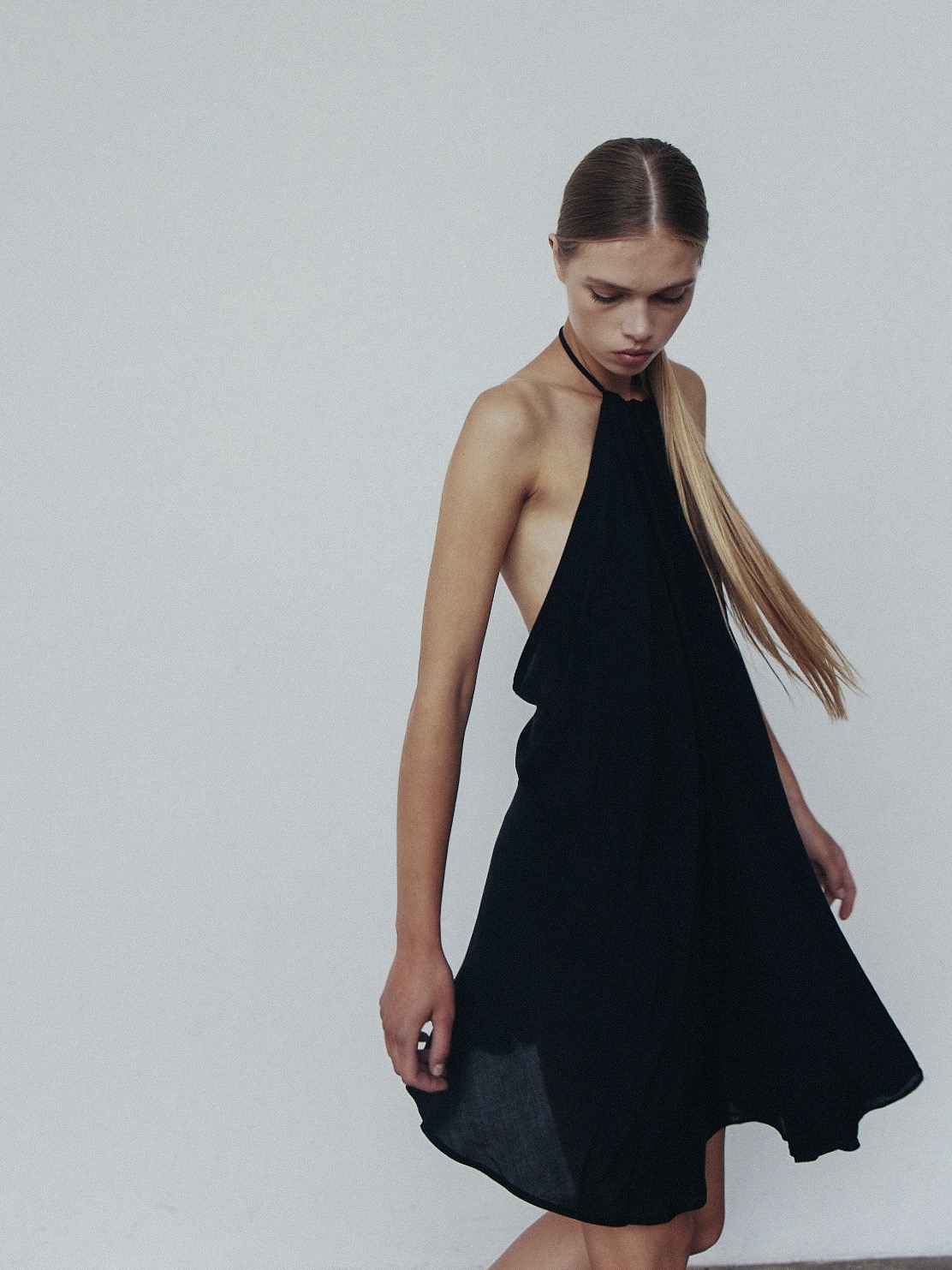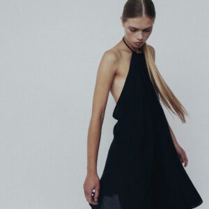 Krótka, delikatnie rozkloszowana sukienka, z ozdobnym wiązaniem na szyi. Głębokie wycięcie na plecach w kształcie litery V dopełnia całości i doskonale podkreśla linię pleców. Sukienkę można regulować, dopasowuje się do kształtu sylwetki. Idealna na każdą okazję. Sprawdzi się zarówno na co dzień, jak i wieczorne wyjście.