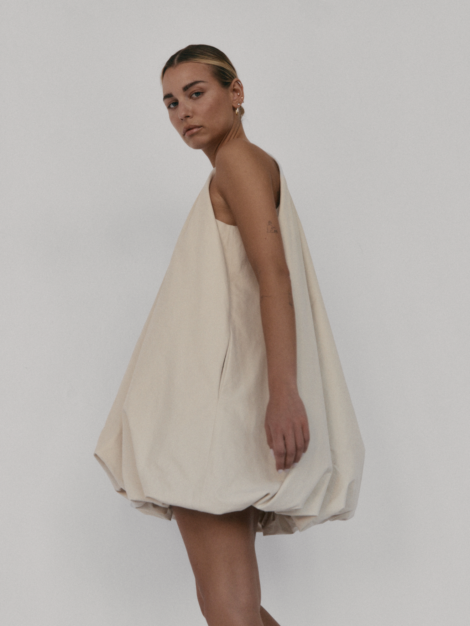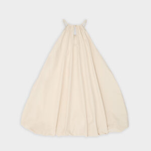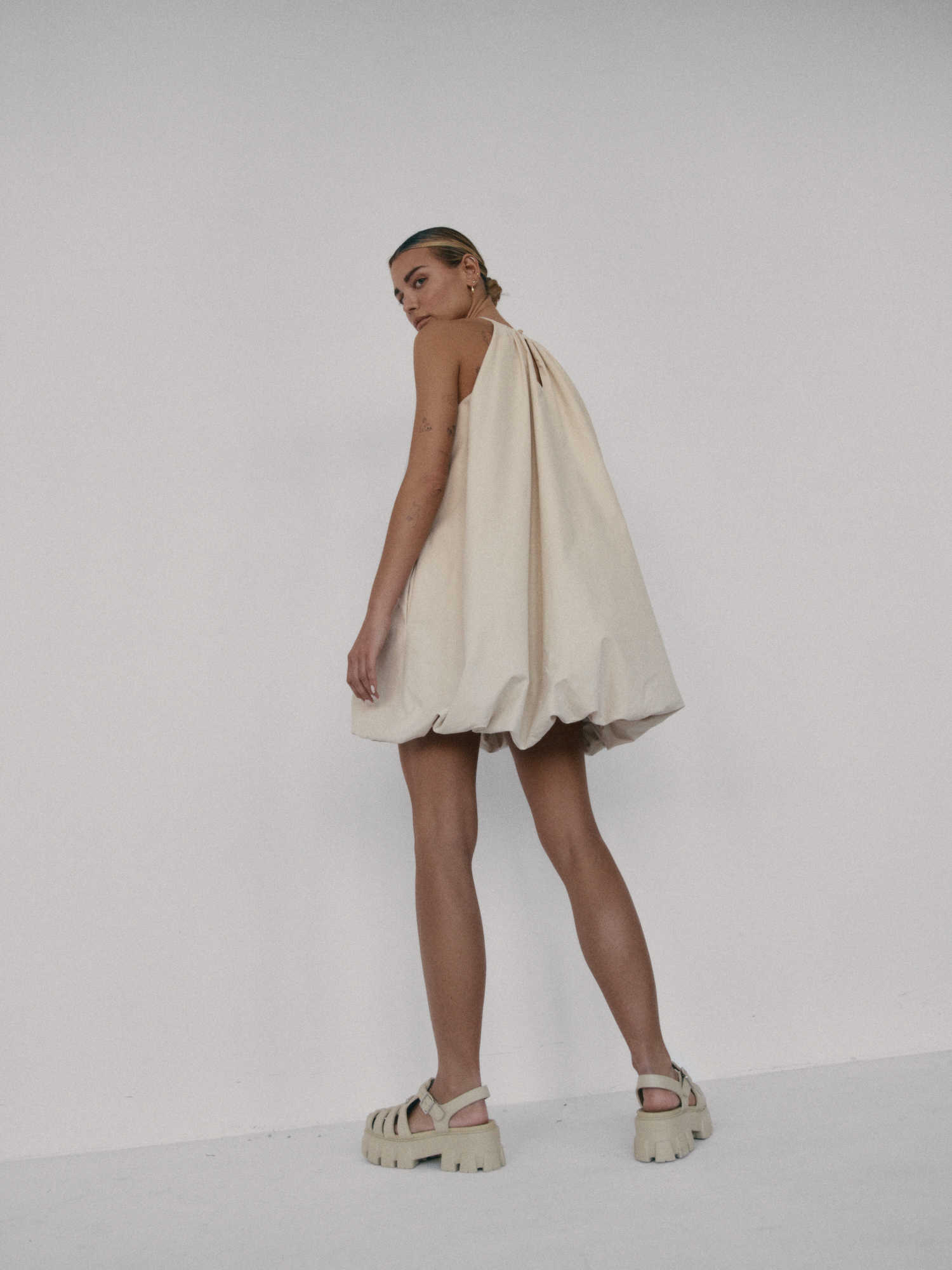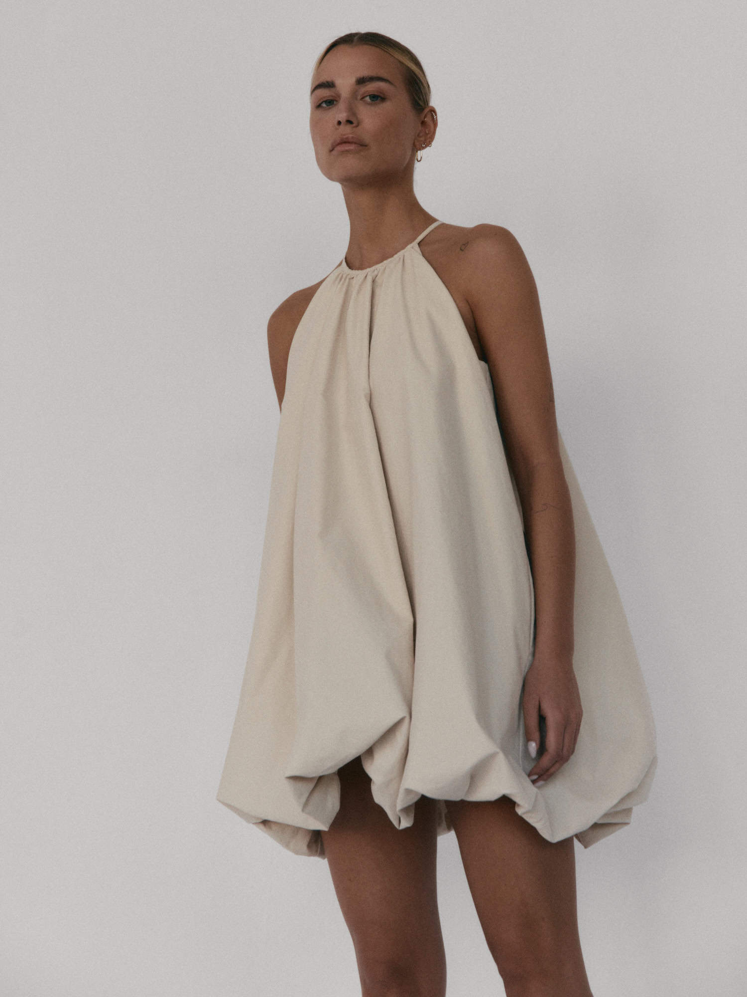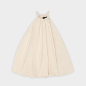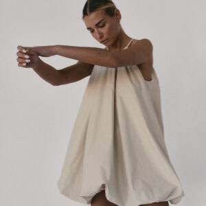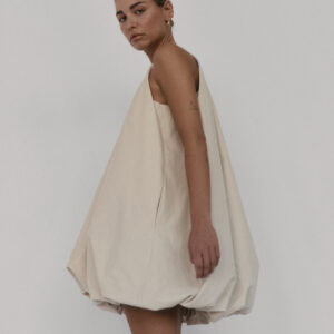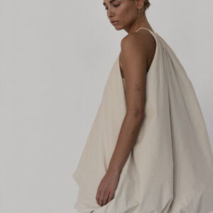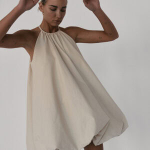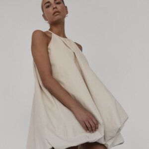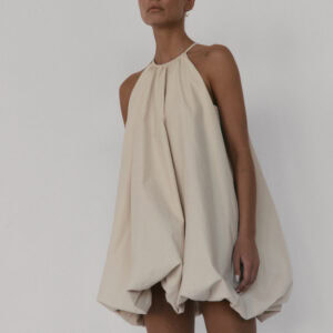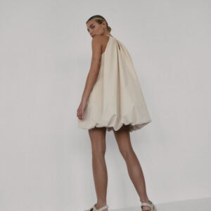 Krótka sukienka o kroju bombki. Sukienka wykończona jest zawiniętym do środka materiałem, co nadaje jej unikalny kształt. Model posiada funkcjonalne kieszenie oraz wysoki dekolt zapinany z tyłu na guzik. Oversize’owy krój pozwala ukryć mankamenty sylwetki.