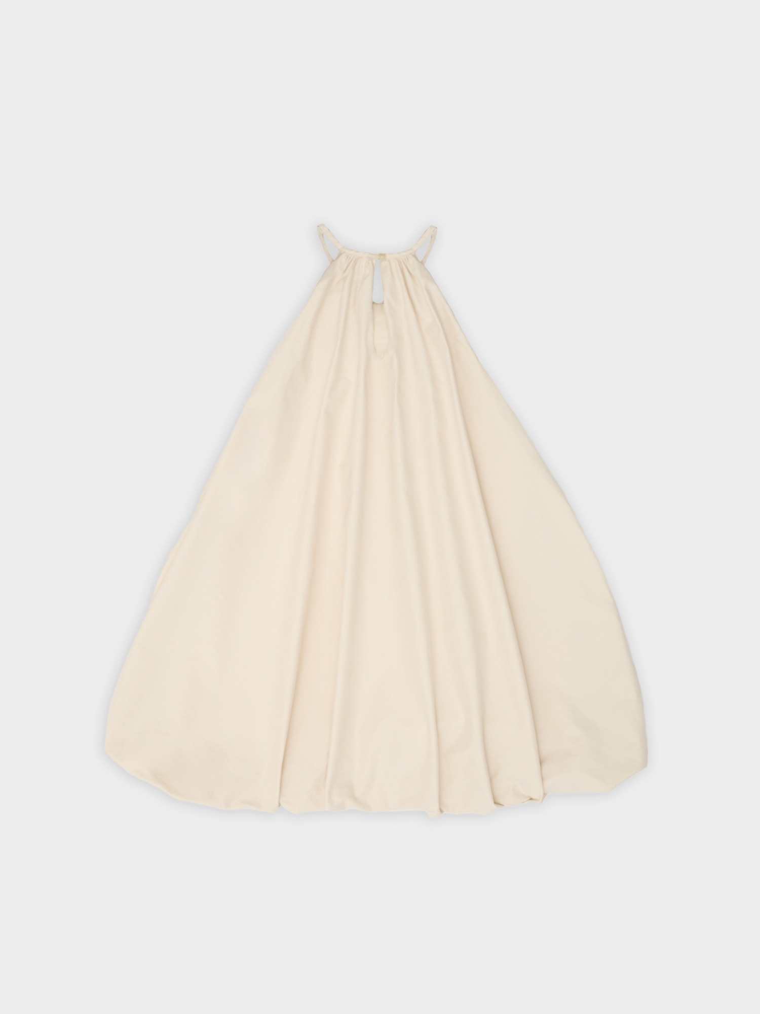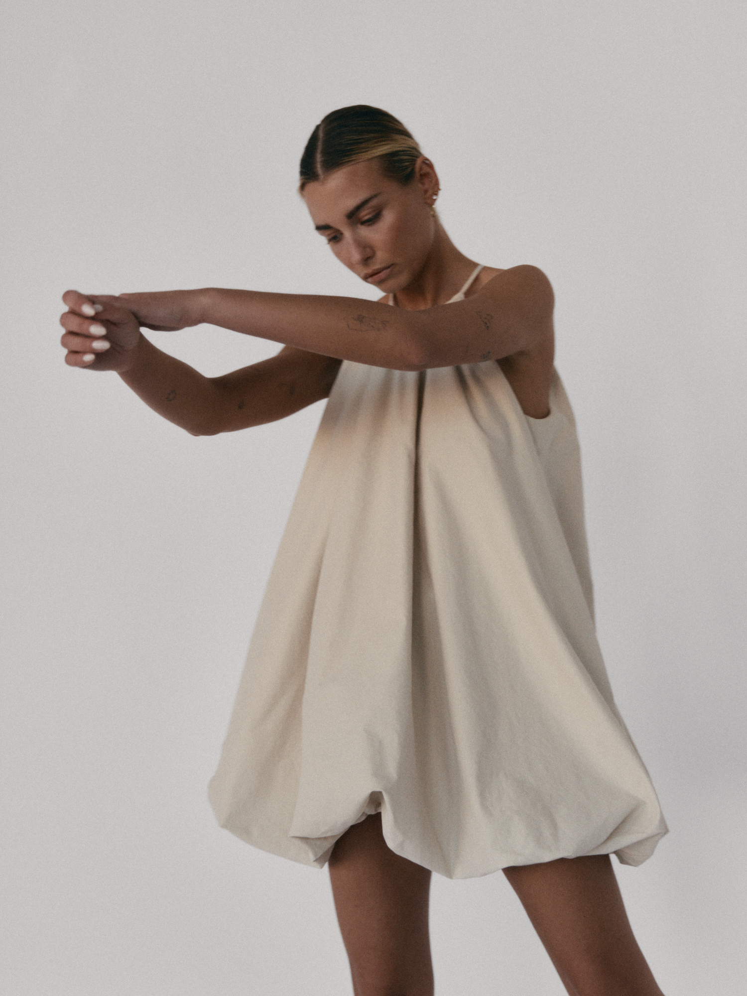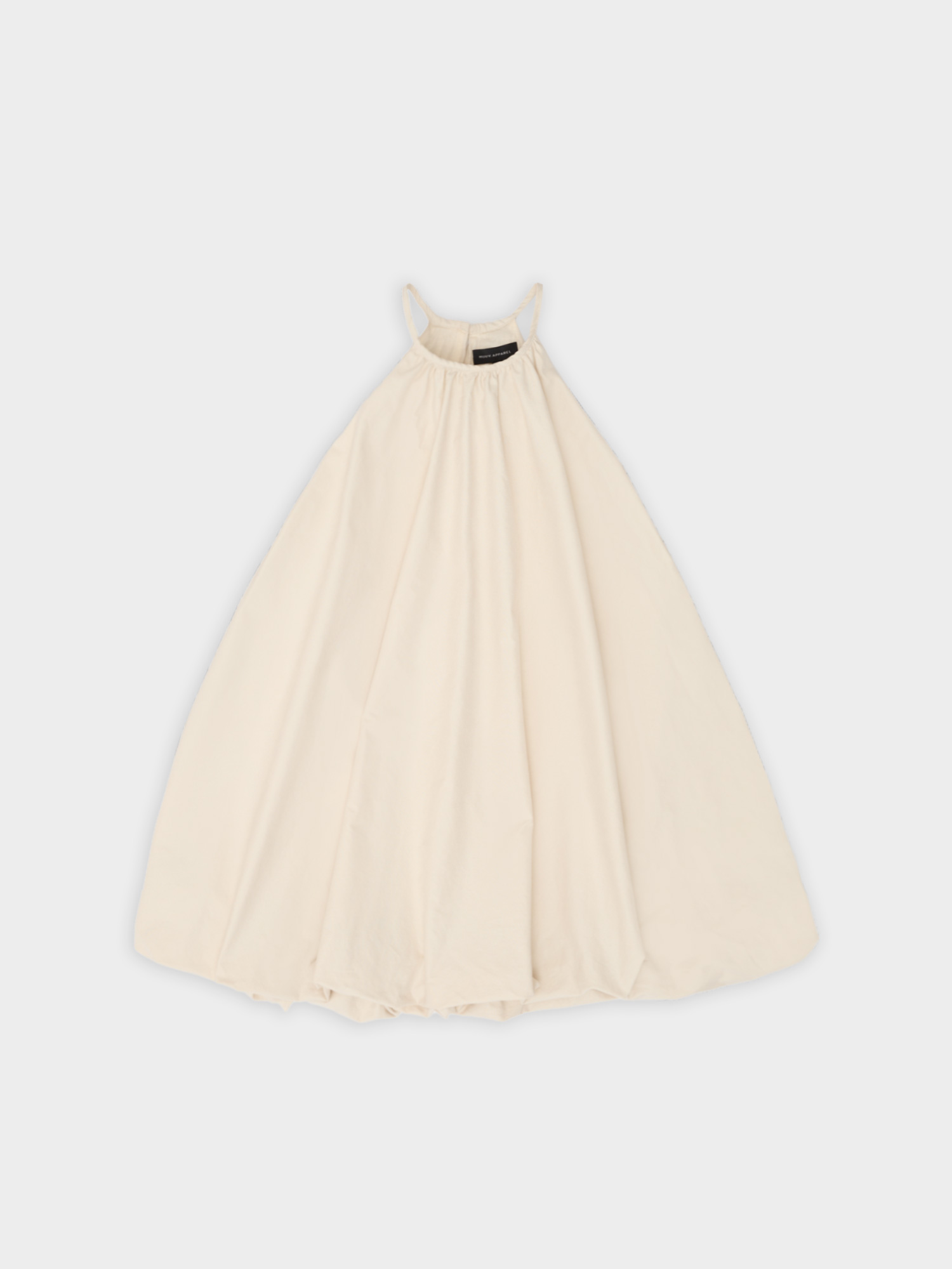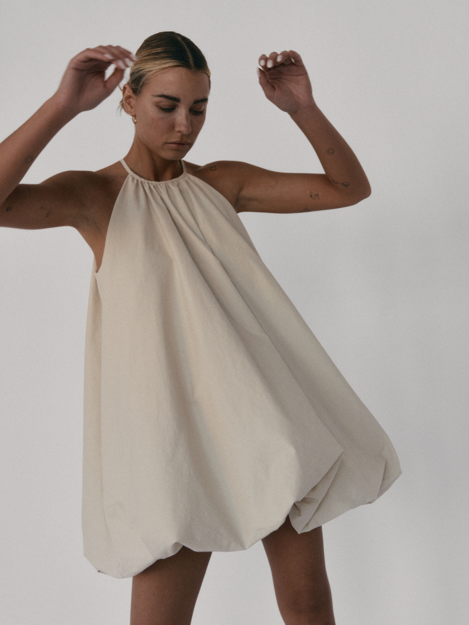 Krótka sukienka o kroju bombki. Sukienka wykończona jest zawiniętym do środka materiałem, co nadaje jej unikalny kształt. Model posiada funkcjonalne kieszenie oraz wysoki dekolt zapinany z tyłu na guzik. Oversize’owy krój pozwala ukryć mankamenty sylwetki.