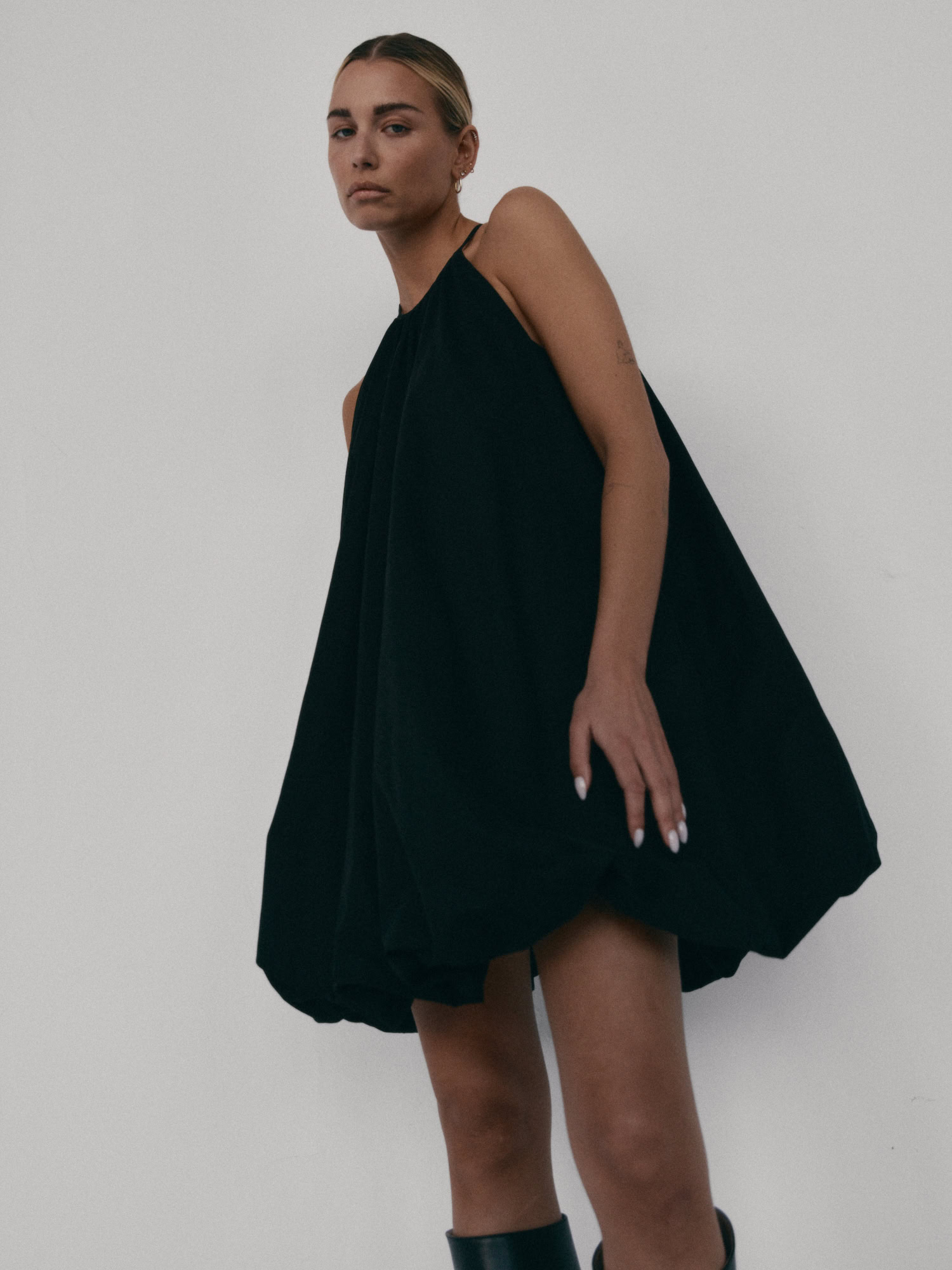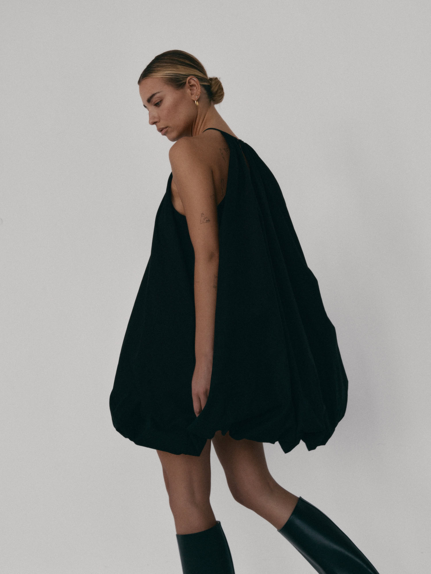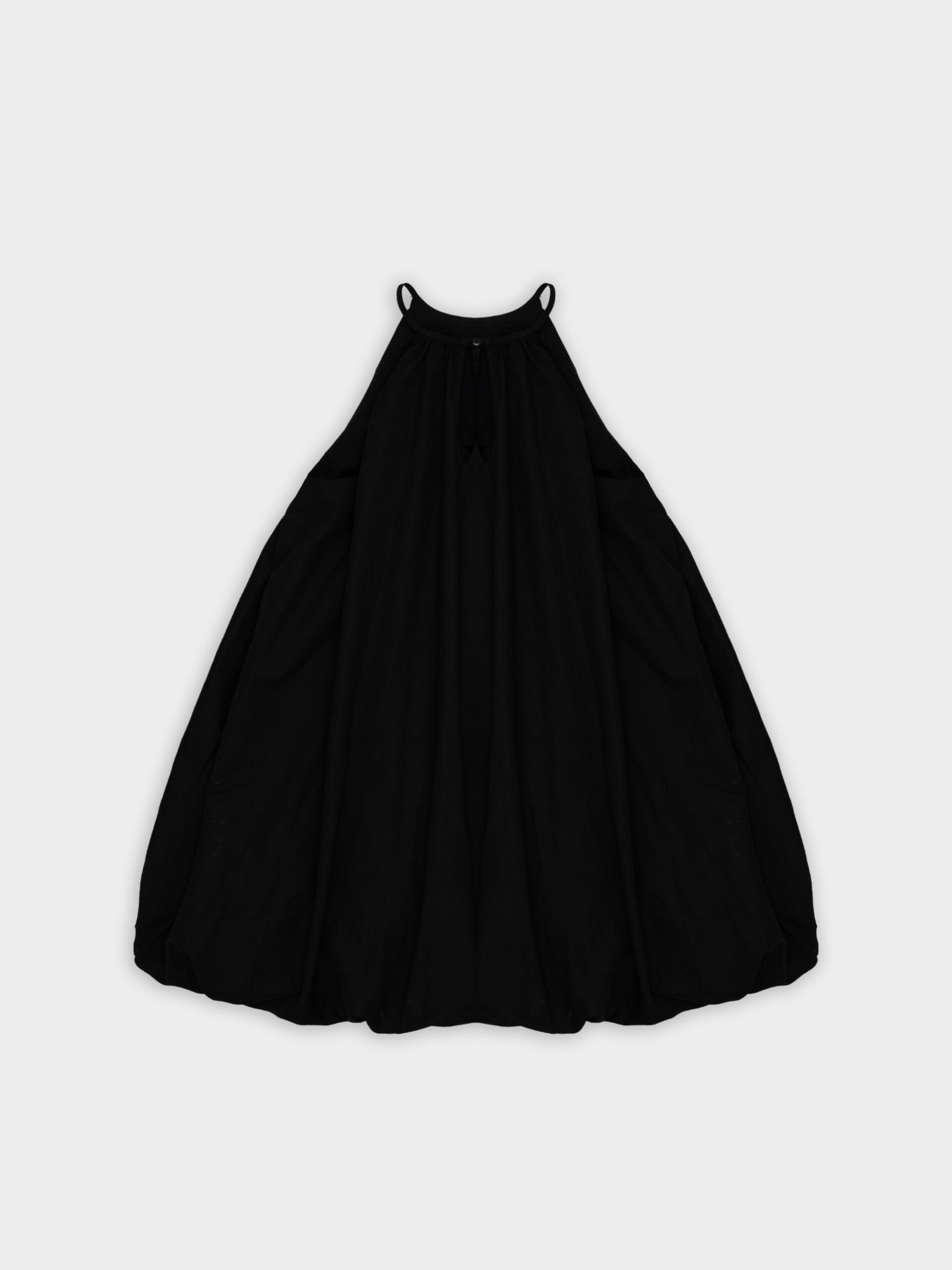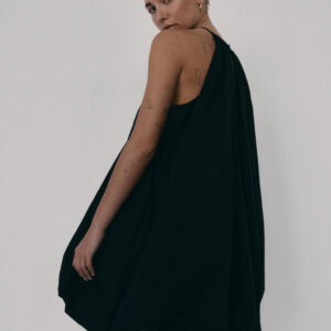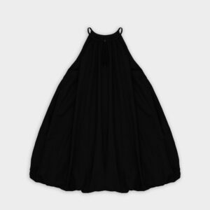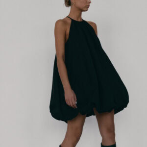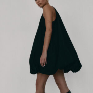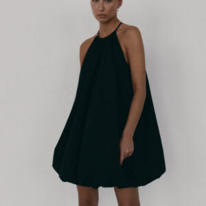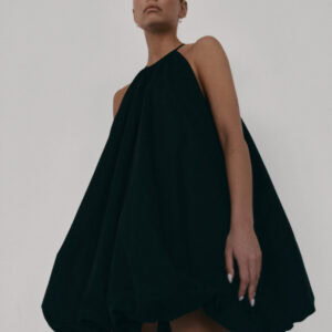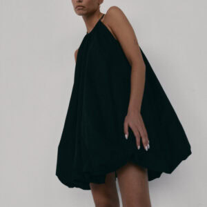 Krótka sukienka o kroju bombki. Sukienka wykończona jest zawiniętym do środka materiałem, co nadaje jej unikalny kształt. Model posiada funkcjonalne kieszenie oraz wysoki dekolt zapinany z tyłu na guzik. Oversize’owy krój pozwala ukryć mankamenty sylwetki.