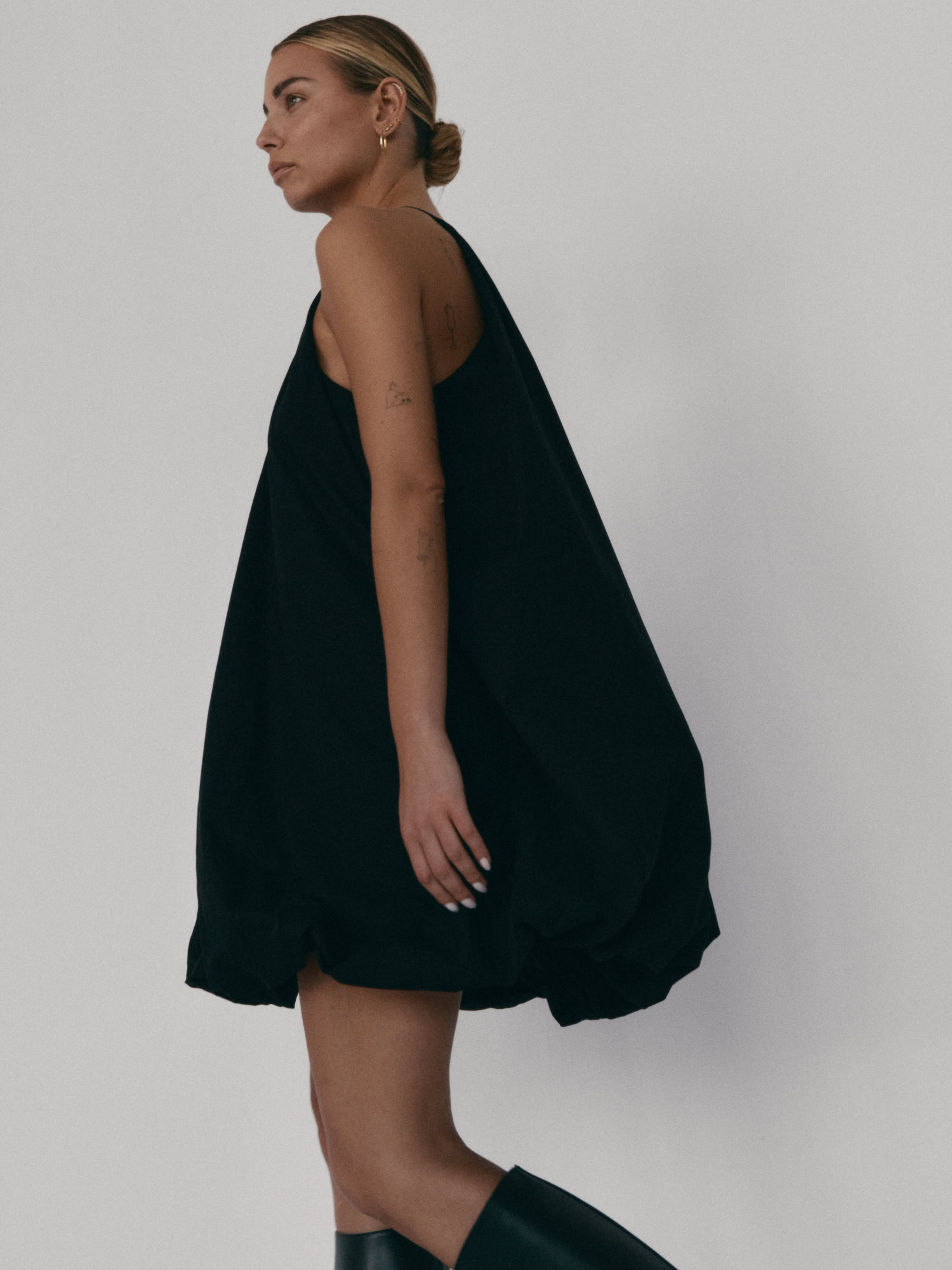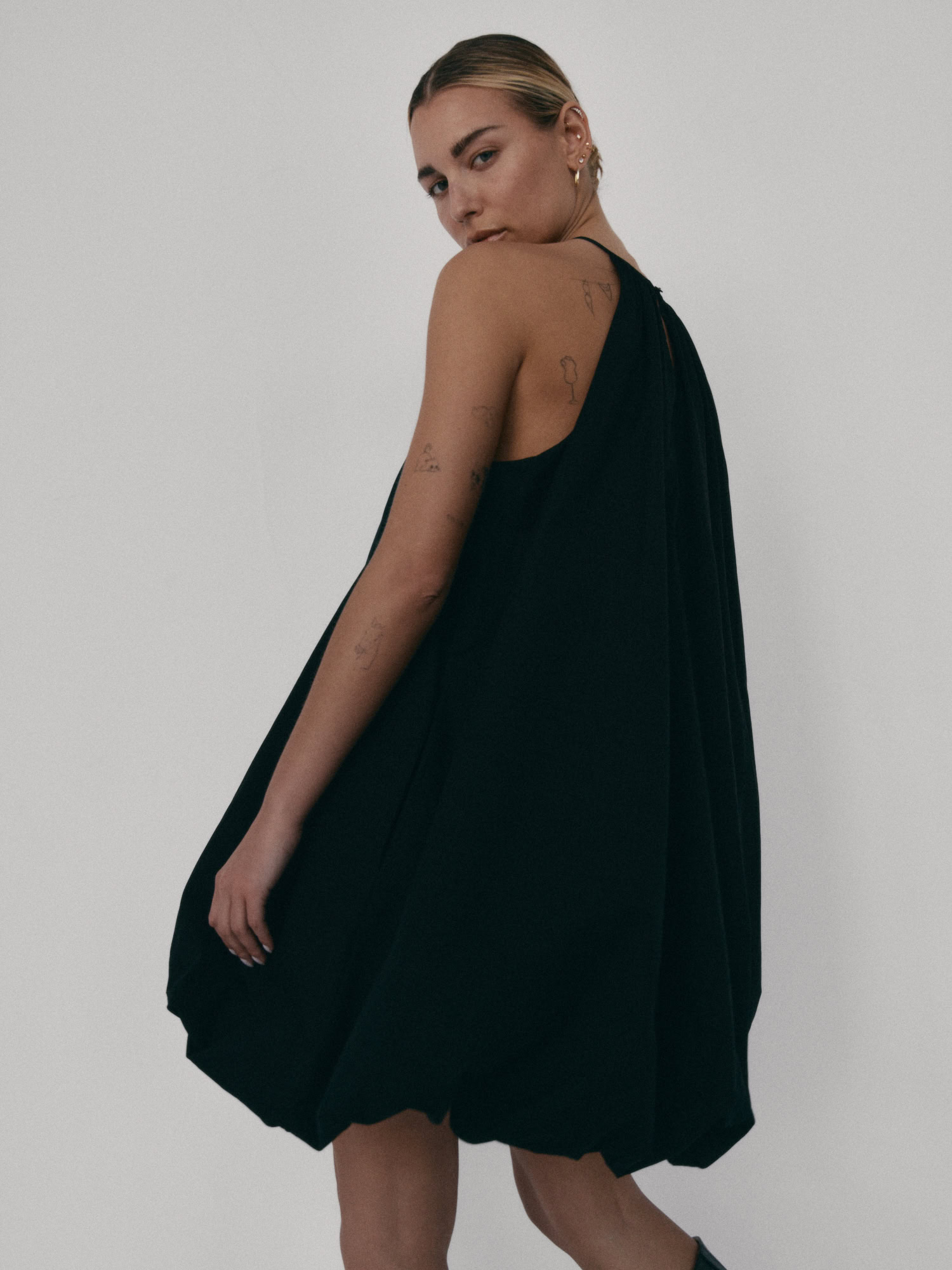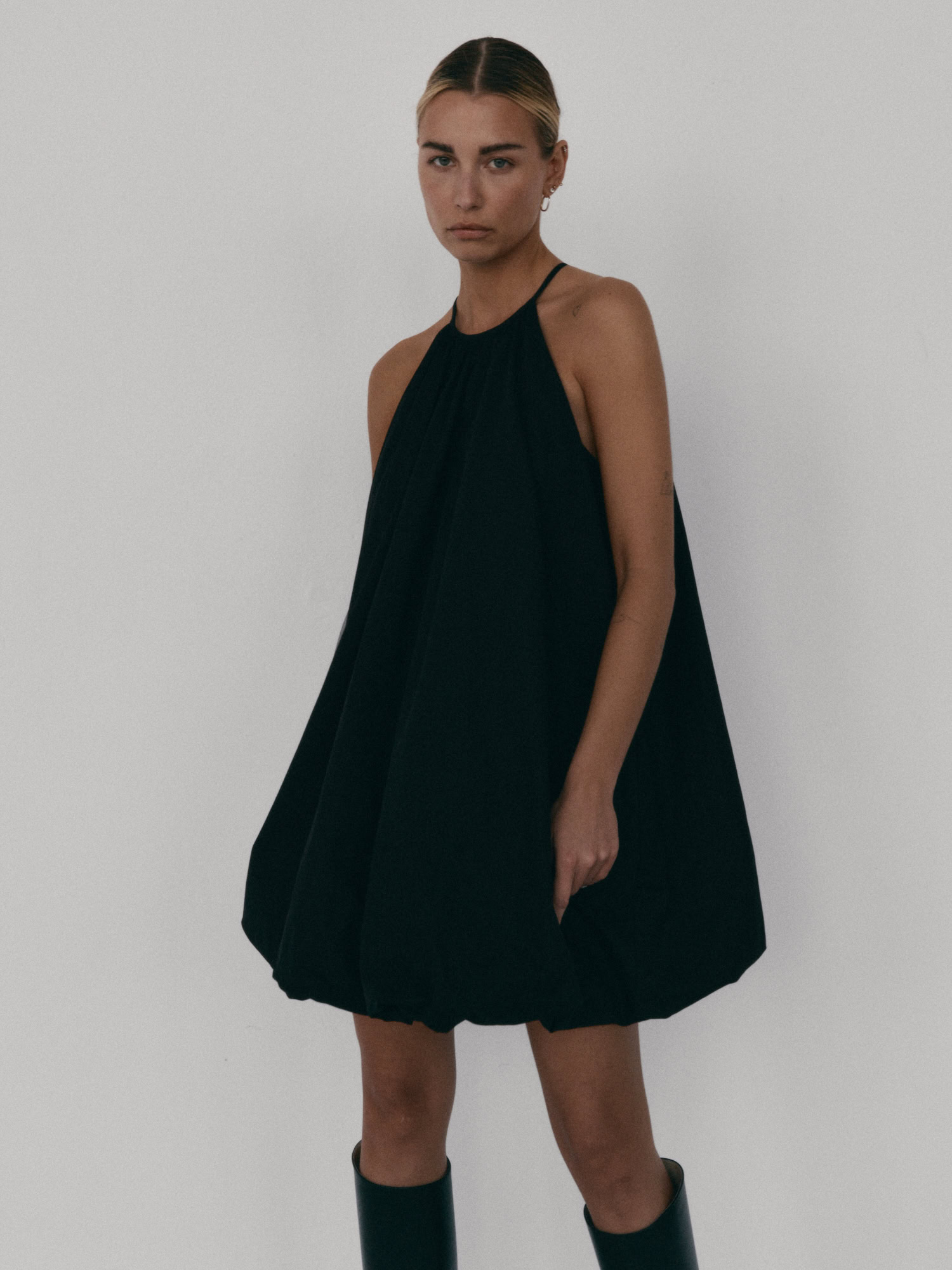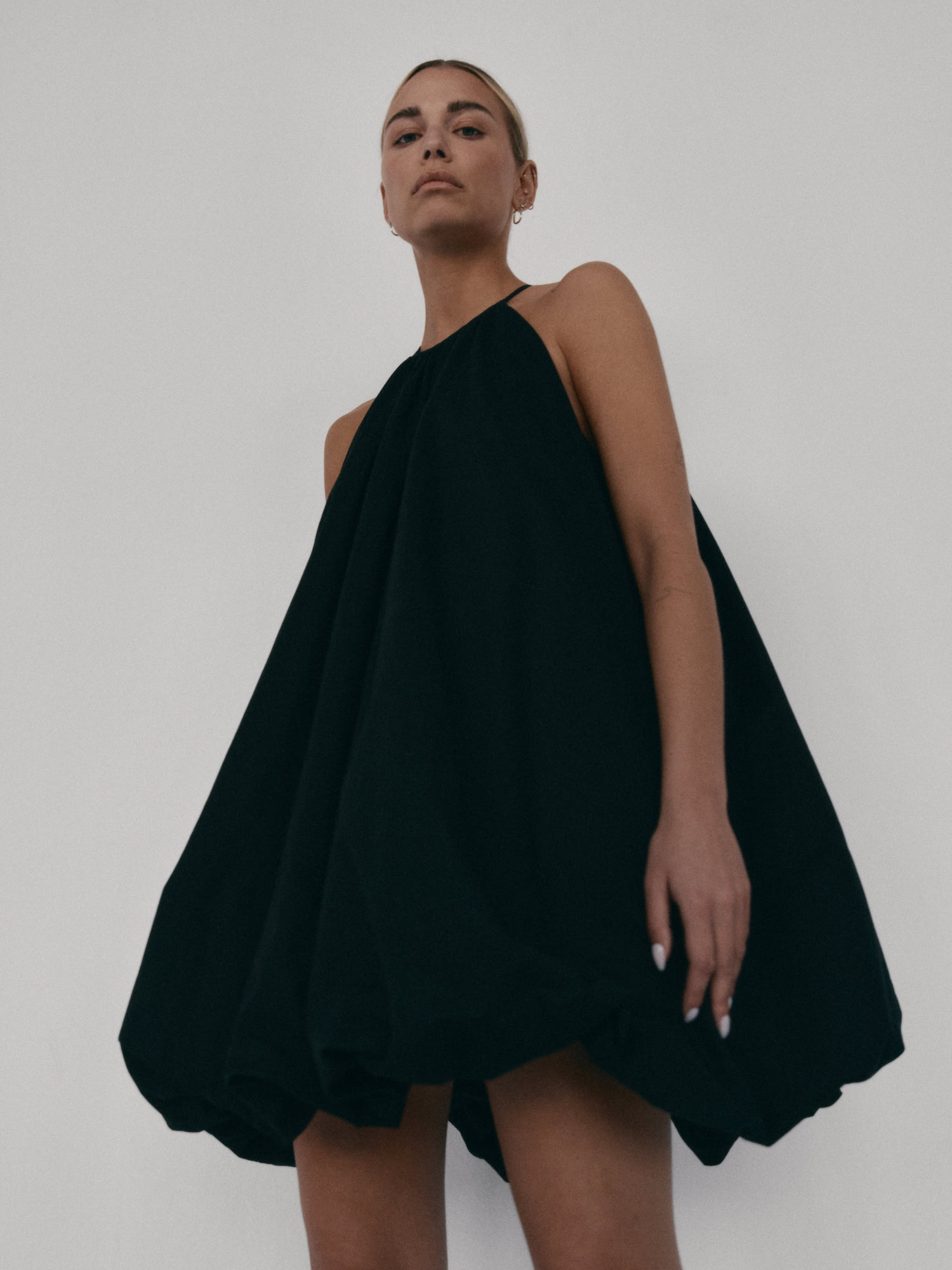 Krótka sukienka o kroju bombki. Sukienka wykończona jest zawiniętym do środka materiałem, co nadaje jej unikalny kształt. Model posiada funkcjonalne kieszenie oraz wysoki dekolt zapinany z tyłu na guzik. Oversize’owy krój pozwala ukryć mankamenty sylwetki.