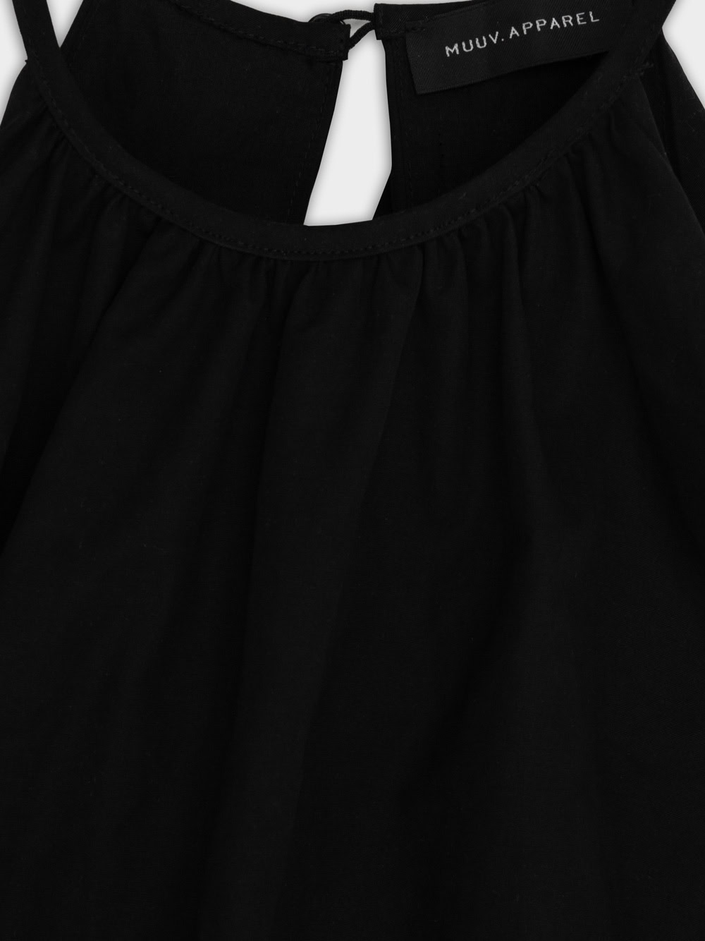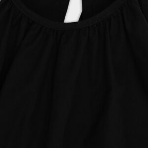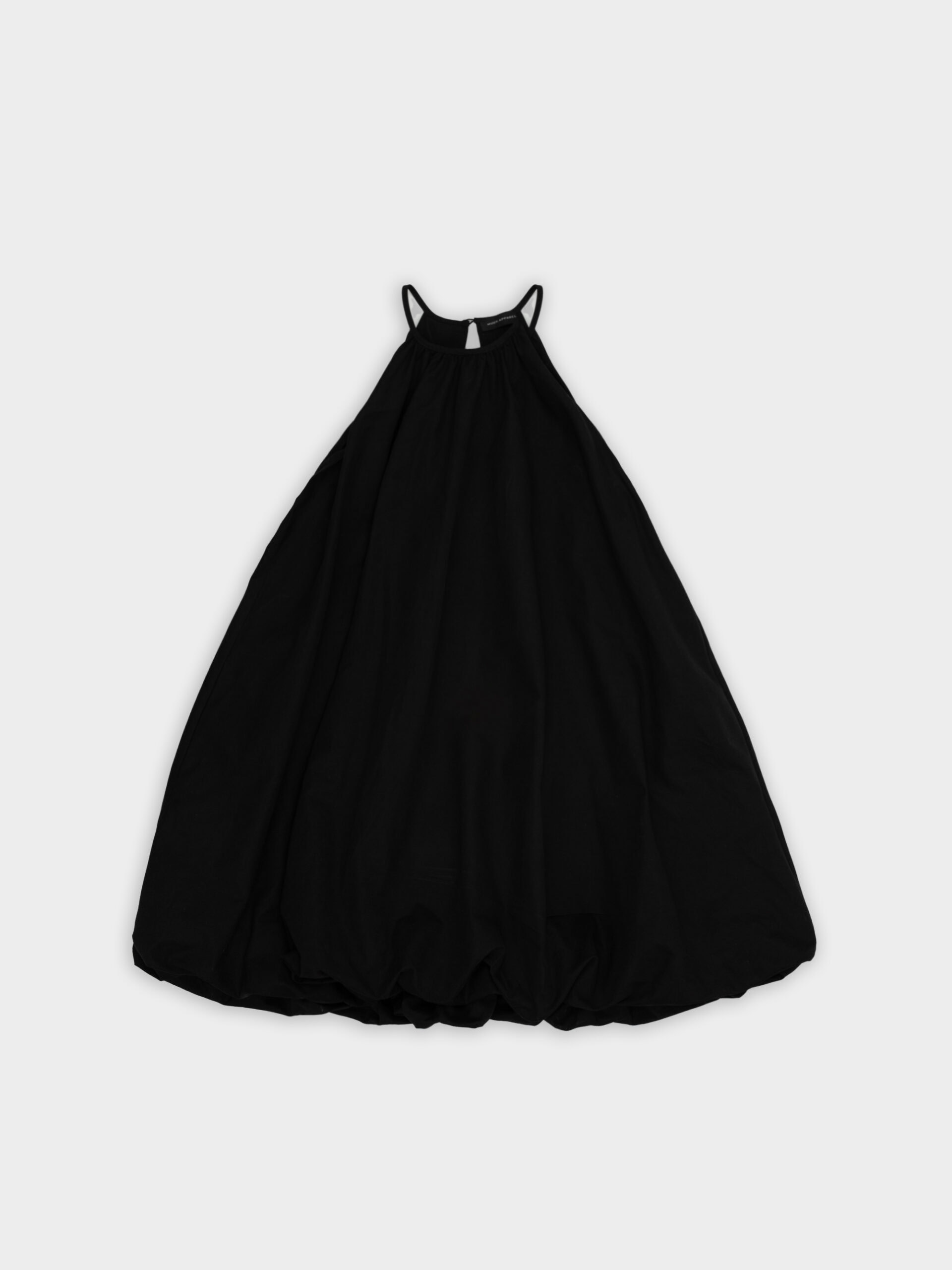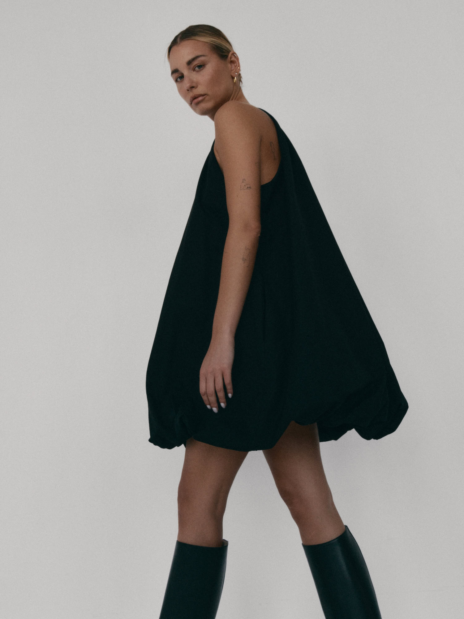 Krótka sukienka o kroju bombki. Sukienka wykończona jest zawiniętym do środka materiałem, co nadaje jej unikalny kształt. Model posiada funkcjonalne kieszenie oraz wysoki dekolt zapinany z tyłu na guzik. Oversize’owy krój pozwala ukryć mankamenty sylwetki.