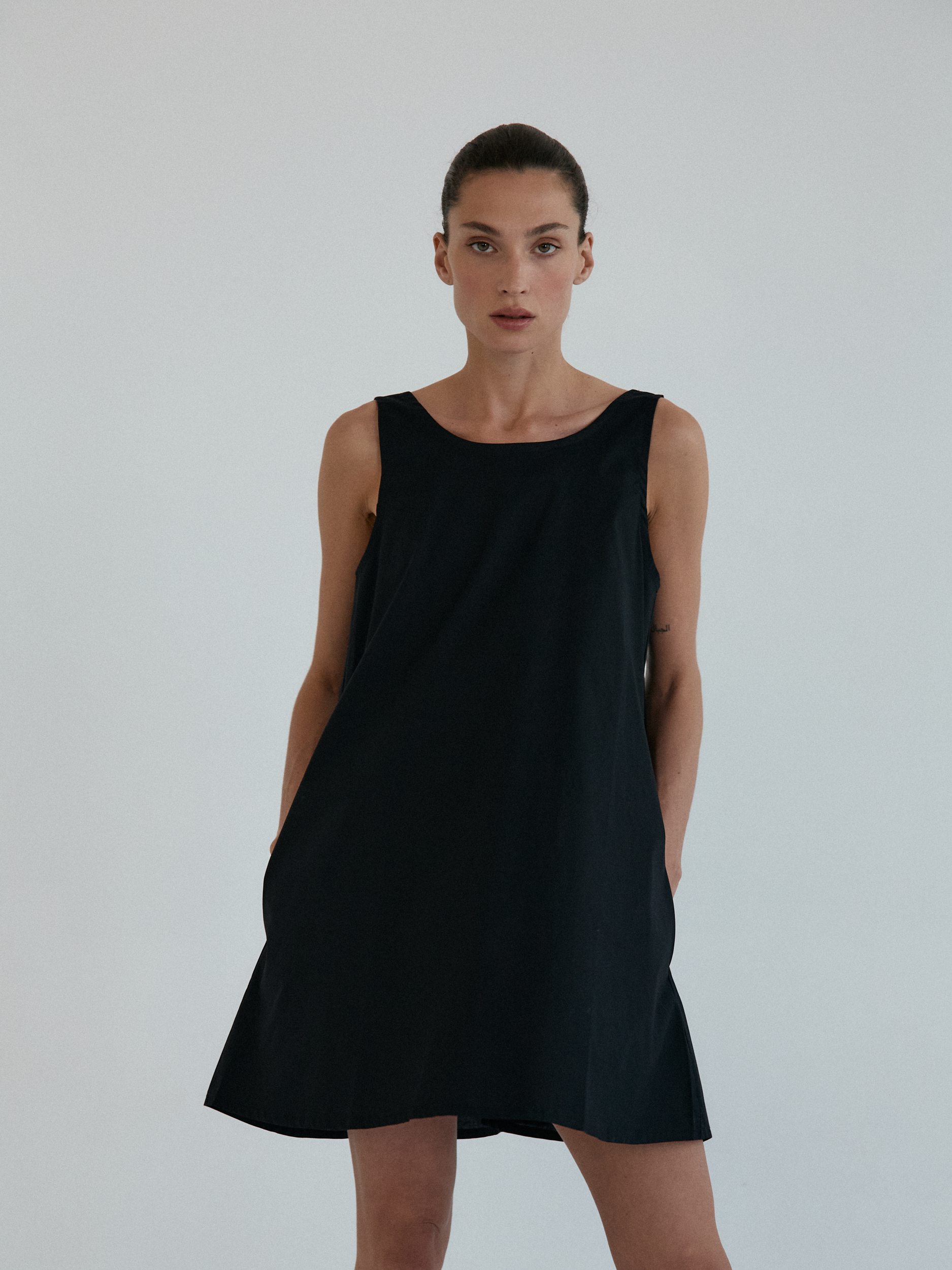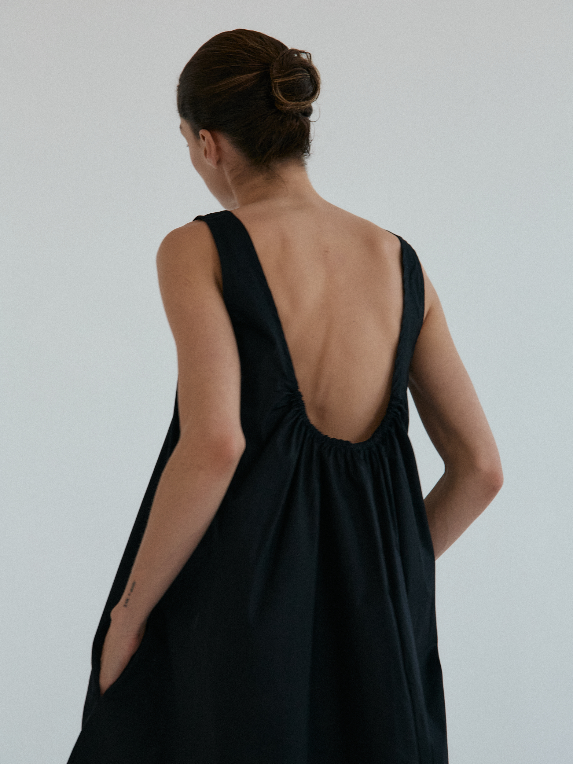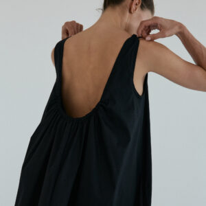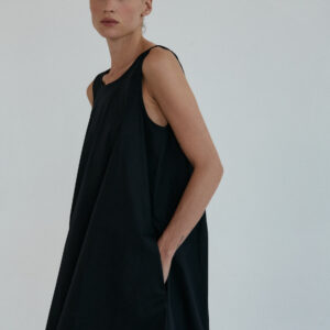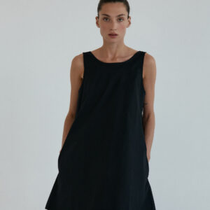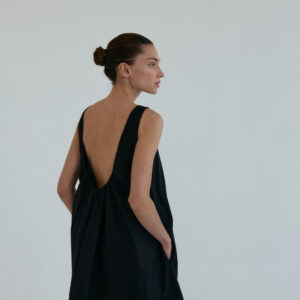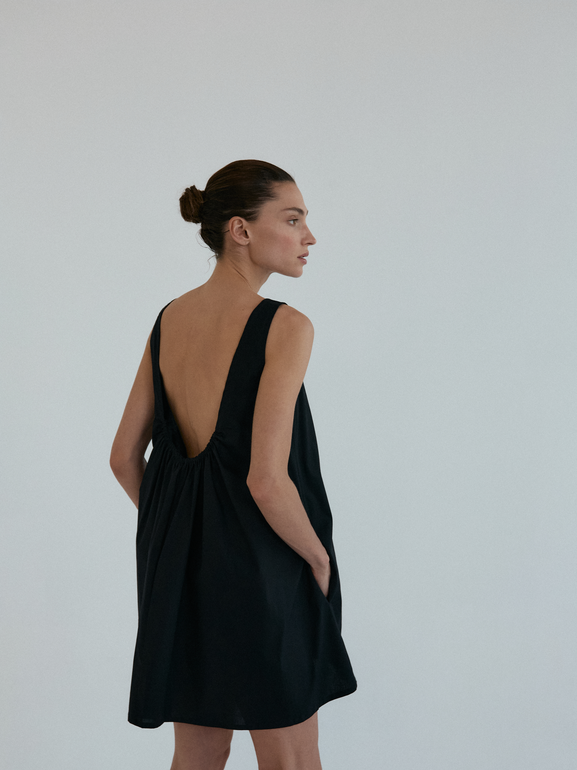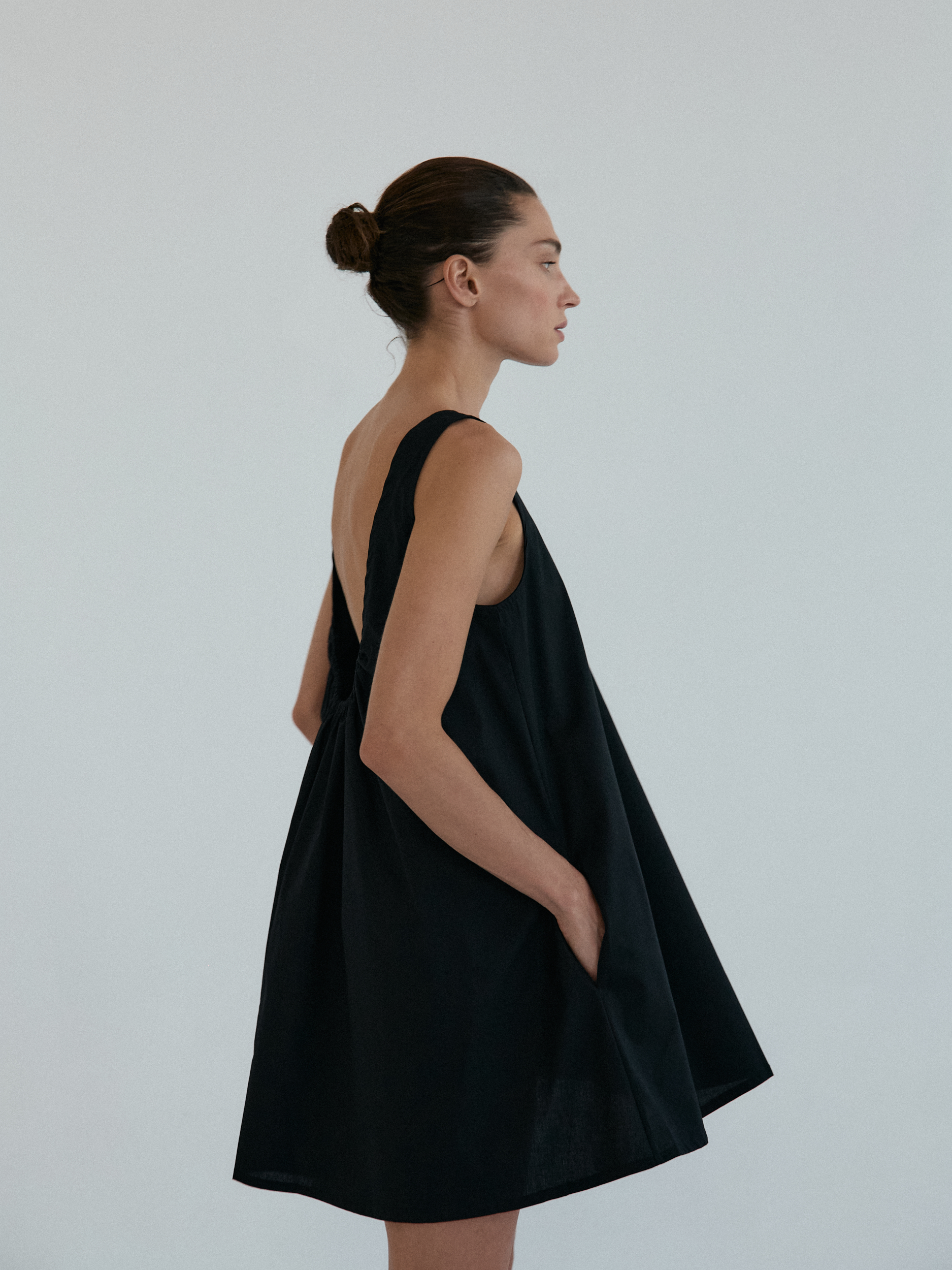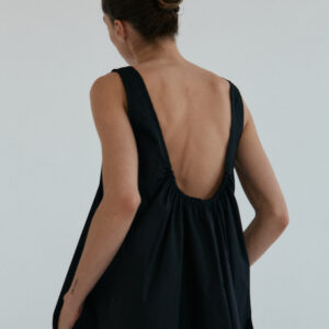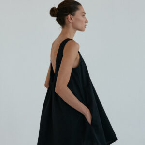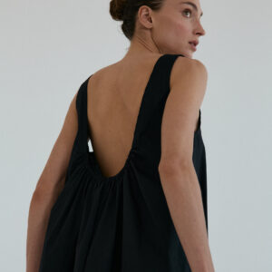 Krótka sukienka na grubszych ramiączkach o kroju oversize. Z przodu minimalistyczny dekolt, z tyłu niesamowicie głębokie wycięcie w kształcie litery U, z wszytą delikatną gumką dopełniającą całości. Produkt założony na gołe ciało doskonale podkreśla linię pleców. Dzięki specjalnej konstrukcji sukienka nie spada z ramion. Z przodu dwie głębokie kieszenie ukryte w bocznym szwie. Pasuje do każdego rodzaju obuwia. Doskonale sprawdzi się zarówno na co dzień do pracy, jak i wieczorne wyjście.