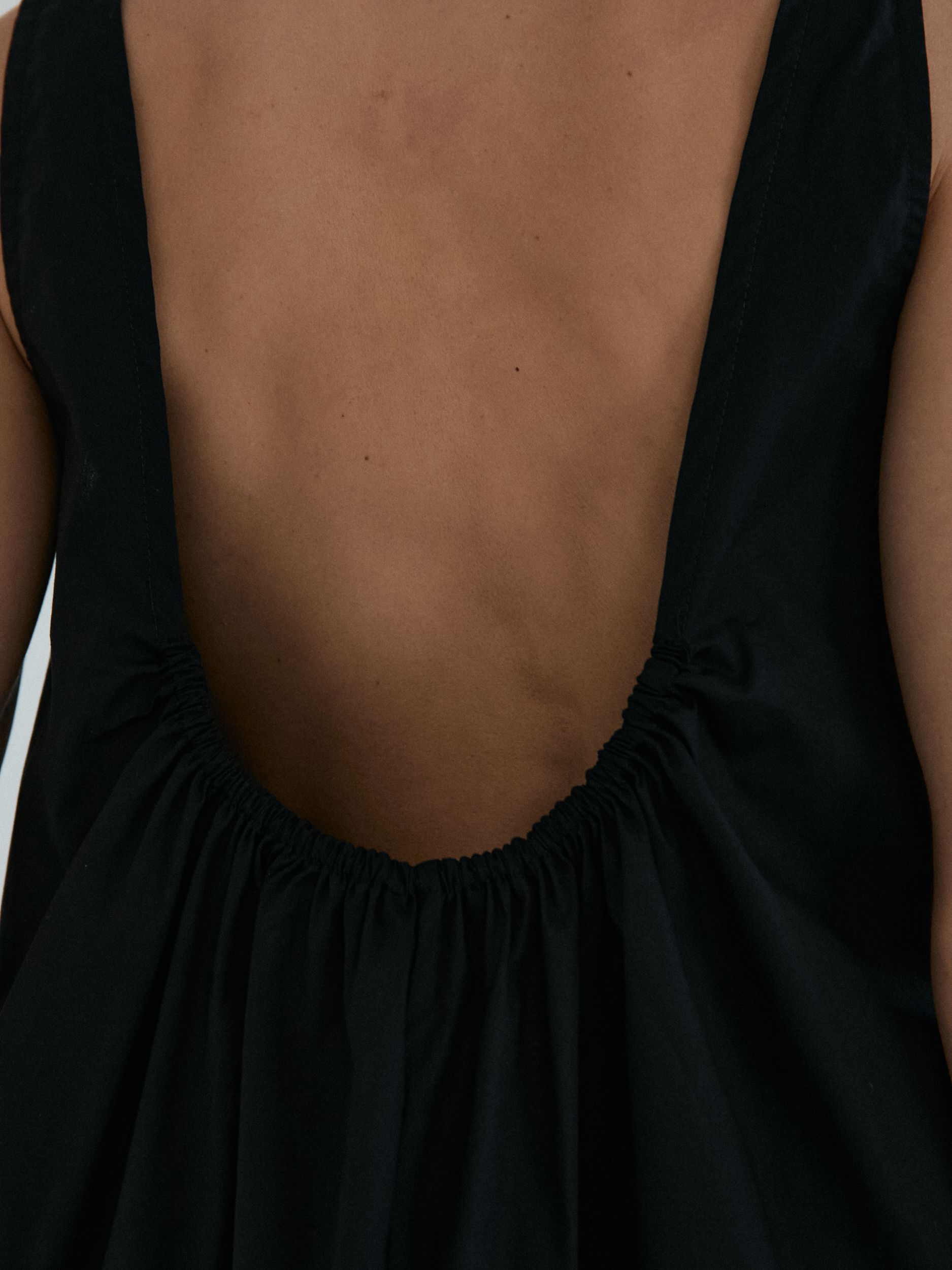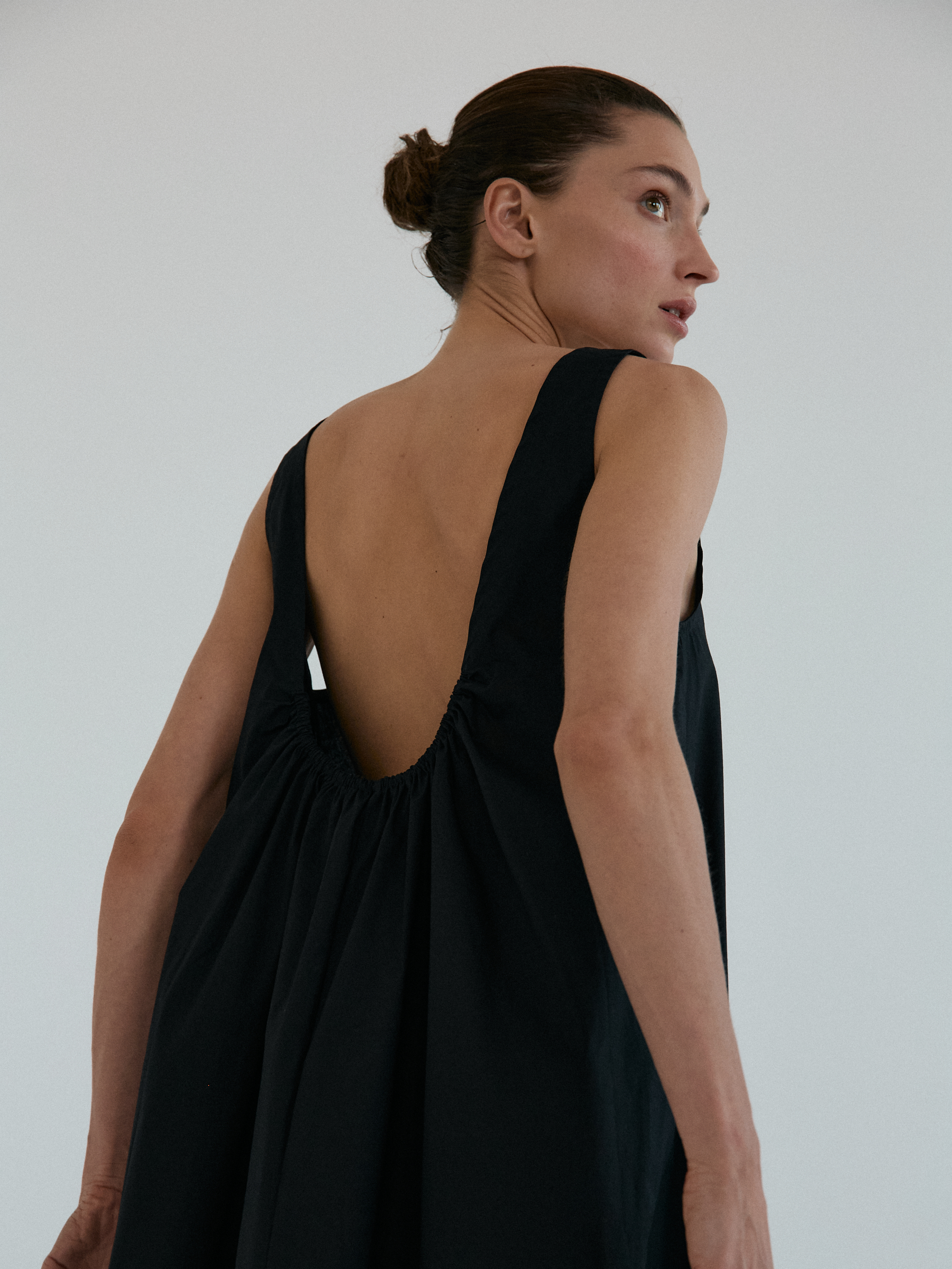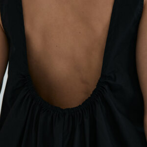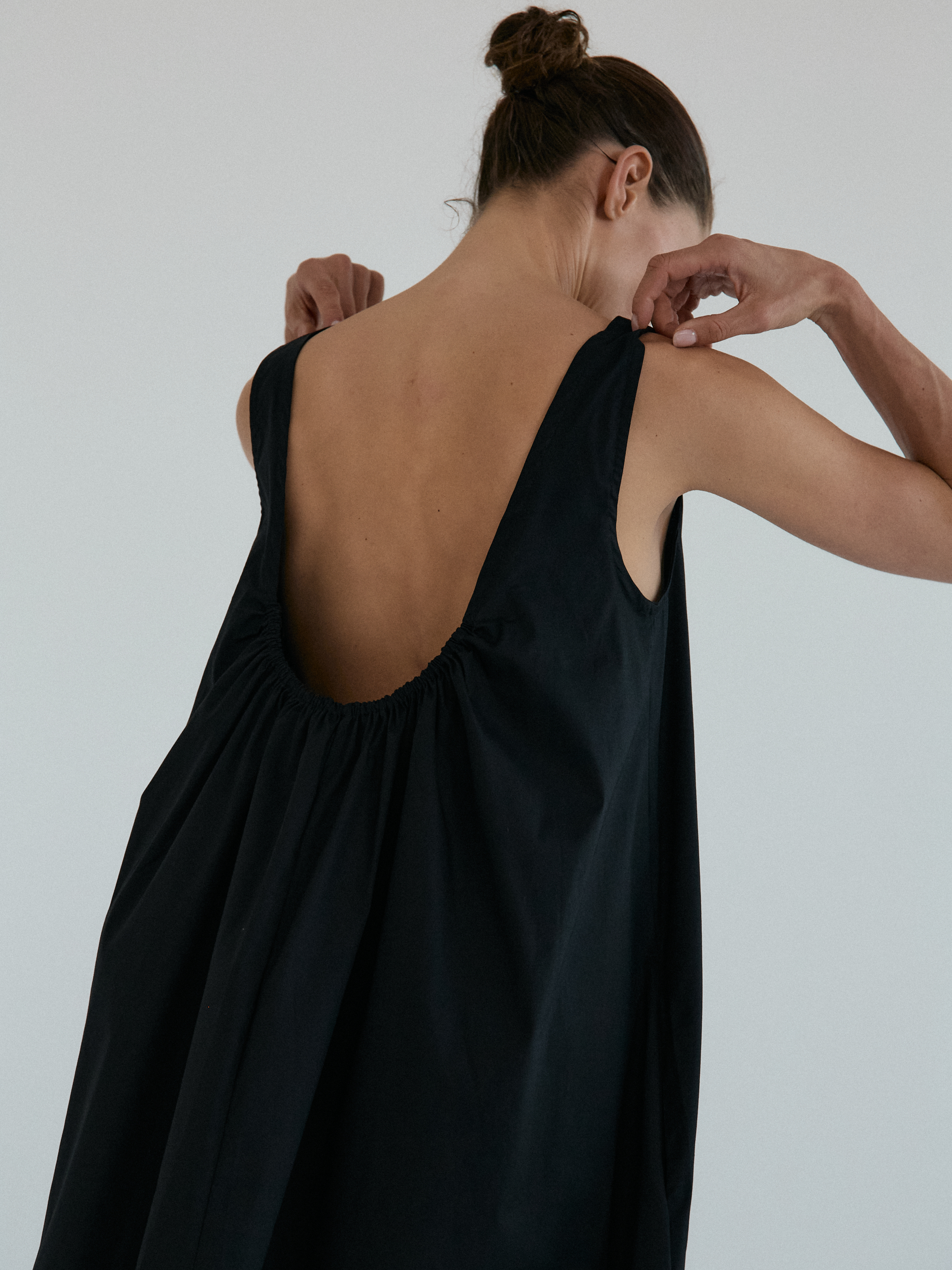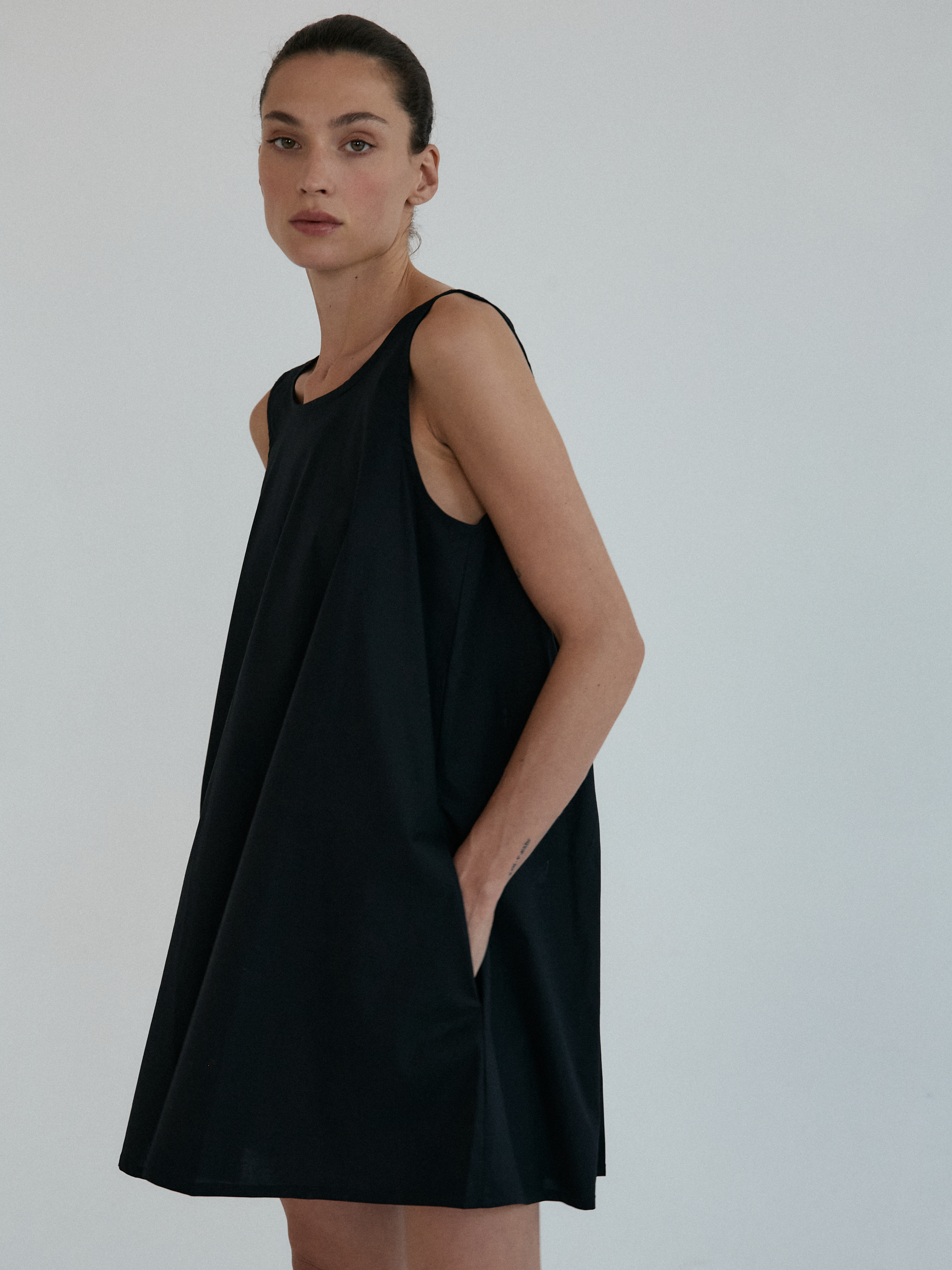 Krótka sukienka na grubszych ramiączkach o kroju oversize. Z przodu minimalistyczny dekolt, z tyłu niesamowicie głębokie wycięcie w kształcie litery U, z wszytą delikatną gumką dopełniającą całości. Produkt założony na gołe ciało doskonale podkreśla linię pleców. Dzięki specjalnej konstrukcji sukienka nie spada z ramion. Z przodu dwie głębokie kieszenie ukryte w bocznym szwie. Pasuje do każdego rodzaju obuwia. Doskonale sprawdzi się zarówno na co dzień do pracy, jak i wieczorne wyjście.