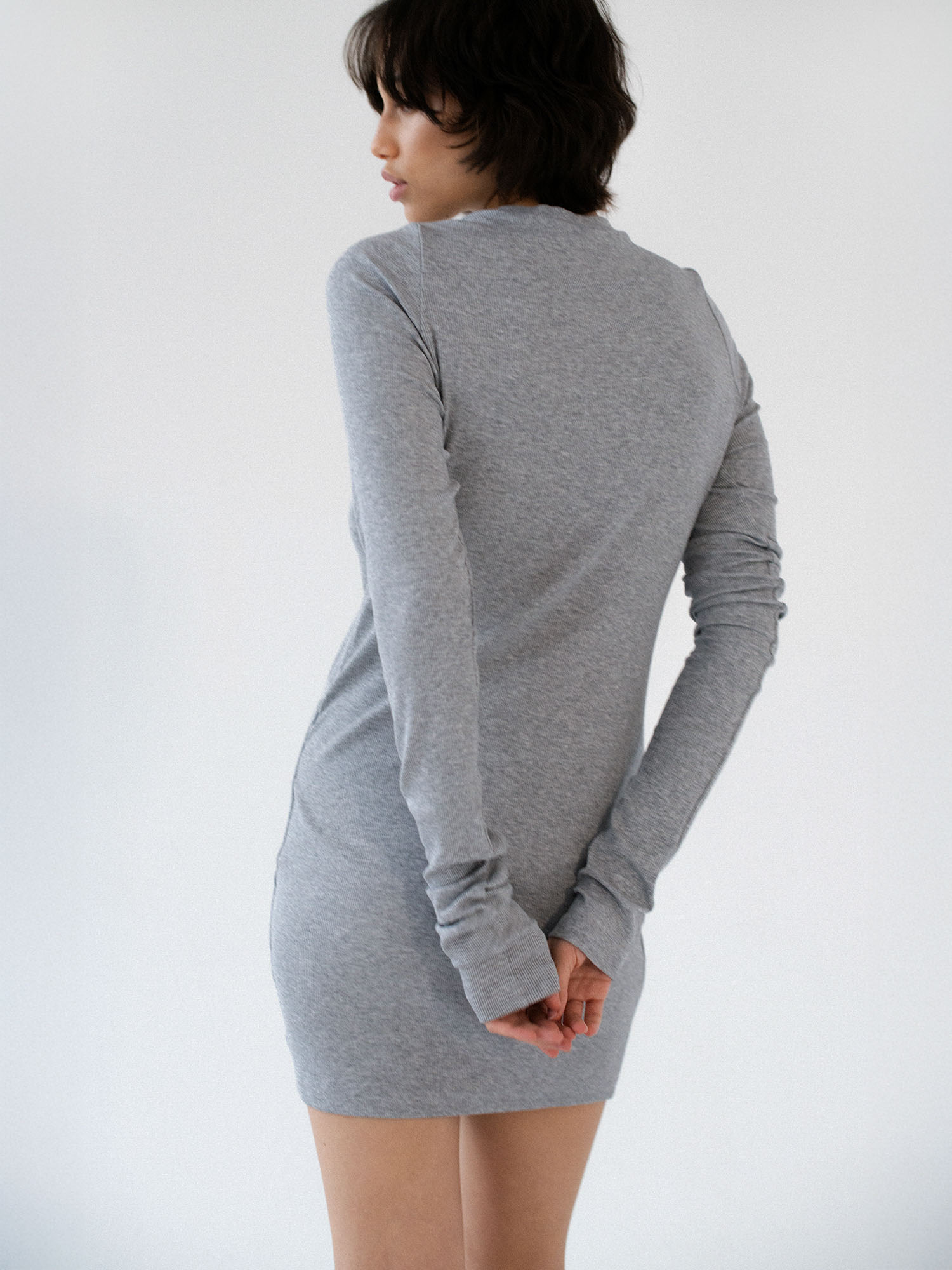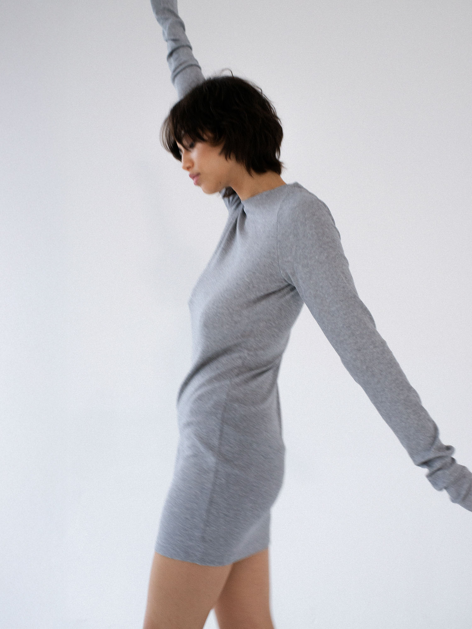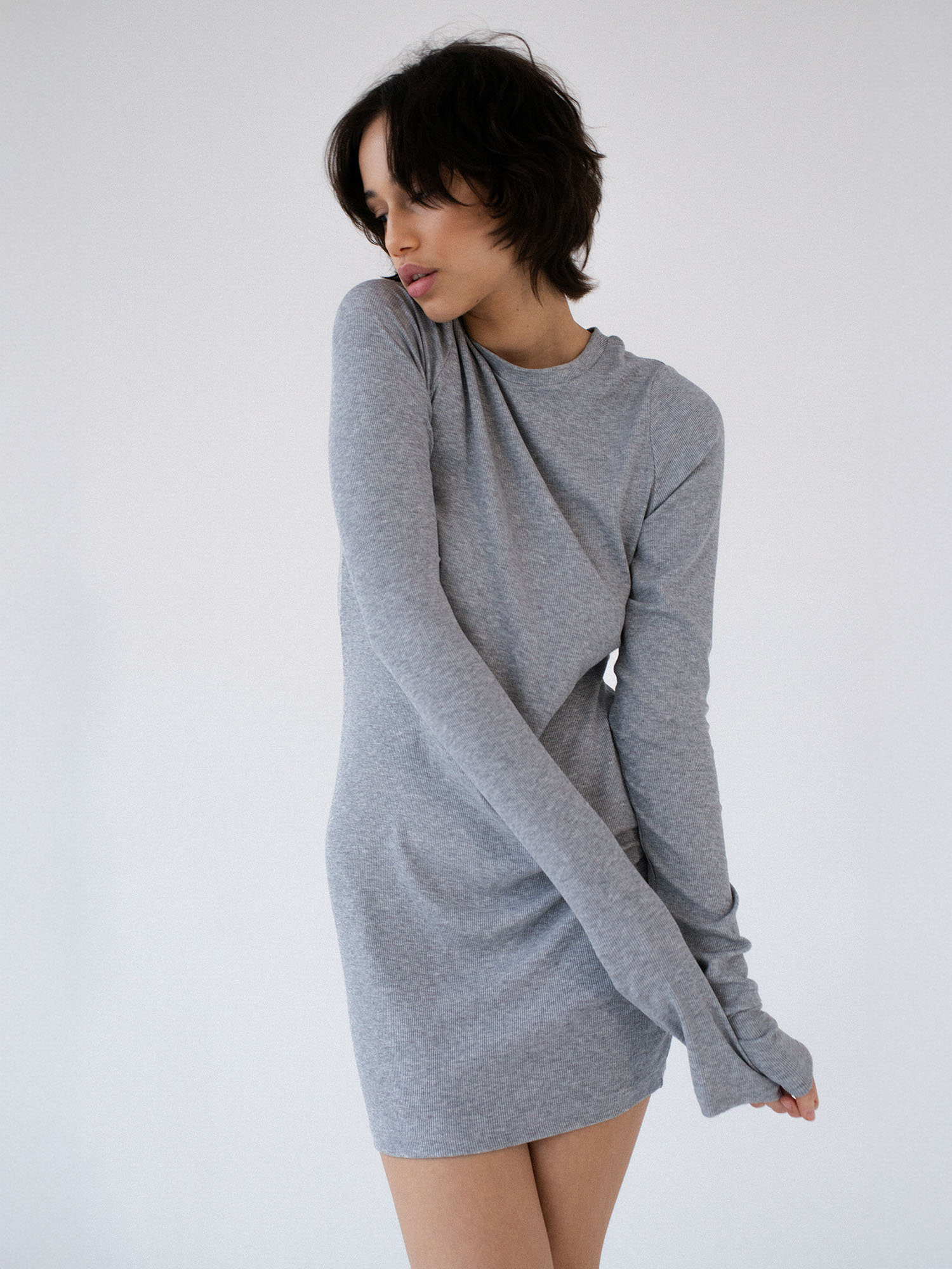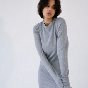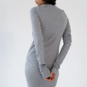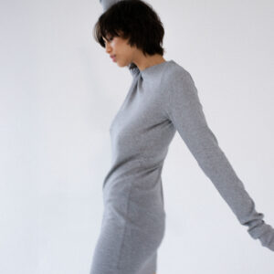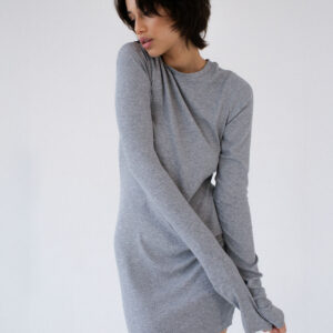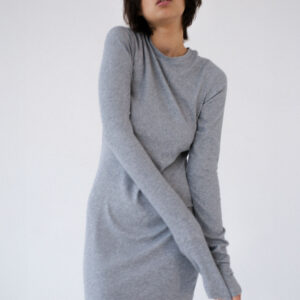 Dopasowana, ale jednocześnie delikatnie luźna, sukienka o klasycznym i minimalistycznym kroju. Uszyta z elastycznej dzianiny o wyraźnie prążkowanej strukturze. Sukienka kończy się zaraz za linią pośladków. Posiada lekko zabudowany dekolt Pięknie podkreśla sylwetkę, lekko do niej przylegając.