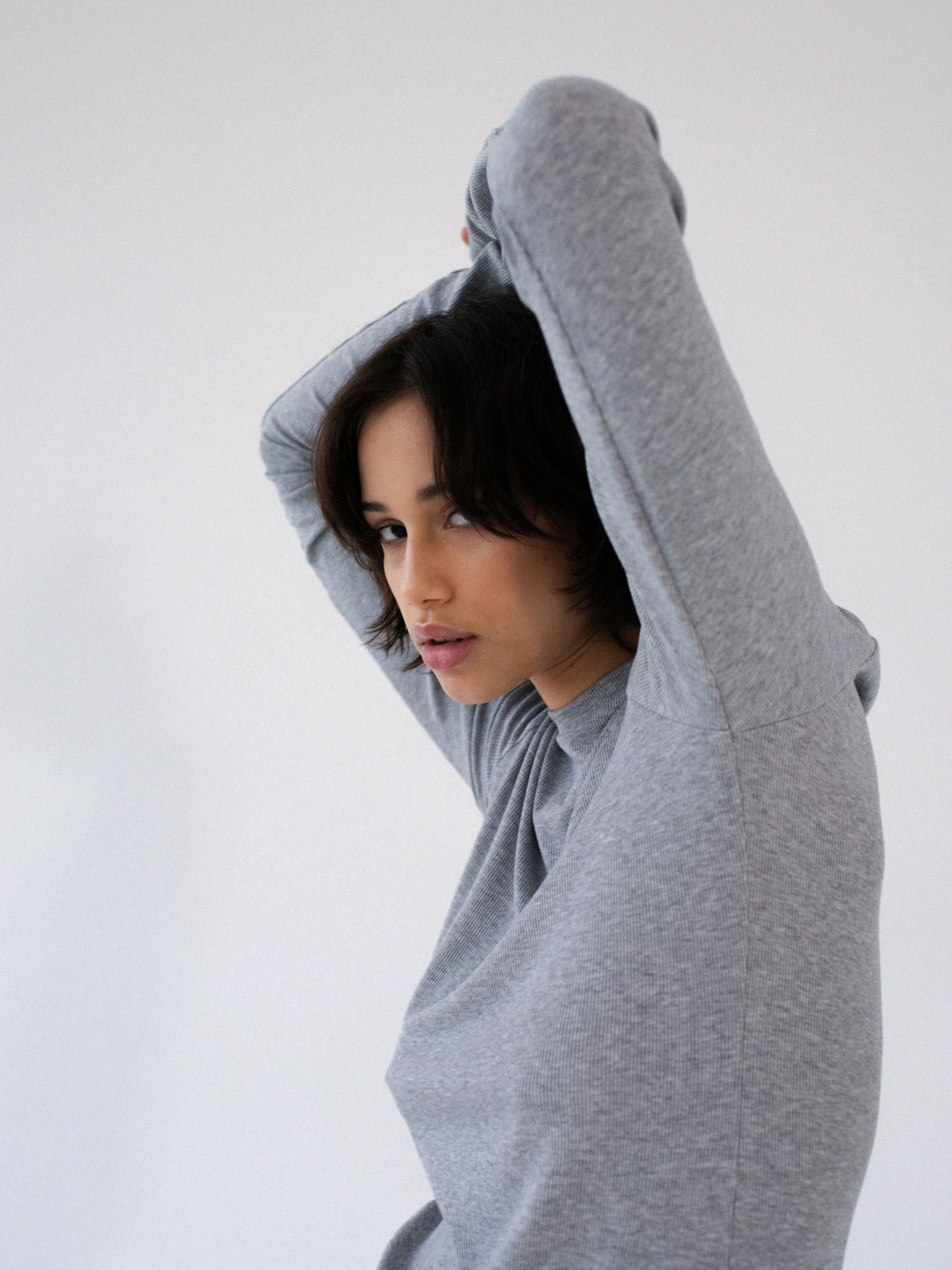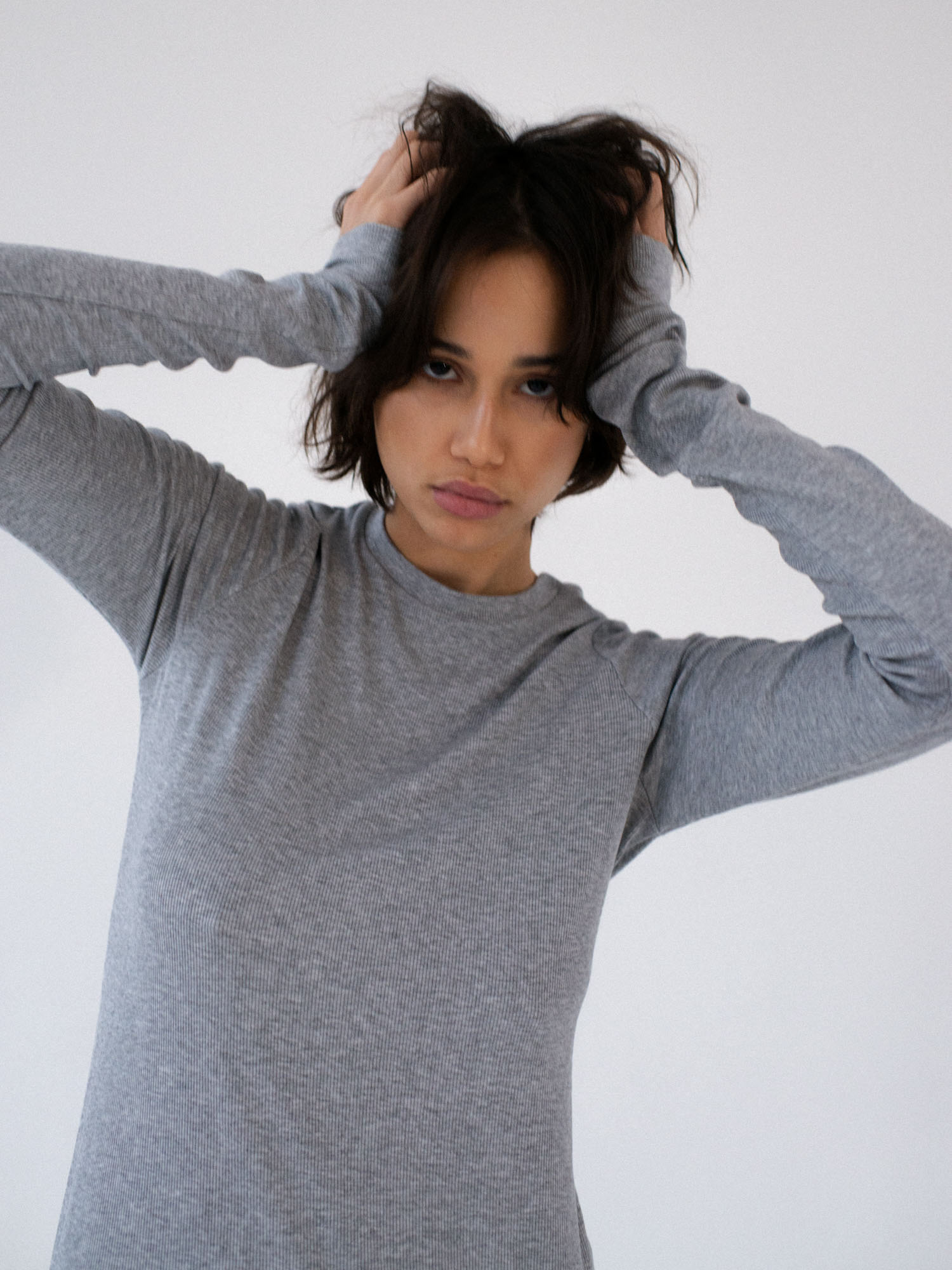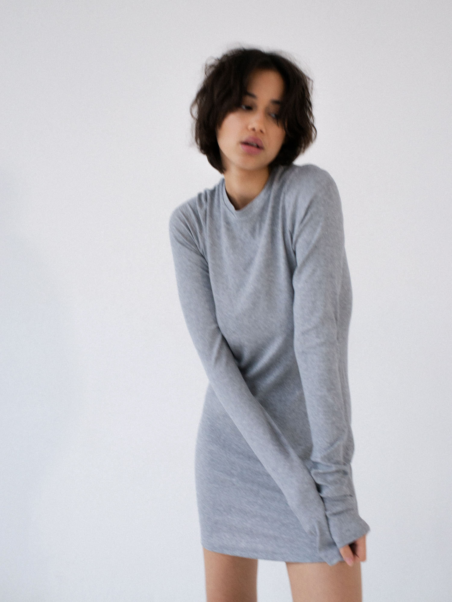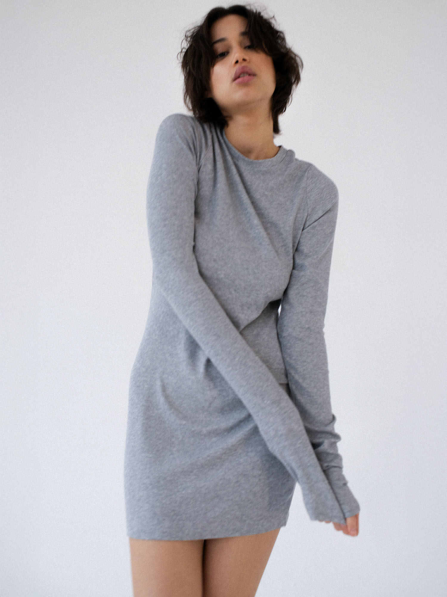 Dopasowana, ale jednocześnie delikatnie luźna, sukienka o klasycznym i minimalistycznym kroju. Uszyta z elastycznej dzianiny o wyraźnie prążkowanej strukturze. Sukienka kończy się zaraz za linią pośladków. Posiada lekko zabudowany dekolt Pięknie podkreśla sylwetkę, lekko do niej przylegając.