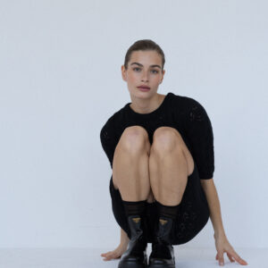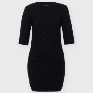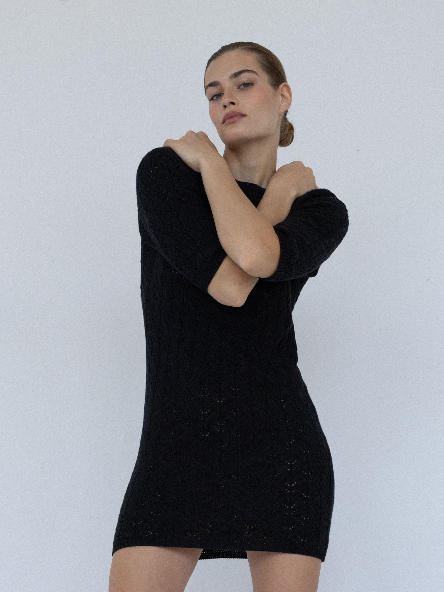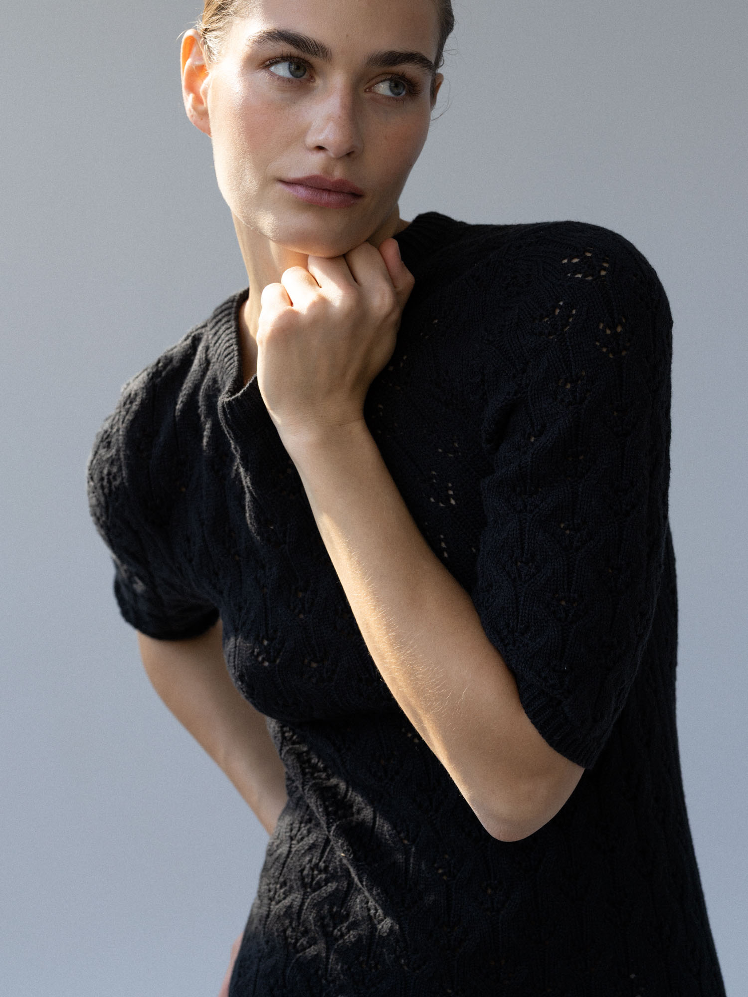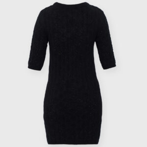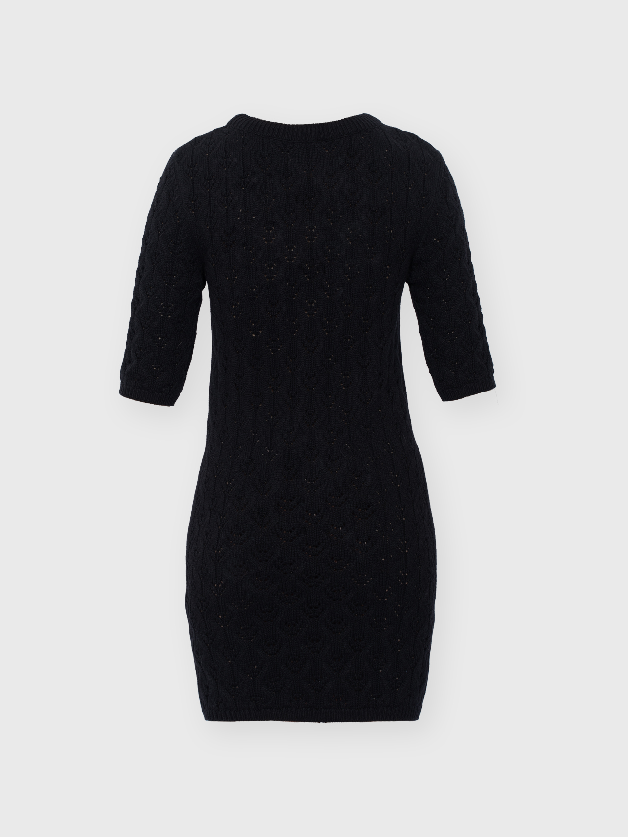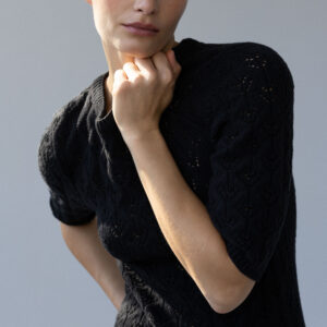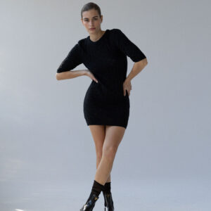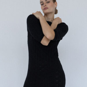 Minimalistyczna sukienka z krótkim rękawem o klasycznym, ponadczasowym kroju. Lekko wytaliowany fason z dopasowanym rękawkiem oraz ściągaczami przy rękawach i szyi subtelnie podkreśla sylwetkę. Ażurowy, lekko prześwitujący splot nadaje jej lekkości i delikatnego charakteru, a elastyczna dzianina naturalnie dopasowuje się do ciała.