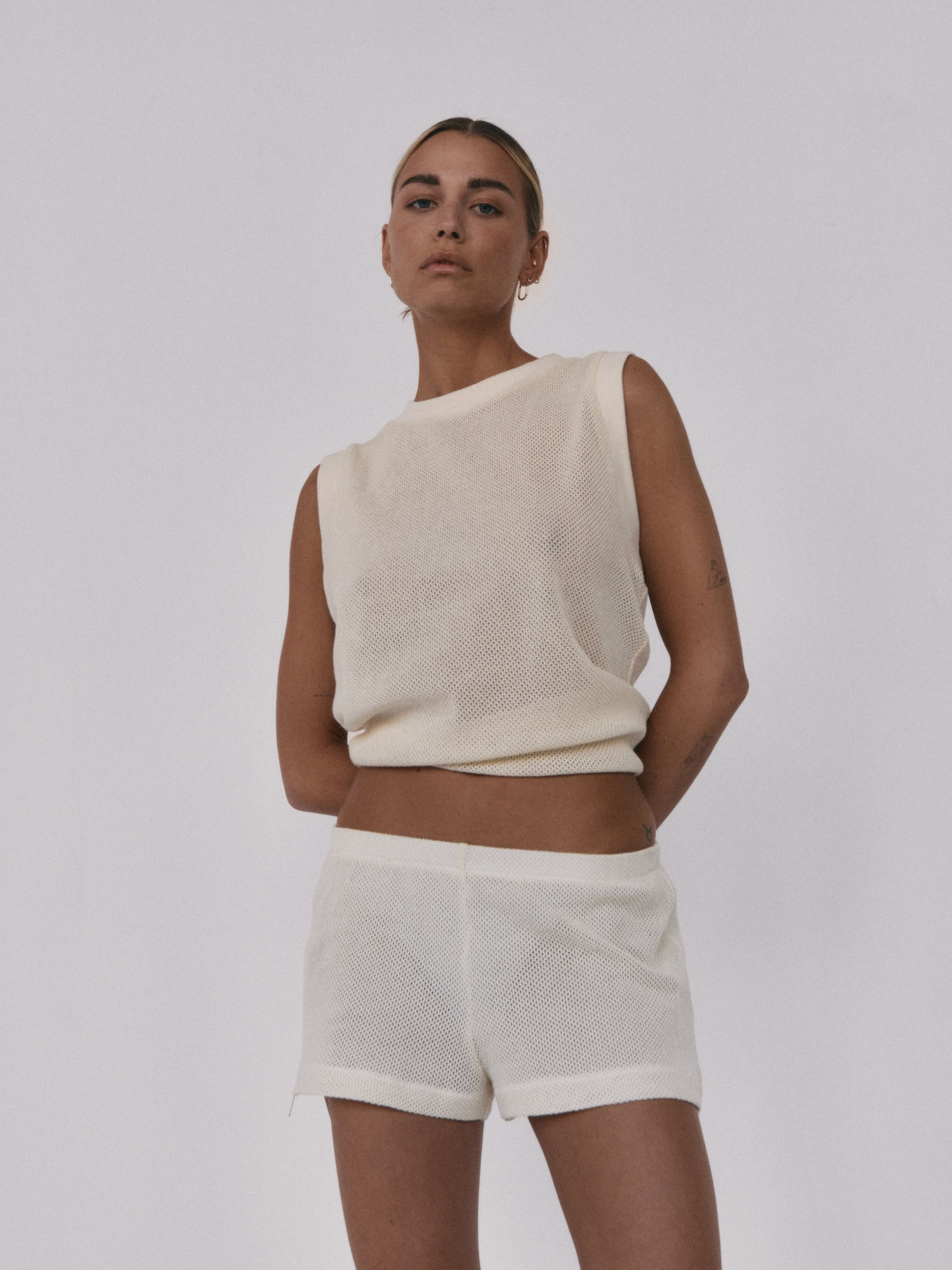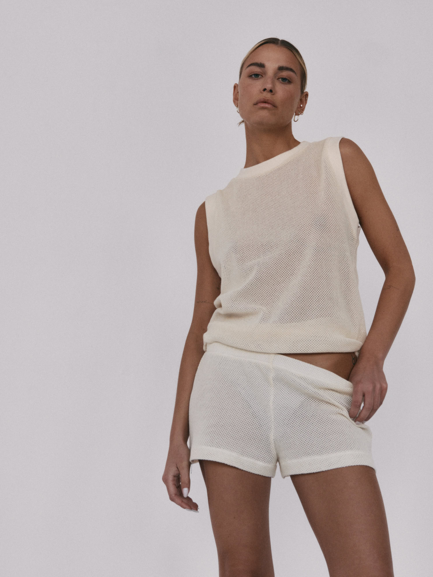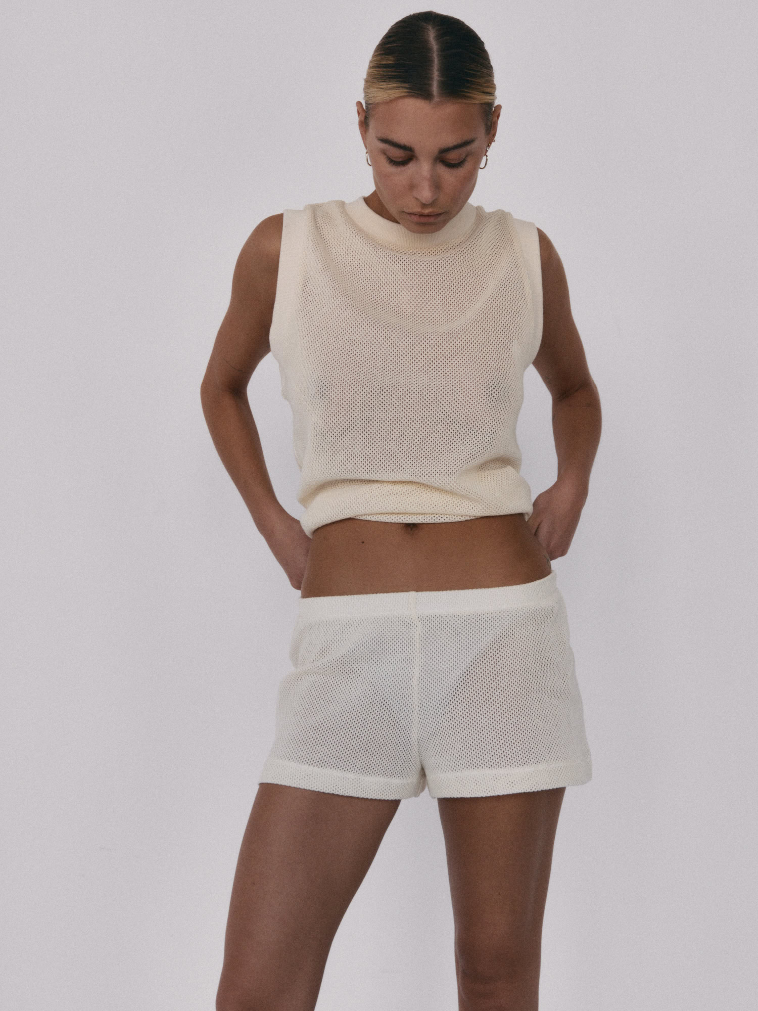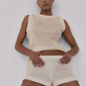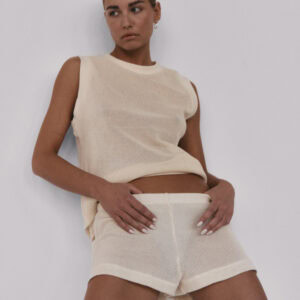 Siateczkowe szorty z niskim stanem. Delikatna guma w pasie dopełnia całości i jednocześnie pozwala na swobodne dopasowanie do sylwetki. Idealnie sprawdzą się w zestawie z kamizelką LLARD w tym samym odcieniu.
