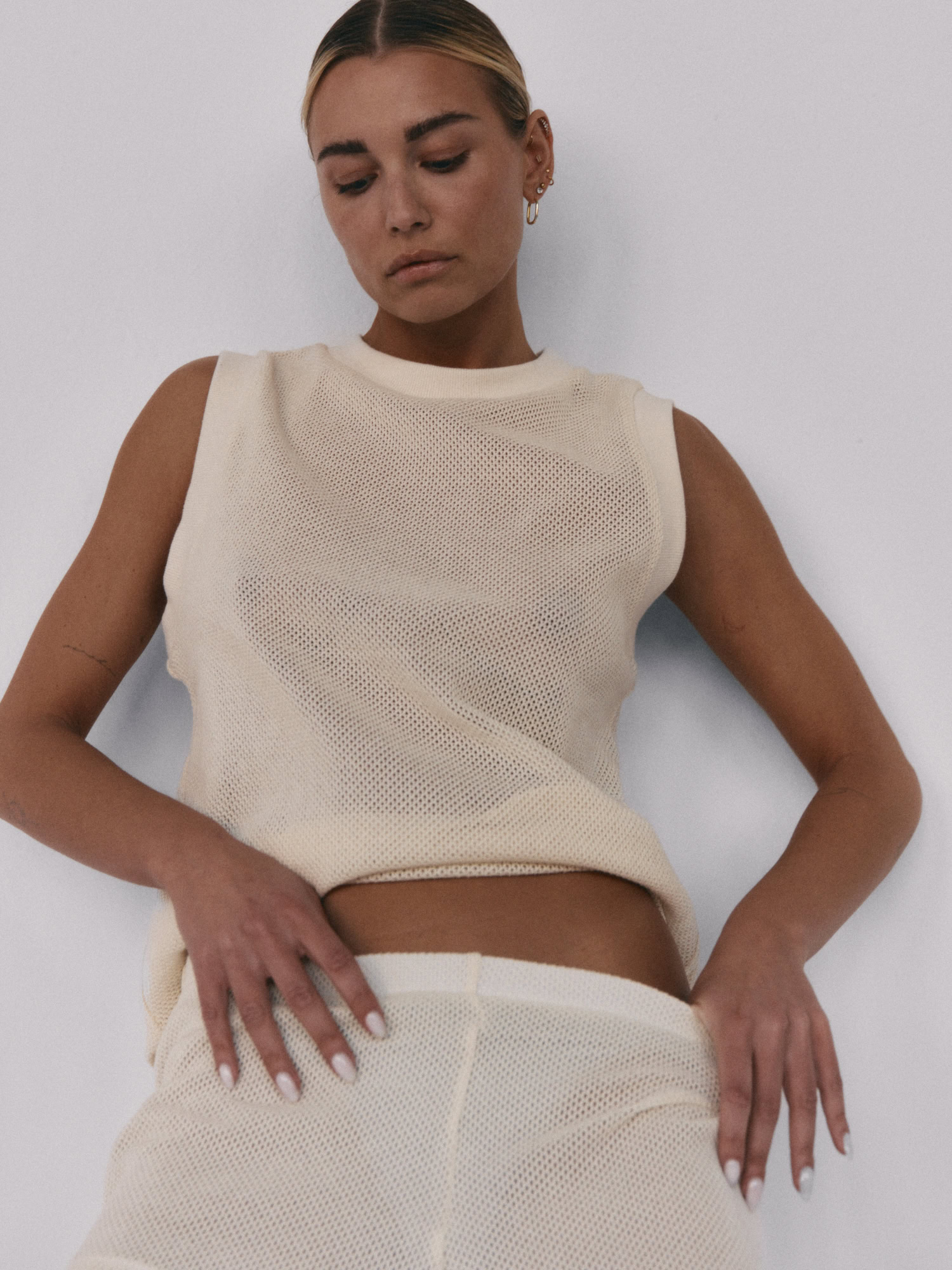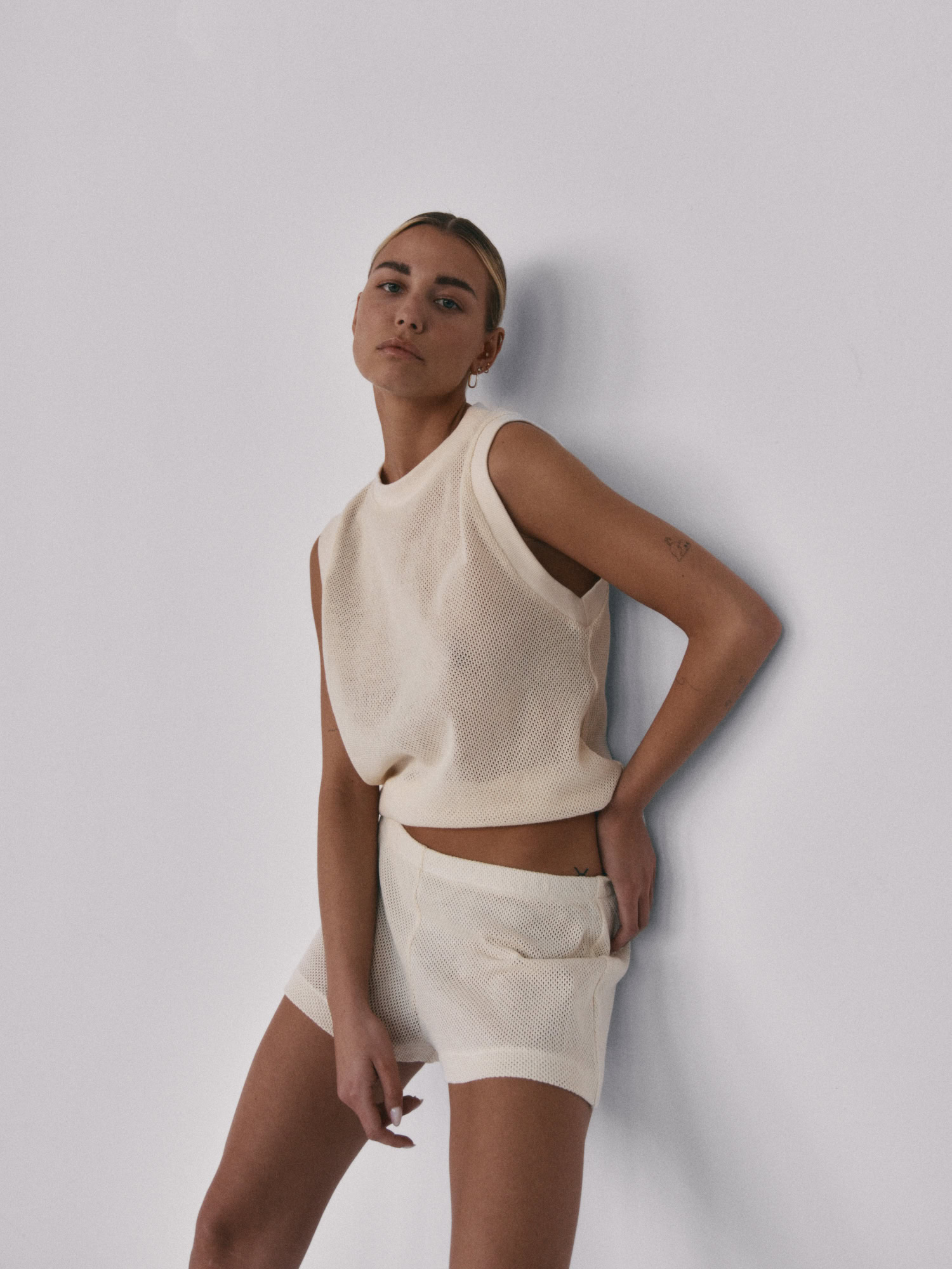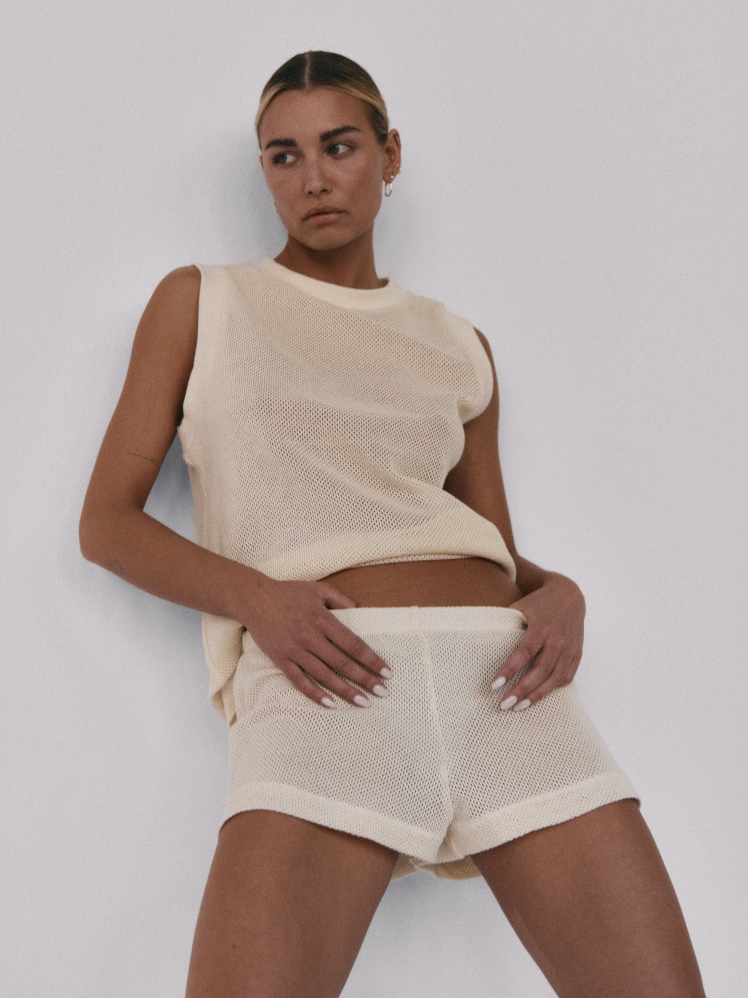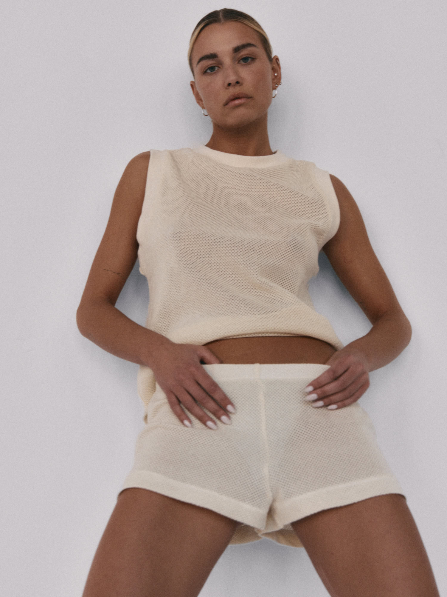 Siateczkowe szorty z niskim stanem. Delikatna guma w pasie dopełnia całości i jednocześnie pozwala na swobodne dopasowanie do sylwetki. Idealnie sprawdzą się w zestawie z kamizelką LLARD w tym samym odcieniu.