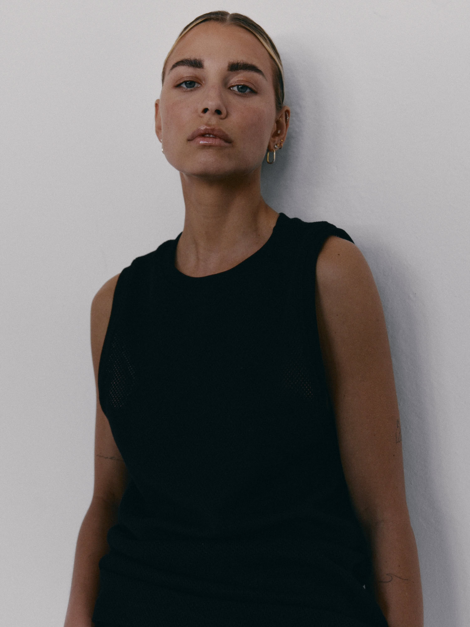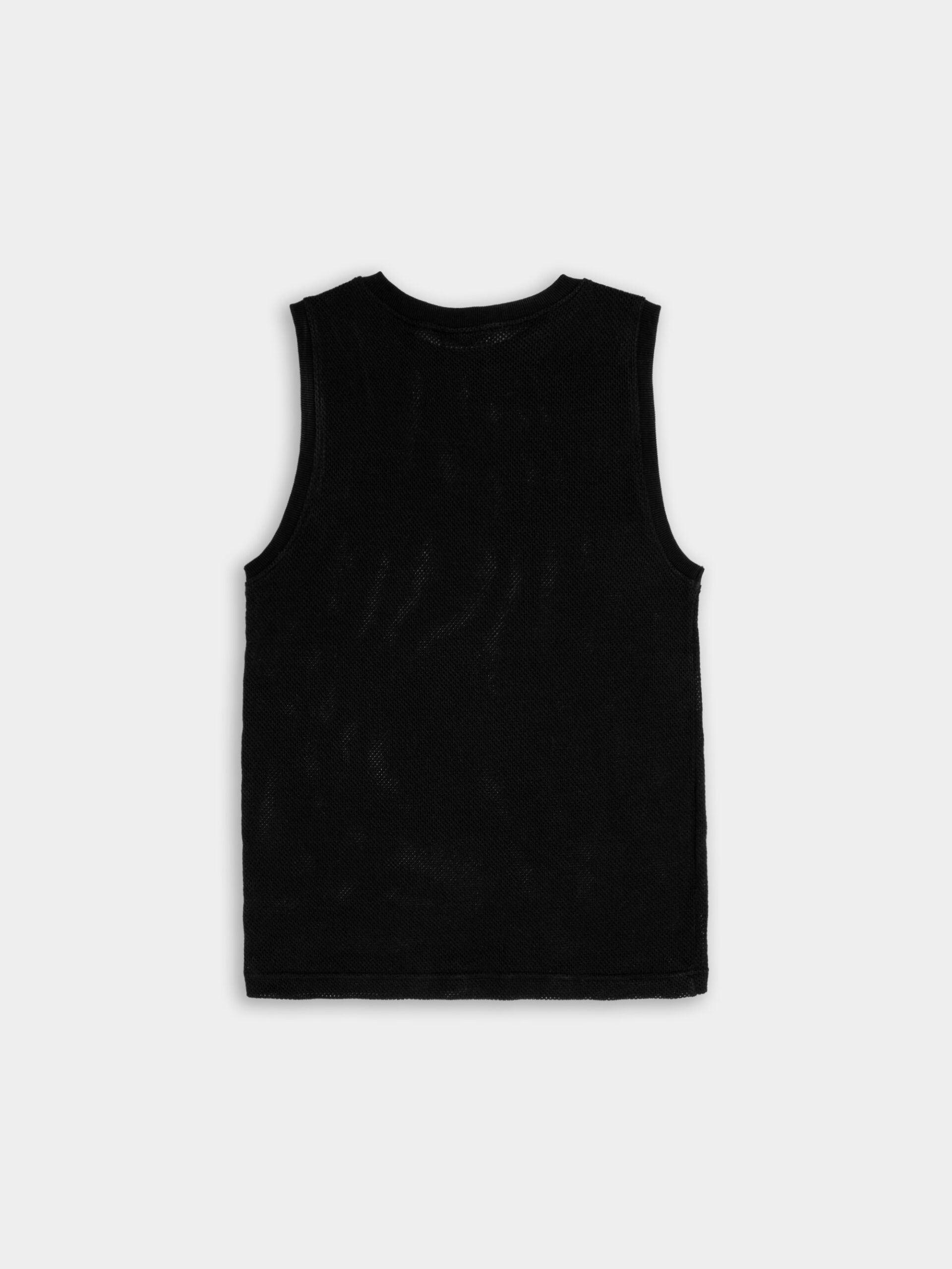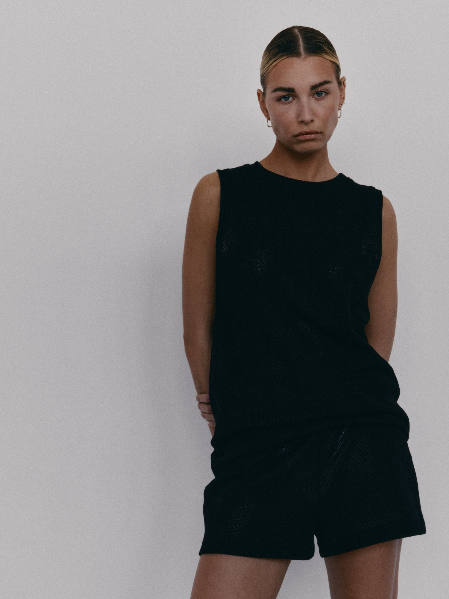 Siateczkowy top typu kamizelka, o luźnym kroju. Dekolt oraz rękawy wykończone ściągaczem. Wygodna i minimalistyczna. Idealnie sprawdzi się w stylizacjach sportowych jak i casualowych. Ze spodenkami LLARD tworzy zestaw doskonały.